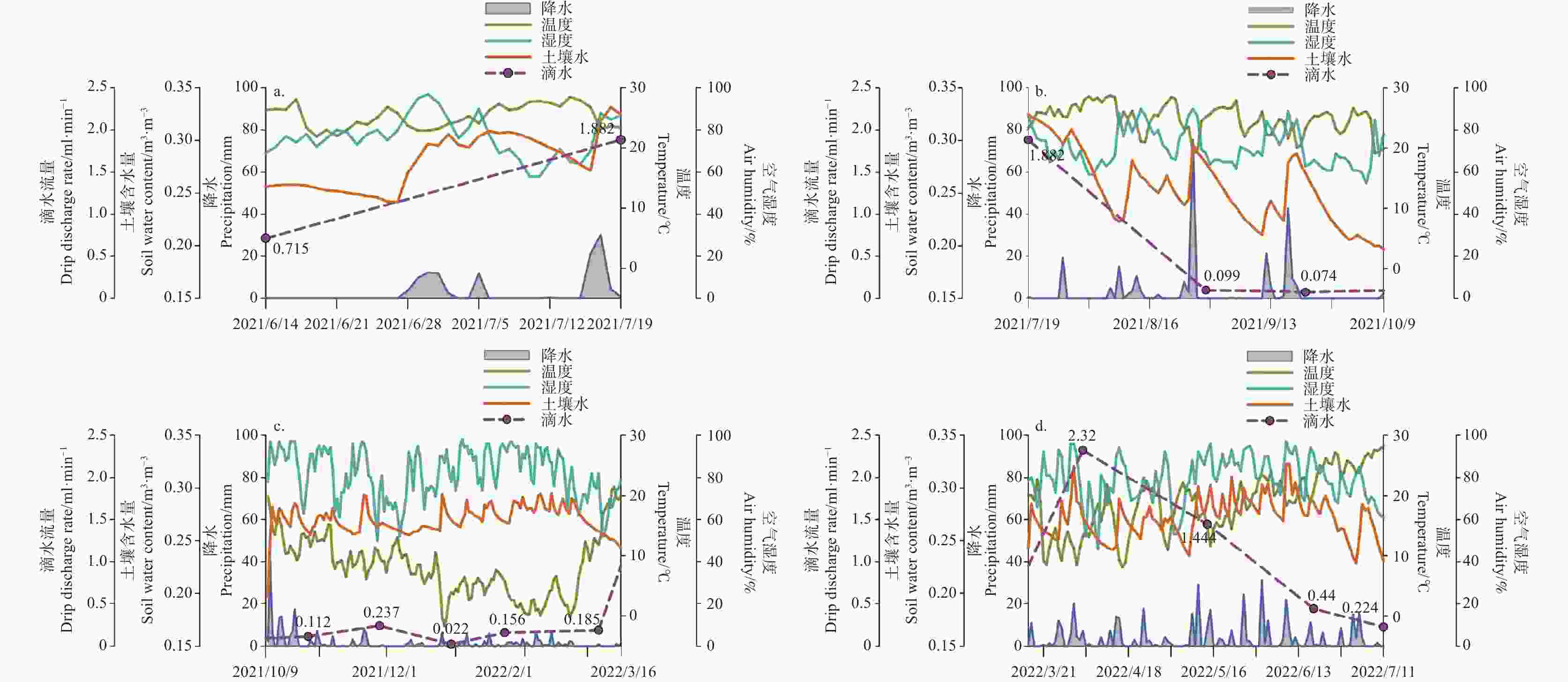 Figure  5.  Seasonal variations of soil water content, meteorological data, and drip discharge rates in Groups A (a), B (b), C (c), and D (d) in Qingjiang cave