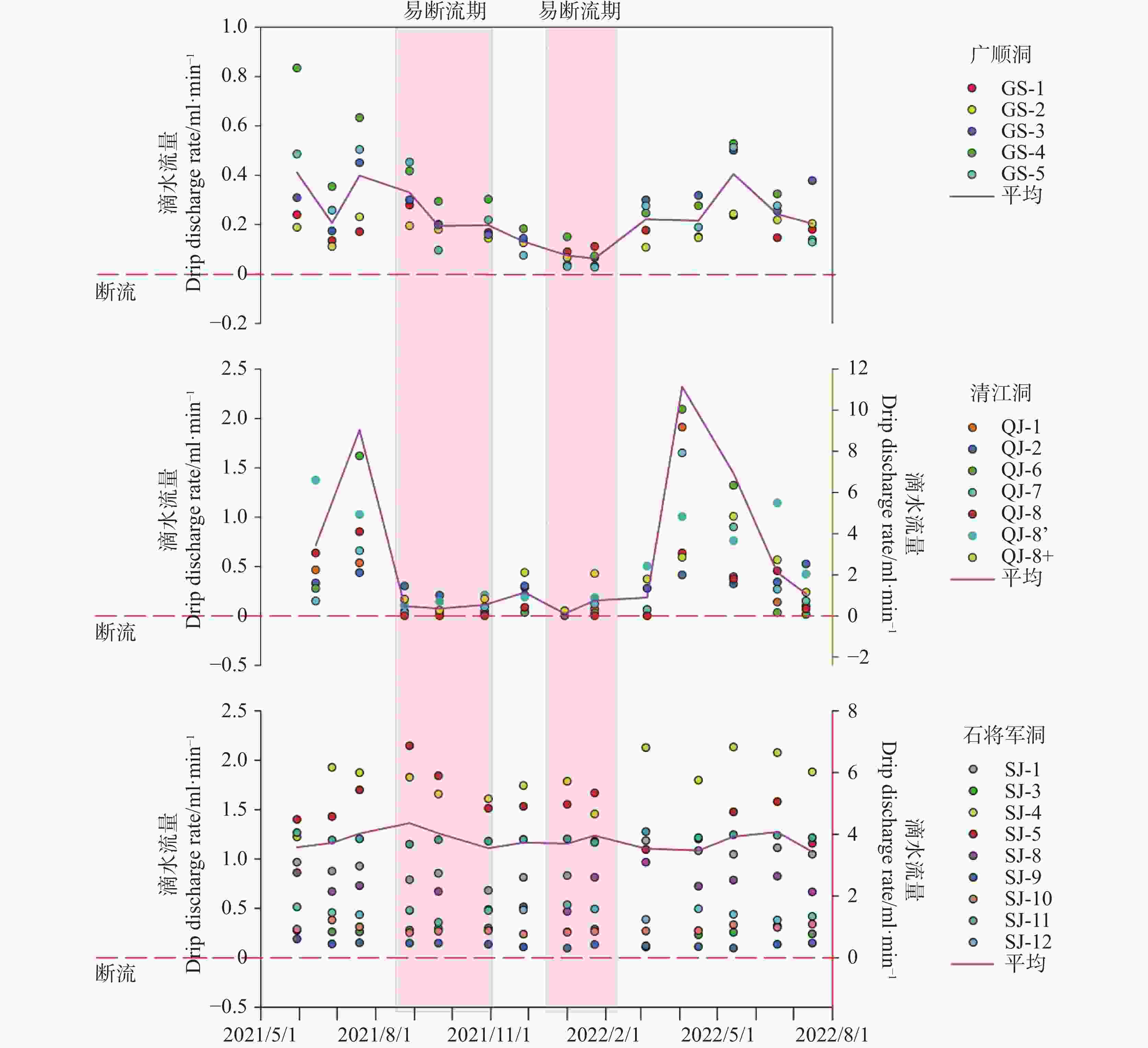 表  1  监测期内3个洞穴的滴水流量统计值