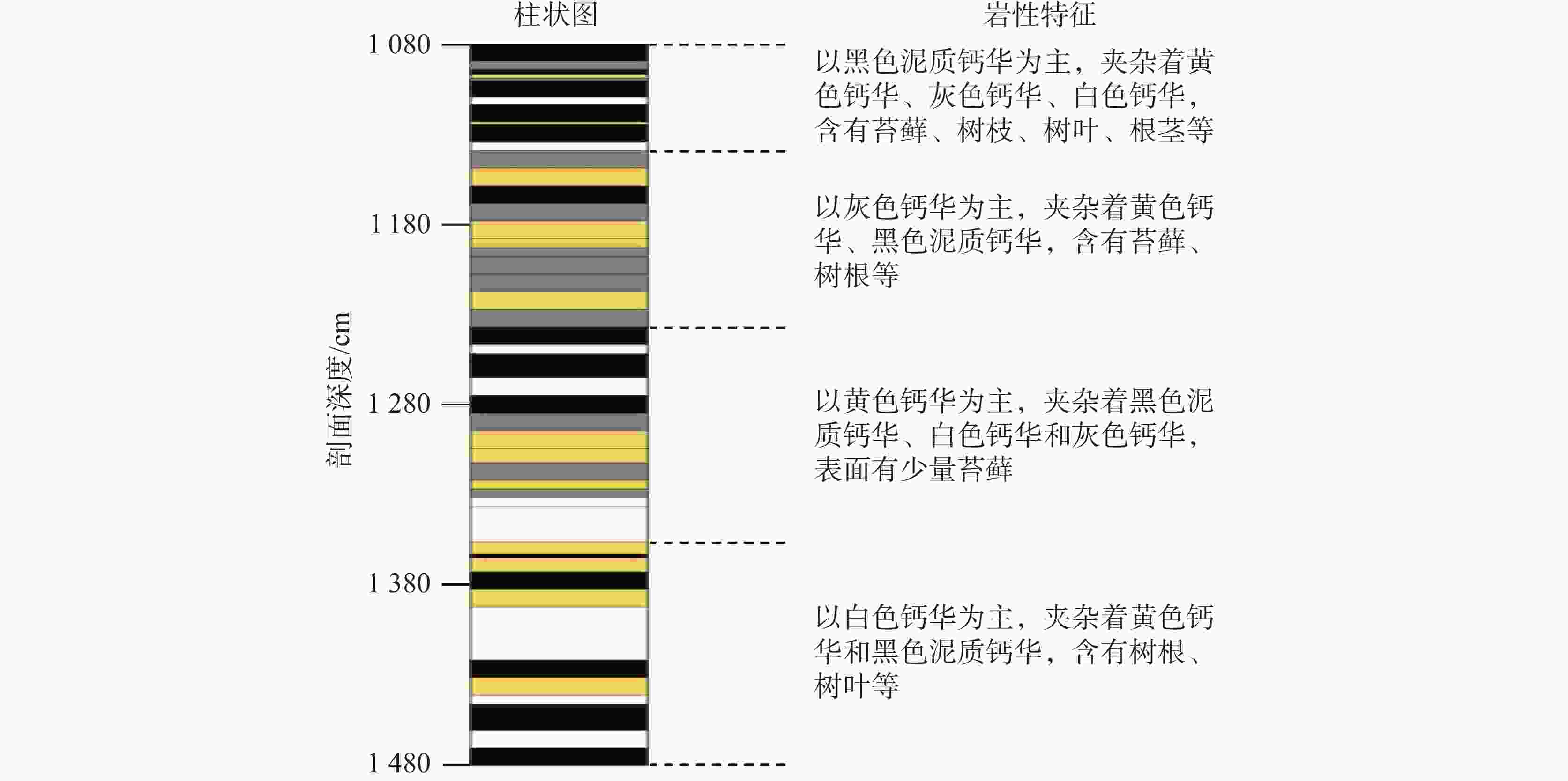 2 366.52 g·kg−1,0~0.89 g·kg−1,0.03~0.25 g·kg−1,在元素含量方面,黑色泥质钙华以SiO2为主,白色钙华、黄色钙华、灰色钙华均以CaO为主,推测黑色泥质钙华沉积于雨季,降水充沛,气候较湿润,而灰色钙华、白色钙华和黄色钙华形成于旱季,降水较少,气候较干冷。Abstract:The travertine profiles are located in the Zhaga waterfall in Munigou, Sichuan Province, where the highest altitude ranges from 4,070 m to 2,800 m, and the average annual temperature is 7℃. The study area is situated in the Minjiang fracture zone, with Paleozoic carbonate construction on the east side of the fracture, and shallow metamorphic rocks and slates of the Middle and Upper Triassic Xikang Group on the west side. Travertine is deposited by the stream fed by karst springs, and the mouth of the spring is located on the left bank of the hook upstream of Zhaga waterfall. The travertine deposits are distributed from the mouth of the spring down to the mouth of the gully. Their depositional patterns fall into striated travertine, clastic travertine, etc., and the type of depositional phase is a dam. The overall travertine profile is about 30-meter thick with horizontal sedimentary construction. In this study, the travertine profiles were investigated in terms of mineralogy and isotope geochemistry. UV spectrophotometry and X-ray fluorescence spectroscopy were used to determine the organic matter, total nitrogen, total phosphorus and chemical elements in travertine profile sediments so as to comprehensively analyze the characteristics of the travertine profiles and their significance of environmental indications. The results show that the travertine profiles can be divided into four stages based on sedimentary features such as sediment color, texture and inclusions. Stage 1: 1,080–1130 cm, overall dominated by a black muddy travertine layer interspersed with yellow travertine, grey travertine, and white travertine, containing twigs, leaves, and roots; Stage 2: 1,130–1,230 cm, overall dominated by a grey travertine layer interspersed with yellow travertine and black muddy travertine layers containing tree roots; Stage 3: 1,230–1,353 cm, overall dominated by yellow travertine layers interspersed with black muddy travertine, white travertine and grey travertine; Stage 4: 1,353–1,480 cm, overall dominated by a white travertine layer interspersed with yellow travertine and black muddy travertine layers containing roots and leaves. The testing and analysis of the sediments from the travertine profile in Munigou revealed that the overall organic matter content of travertine sediments ranged from 294.66 g·kg−1 to 2,366.52 g·kg−1 with a mean value of 1,031.93 g·kg−1; the TN content ranged from 0 g·kg−1 to 0.89 g·kg−1 with a mean value of 0.25 g·kg−1; the TP content ranged from 0.03 g·kg−1 to 0.25 g·kg−1 with a mean value of 0.12 g·kg−1. In order to fully understand the relationship between organic matter, TN and TP, and to better reveal the environmental characteristics when the travertine was deposited, we carried out Pearson correlation analyses of organic matter, TN and TP, which showed that the organic matter and TN content exhibited a significant correlation (r=0.822, n=48, P<0.01); the organic matter and TP content were positively correlated (r=0.574, n=48, P<0.01); there was a good correlation between TN and TP contents (r=0.644, n=48, P<0.01). Travertine sediments with four different colors at different depths were selected for elemental analysis, and the results showed that the main chemical compositions of the travertine profile were CaO and SiO2, followed by Al2O3, Fe2O3, MgO, Na2O, and TiO2. The CaO content ranged from 97.79% to 27.51%, with an average value of 70.25%. The SiO2 content ranged from 50.10% to 0.76%, with an average value of 19.52%. CaO is chemically active and easy to migrate. The high CaO activity indicates that it is easily lost under warm and humid conditions, making its content relatively low, and under dry and cold conditions, the weak surface chemical action enriches CaO, making its content high. SiO2 is chemically stable and difficult to migrate; therefore, its high content can indicate much precipitation, warm and wet climate, and its relatively high enrichment, and vice versa. The travertine profiles at 1,080–1,130 cm, 1,250–1,280 cm and 1,460–1,480 cm were dominated by black muddy travertine, with high content of organic matter, TN and TP, and their chemical elements were dominated by SiO2. The environment at the time of travertine deposition is presumed to be of wet climate during the rainy season with abundant precipitation. The travertine profiles at 1,130–1,250 cm and 1,280–1,460 cm were dominated by grey travertine, white travertine and yellow travertine, with low levels of organic matter, TN, TP, and their chemical elements were dominated by CaO. The environment at the time of deposition is presumed to be of a dry season with little precipitation and dry and cold climate. The above conclusions are intended to reveal the environmental conditions of Munigou at the time when travertine was deposited and to lay the foundation for an in-depth study of the ancient environment of Munigou. -