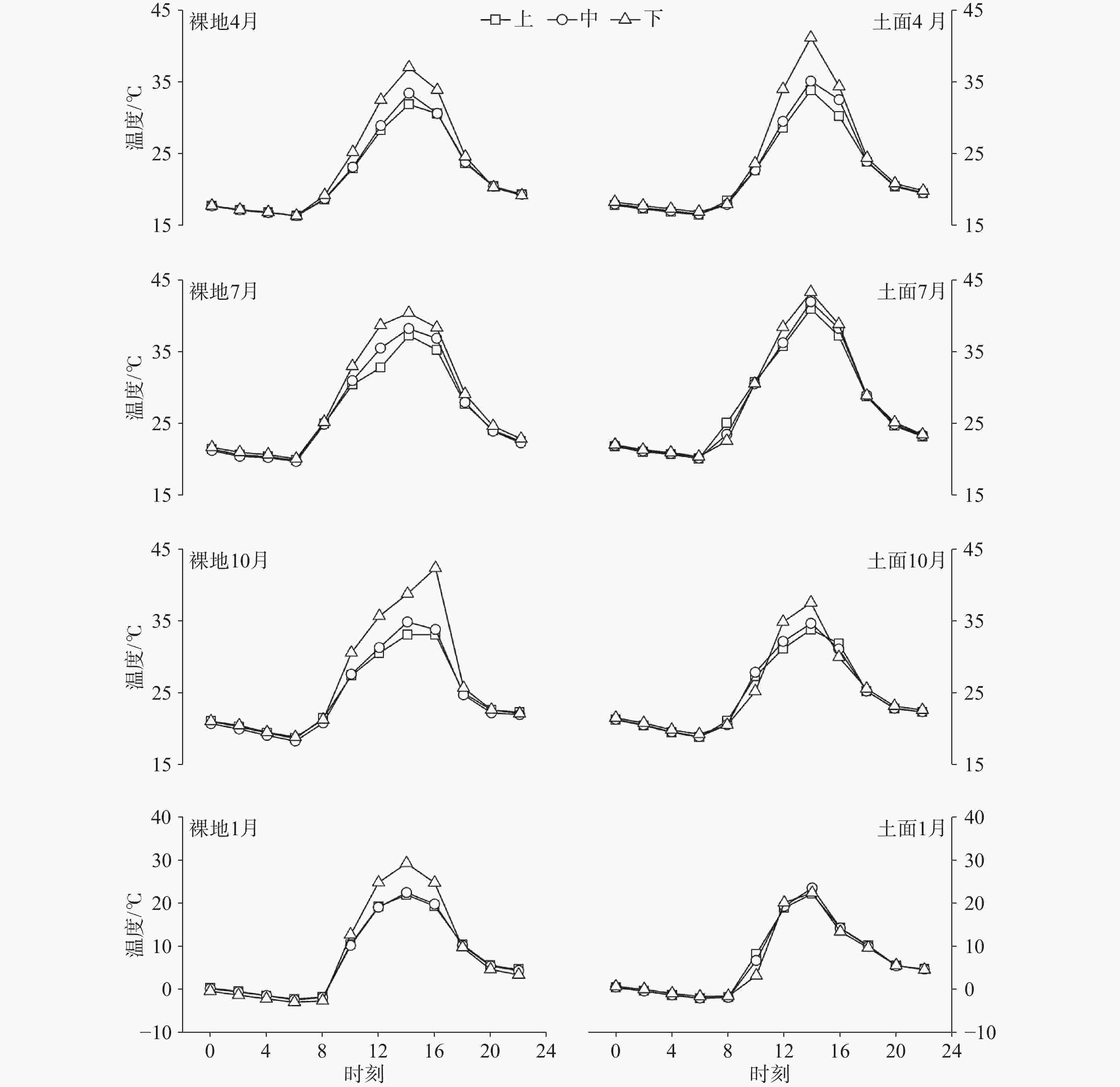月份 时刻 下垫面类型 裸地 土面 上层 中层 下层 上层 中层 下层 4 8:00 18.62±1.72Aa 18.74±1.69 Aa 19.22±1.73 Aa 18.54±1.61 Aa 18.04±1.66 Aa 18.08±1.72 Aa 10:00 22.96±2.17Aa 23.10±2.16 Aa 25.20±2.66 Aa 22.82±2.02 Aa 22.86±2.03 Aa 23.76±2.18 Aa 12:00 28.26±3.24 Aa 28.90±3.35 Aa 32.48±4.00 Aa 28.78±3.32 Aa 29.68±3.43 Aa 34.18±4.43 Aa 14:00 31.88±1.75 Aa 33.42±2.24 Aa 37.06±2.46 Aa 34.04±1.92 Aa 35.30±2.28 Aa 41.42±3.35 Aa 16:00 30.56±2.89 Aa 30.62±2.95 Aa 33.86±3.44 Aa 30.40±2.72 Aa 32.72±3.28 Aa 34.54±3.69 Aa 18:00 23.68±1.92 Aa 23.82±1.97 Aa 24.58±2.09 Aa 24.02±1.92 Aa 24.06±1.90 Aa 24.54±1.89 Aa 7 8:00 24.88±0.28 Aa 24.82±0.37 Ba 25.14±0.38 Ba 24.96±0.29 Ab 23.38±0.31 Aa 22.46±0.32 Aa 10:00 30.38±1.22 Aa 30.91±1.00 Aa 32.92±1.32 Aa 30.64±0.75 Aa 30.41±0.73 Aa 30.44±0.78 Aa 12:00 32.72±0.91 Aa 35.41±1.42 Aab 38.65±2.06 Ab 35.69±1.47 Aa 36.16±1.47 Aa 38.32±1.67 Aa 14:00 37.22±0.83 Aa 38.15±1.17 Aa 39.53±0.53 Aa 40.85±0.85 Ba 41.88±0.98 Ba 43.20±0.67 Ba 16:00 35.20±1.39 Aa 36.80±1.58 Aa 38.29±1.61 Aa 37.15±1.62 Aa 38.15±1.68 Aa 38.74±1.18 Aa 18:00 27.68±0.29 Aa 27.88±0.31 Aab 29.04±0.40 Ab 28.68±0.54 Aa 28.84±0.59 Aa 28.78±0.43 Aa 10 8:00 21.43±0.18 Aa 20.82±0.32 Aa 21.24±0.44 Aa 21.16±0.27 Aa 20.64±0.60 Aa 20.61±0.61 Aa 10:00 27.40±1.23 Aa 27.55±1.18 Aa 30.56±1.75 Ba 27.33±1.03 Aa 27.89±1.26 Aa 25.26±0.34 Aa 12:00 30.51±1.66 Aa 38.65±2.06 Aa 35.60±2.23 Aa 31.17±1.75 Aa 32.19±1.95 Aa 34.89±2.63 Aa 14:00 33.04±0.98 Aa 34.84±1.12 Aab 38.70±1.11 Ab 33.85±1.10 Aa 34.70±1.13 Aa 37.57±1.43 Aa 16:00 33.05±0.75 Aa 33.78±0.72 Ba 42.29±0.99 Bb 31.89±0.72 Aa 31.15±0.71 Aa 29.98±0.55 Aa 18:00 24.93±0.42 Aa 24.69±0.48 Aa 25.63±0.38 Aa 25.30±0.37 Aa 25.31±0.36 Aa 25.66±0.40 Aa 1 8:00 −1.66±1.00 Aa −1.80±0.90 Aa −2.56±0.72 Aa −1.58±0.87 Aa −1.64±0.83 Aa −1.30±0.74 Aa 10:00 10.54±0.52 Ba 10.24±0.51 Ba 12.74±0.45 Bb 8.42±0.55 Ab 6.94±0.72 Ab 3.46±0.66 Aa 12:00 19.24±0.63 Aa 19.10±0.62 Aa 24.74±0.64 Bb 19.20±0.77 Aa 19.54±0.66 Aa 20.38±0.40 Aa 14:00 21.94±0.87 Aa 22.48±0.90 Aa 29.22±0.81 Bb 22.42±0.81 Aa 23.78±0.79 Aa 22.64±0.71 Aa 16:00 19.38±0.96 Ba 19.84±0.94 Ba 24.68±0.93 Bb 14.52±0.84 Aa 14.48±0.84 Aa 13.62±0.95 Aa 18:00 10.42±1.12 Aa 10.28±1.18 Aa 9.76±1.13 Aa 10.38±1.10 Aa 10.22±1.10 Aa 9.86±1.07 Aa 注:数据为平均值±标准误差,加粗且有边框的字母代表存在显著性差异(P<0.05)。不同大写字母表示同一空间高度裸地和土面之间差异显著(P<0.05),不同小写字母表示同一下垫面各空间高度差异显著(P<0.05)。表1和表2同理。