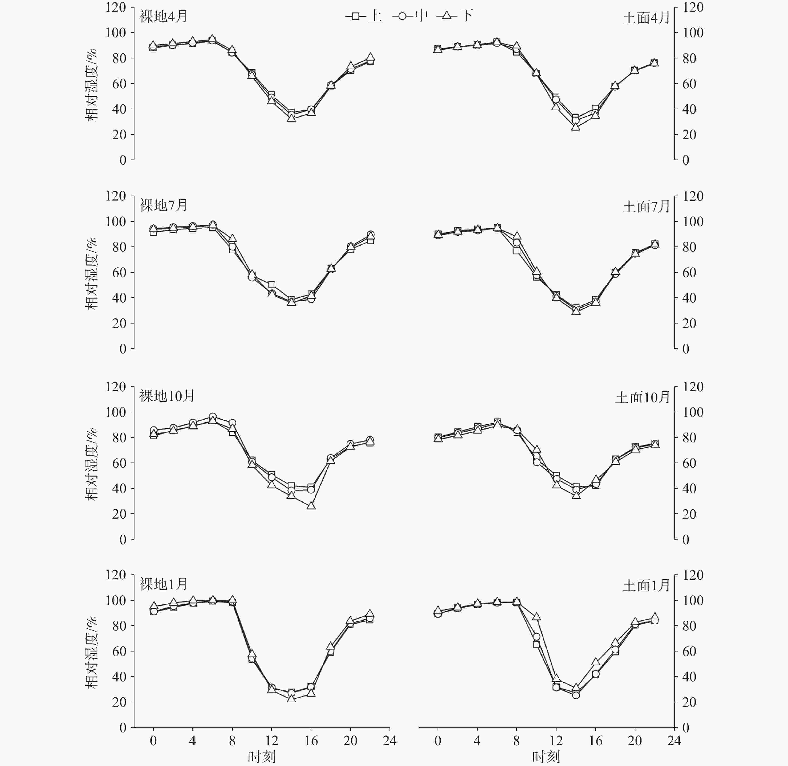月份 时刻 类型 裸地 土面 上层 中层 下层 上层 中层 下层 4 8:00 84.04±4.39 Aa 84.02±4.51 Aa 85.84±4.15 Aa 84.68±3.97 Aa 87.10±3.44 Aa 89.10±3.45 Aa 10:00 67.94±7.69 Aa 67.10±7.78 Aa 65.48±7.84 Aa 67.98±6.52 Aa 67.84±6.65 Aa 68.06±7.19 Aa 12:00 50.70±9.78 Aa 48.82±10.04 Aa 45.62±11.34 Aa 49.26±9.75 Aa 47.60±9.90 Aa 41.30±11.22 Aa 14:00 37.16±4.48 Aa 35.20±5.01 Aa 31.96±5.91 Aa 33.08±4.61 Aa 31.08±4.79 Aa 25.56±6.34 Aa 16:00 39.32±7.18 Aa 39.44±7.35 Aa 36.50±8.17 Aa 40.58±7.43 Aa 37.20±8.51 Aa 34.56±9.09 Aa 18:00 57.92±6.63 Aa 58.6±5.80 Aa 57.86±6.23 Aa 57.78±6.34 Aa 57.56±5.86 Aa 58.10±5.77 Aa 7 8:00 77.92±2.90 Aa 80.44±5.48 Aa 86.51±5.82 Aa 77.57±3.24 Aa 84.22±3.10 Aa 88.75±3.47 Aa 10:00 57.77±3.71 Aa 56.13±3.68 Aa 58.50±4.00 Aa 57.07±2.56 Aa 58.52±2.93 Aa 61.28±4.54 Aa 12:00 50.46±2.33 Aa 43.54±3.18 Aa 42.71±4.28 Aa 43.16±3.64 Aa 42.31±3.67 Aa 40.60±4.30 Aa 14:00 38.94±2.01 Ba 37.80±1.92 Ba 36.20±1.54 Ba 32.91±1.10 Aa 31.72±1.48 Aa 29.67±1.41 Aa 16:00 43.12±2.55 Aa 39.24±2.58 Aa 41.76±2.12 Aa 39.49±2.17 Aa 38.12±2.90 Aa 37.07±2.50 Aa 18:00 63.17±2.48 Aa 62.60±2.53 Aa 62.97±2.59 Aa 60.44±2.04 Aa 59.71±1.71 Aa 60.89±2.59 Aa 10 8:00 83.81±1.17 Aa 91.42±2.66 Ab 86.68±1.64 Aab 83.98±1.12 Aa 85.82±2.18 Aa 86.07±2.20 Aa 10:00 62.05±4.00 Aa 60.94±4.10 Aa 58.21±4.29 Aa 62.74±3.24 Aa 60.36±4.18 Aa 70.06±0.70 Ba 12:00 50.91±5.35 Aa 48.75±5.31 Aa 42.35±5.30 Aa 49.96±5.38 Aa 47.49±5.19 Aa 42.22±6.01 Aa 14:00 42.22±2.58 Aa 38.52±2.64 Aa 33.89±2.34 Aa 41.03±2.86 Aa 38.83±3.14 Aa 33.67±3.20 Aa 16:00 40.94±2.43 Ab 38.86±2.15 Ab 25.87±1.66 Aa 42.00±2.91 Aa 43.25±2.95 Aa 46.46±2.59 Ba 18:00 62.95±2.85 Aa 63.86±2.82 Aa 61.40±2.76 Aa 62.83±2.78 Aa 62.65±2.65 Aa 60.76±2.75 Aa 1 8:00 98.32±1.08 Aa 99.12±0.68 Aa 100.00±0.00 Aa 98.66±1.03 Aa 98.98±1.02 Aa 99.02±0.58 Aa 10:00 53.50±2.22 Aa 54.78±2.53 Aa 57.48±2.28 Aa 65.62±2.74 Ba 71.70±3.83 Ba 86.92±3.12 Bb 12:00 30.94±2.49 Aa 31.52±2.26 Aa 29.44±2.34 Aa 32.26±2.28 Aa 31.74±2.05 Aa 38.52±2.25 Ba 14:00 27.80±2.38 Aa 27.16±2.46 Aa 22.00±1.75 Aa 27.62±2.06 Aa 25.58±2.08 Aa 31.48±2.27 Ba 16:00 32.14±2.96 Aa 31.94±2.69 Aa 26.48±2.16 Aa 42.00±2.50 Ba 42.54±2.21 Ba 51.52±2.88 Ba 18:00 59.22±3.30 Aa 59.86±3.25 Aa 63.58±3.81 Aa 59.84±3.20 Aa 61.60±2.94 Aa 66.98±3.02 Aa 表 3 不同月份两种下垫面各空间高度气温及相对湿度日较差显著性差异