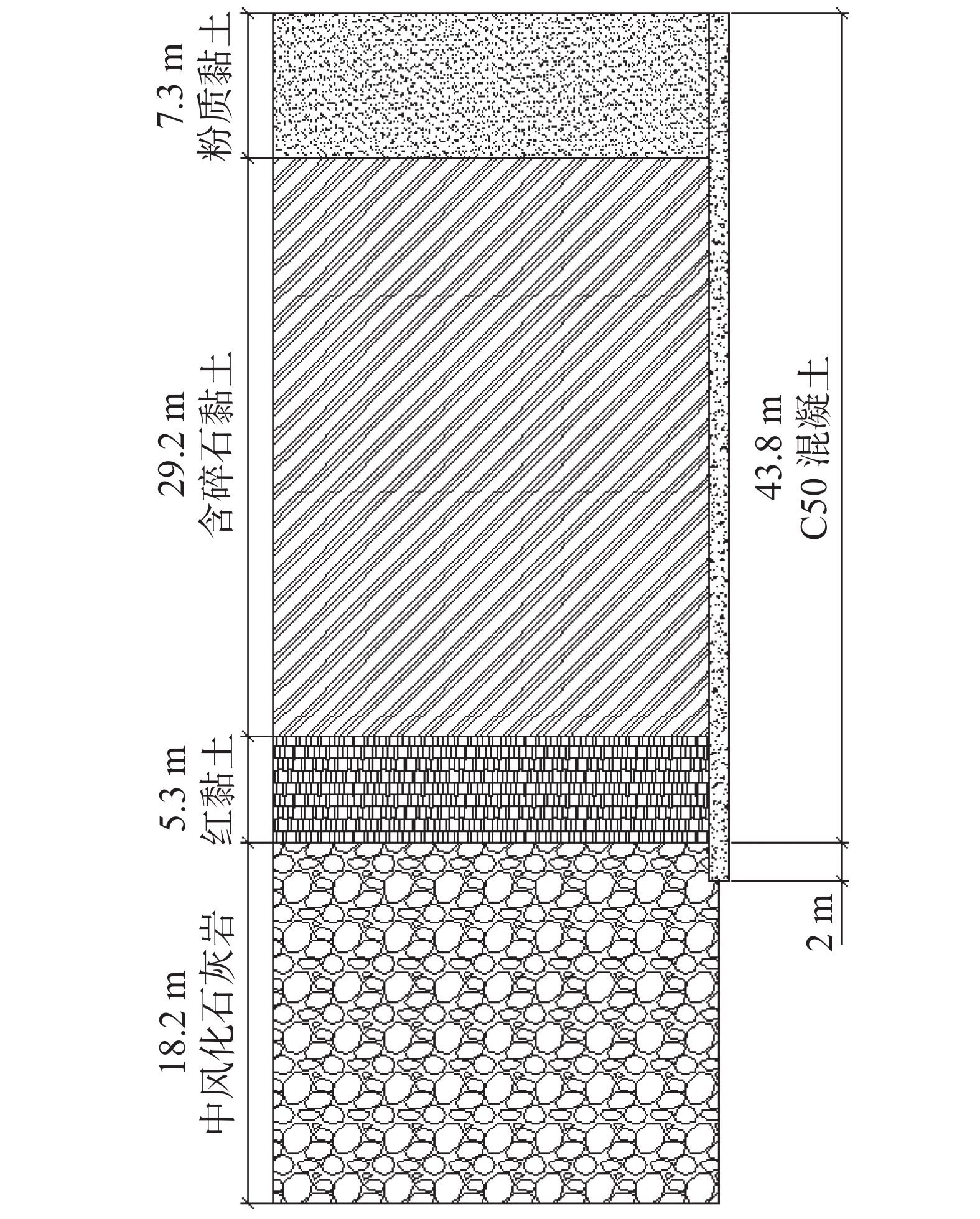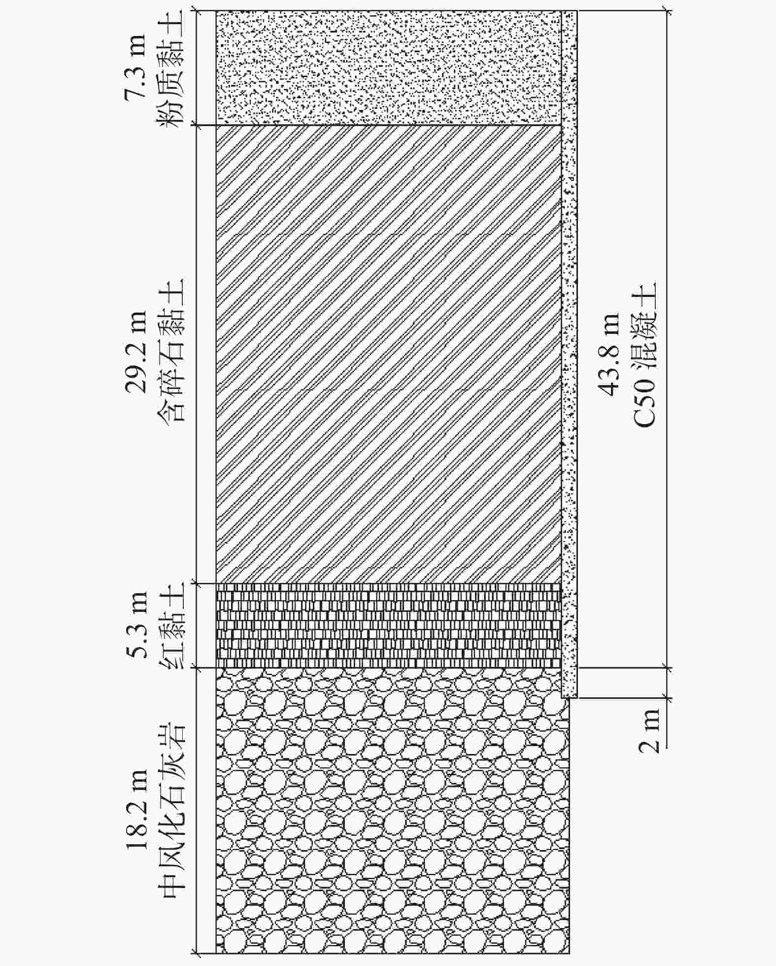 岩土名称 层厚/m 密度ρ/kg·m−3 弹性模量E/MPa 泊松比µ 内聚c/kPa 内摩擦角 φ/° 粉质黏土 7.3 1 940 15 0.4 38 15 含碎石黏土 29.2 1 970 23 0.4 40 17 红黏土 5.3 1 960 27 0.4 35 12 中风化石灰岩 18.2 2 550 2e4 0.25 1e4 45 桩 43.8 2 500 3.55e5 0.2 表 2 G1、G2组模拟工况参数表