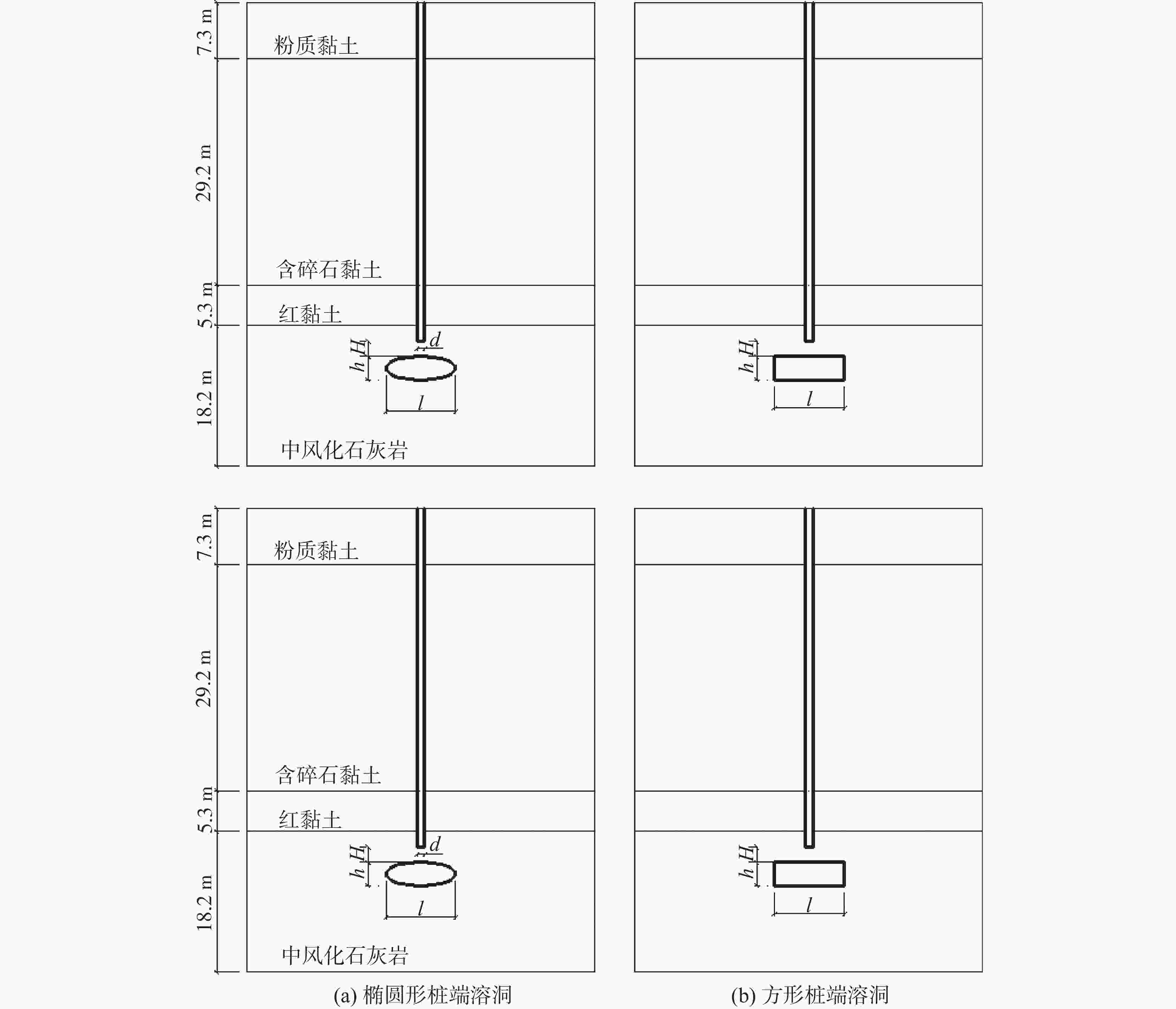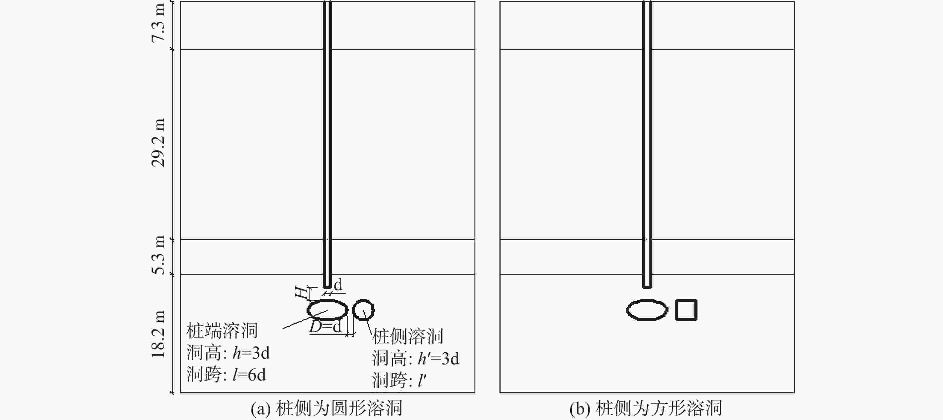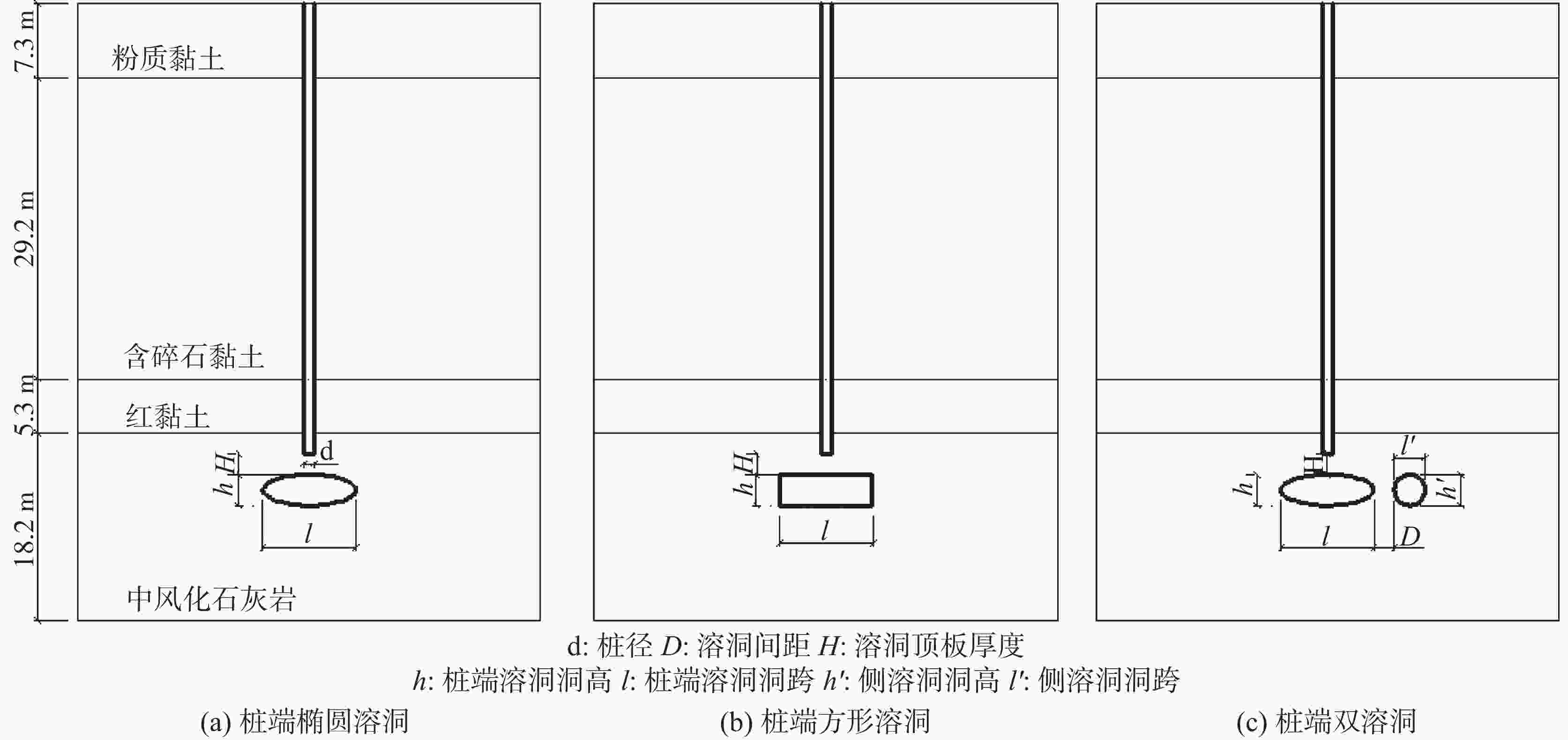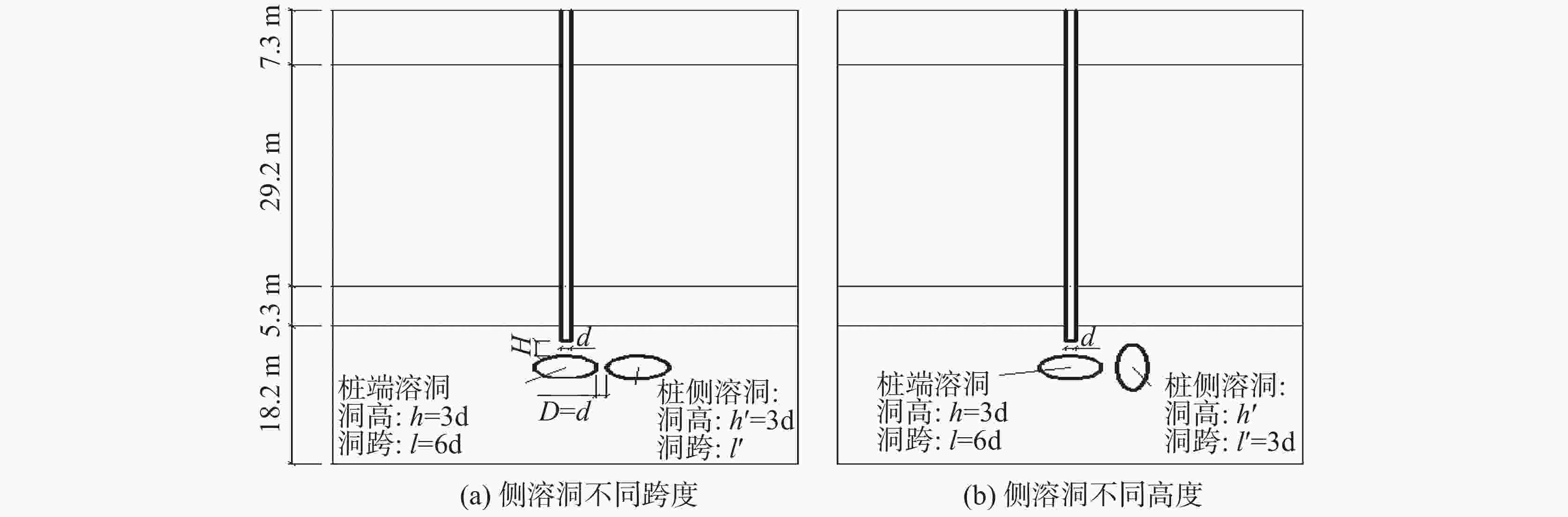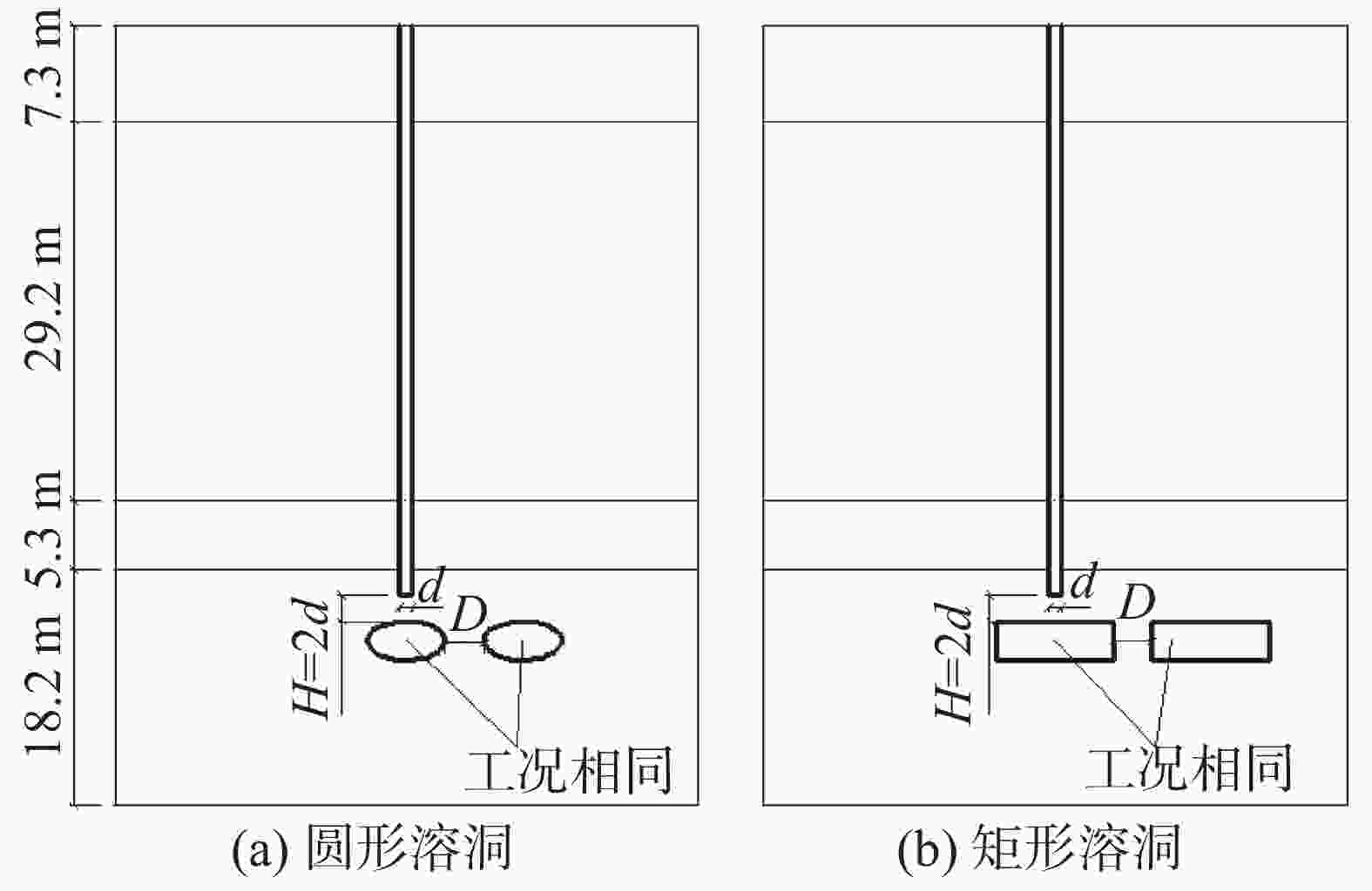 溶洞数 分组 溶洞特征 顶板厚度H 桩端溶洞 桩侧溶洞 溶洞间距D 形状 洞高h 洞跨l 高跨比h/l 形状 洞高h' 洞跨l' 高跨比h'/l' 单 G1 d/2d/3d/4d/5d 矩形椭圆 3d 3d 1 / 6d 1/2 9d 1/3 12d 1/4 15d 1/5 双 G2 2d/3d/4d/5d 椭圆 3d 6d 1/2 矩形椭圆 3d 3d 1 d 6d 2 9d 3 表 3 G3组模拟工况参数表
