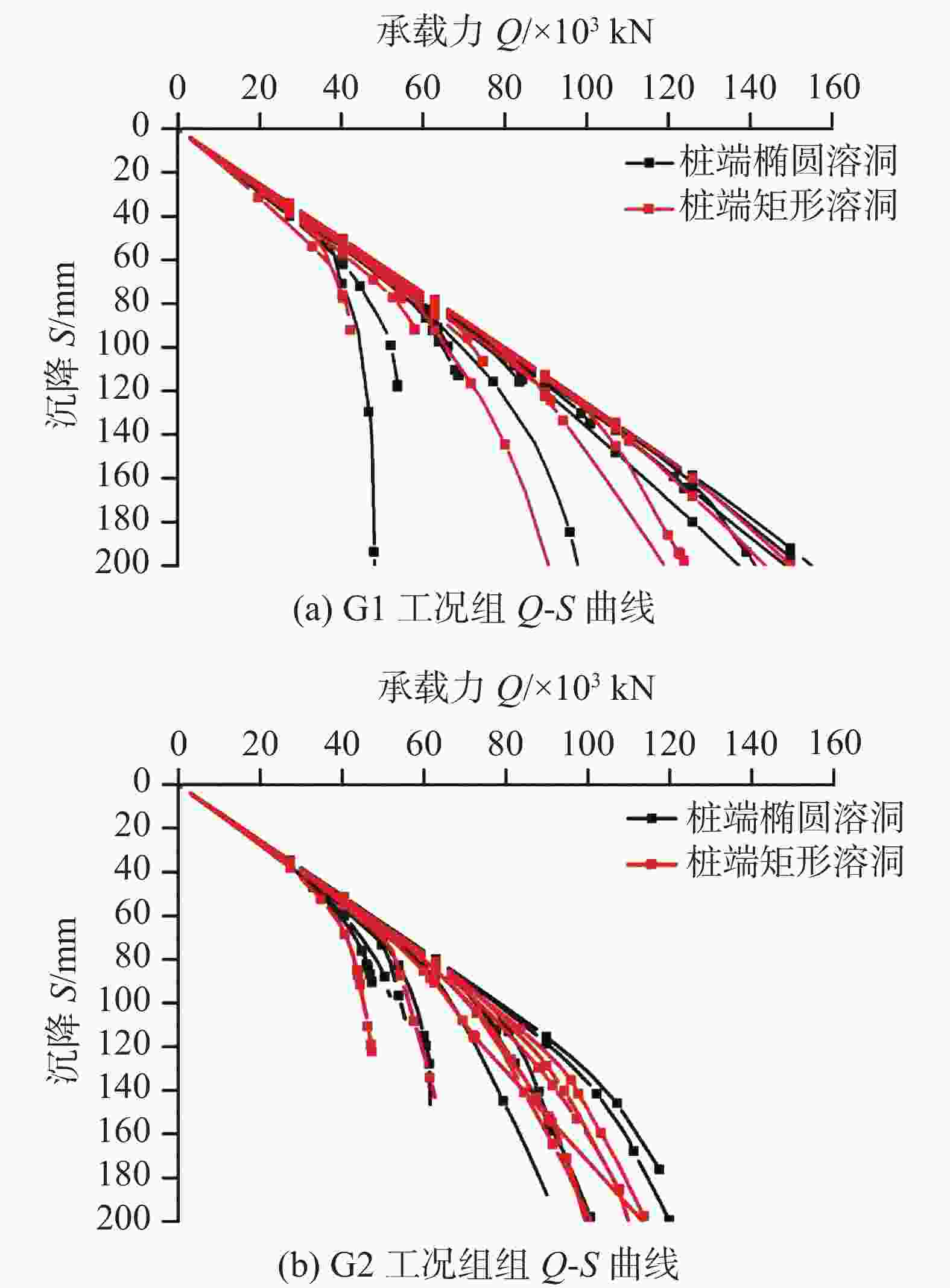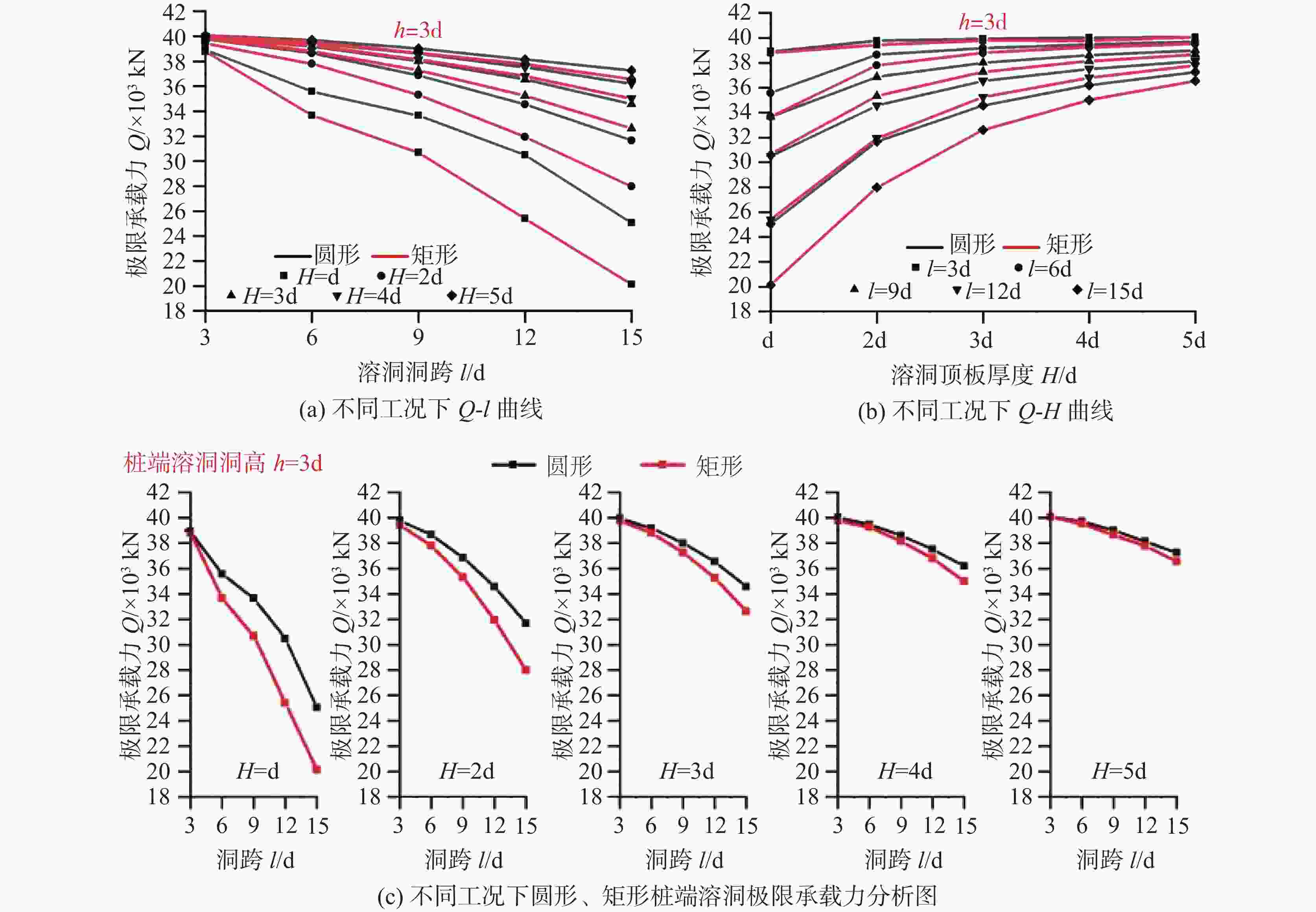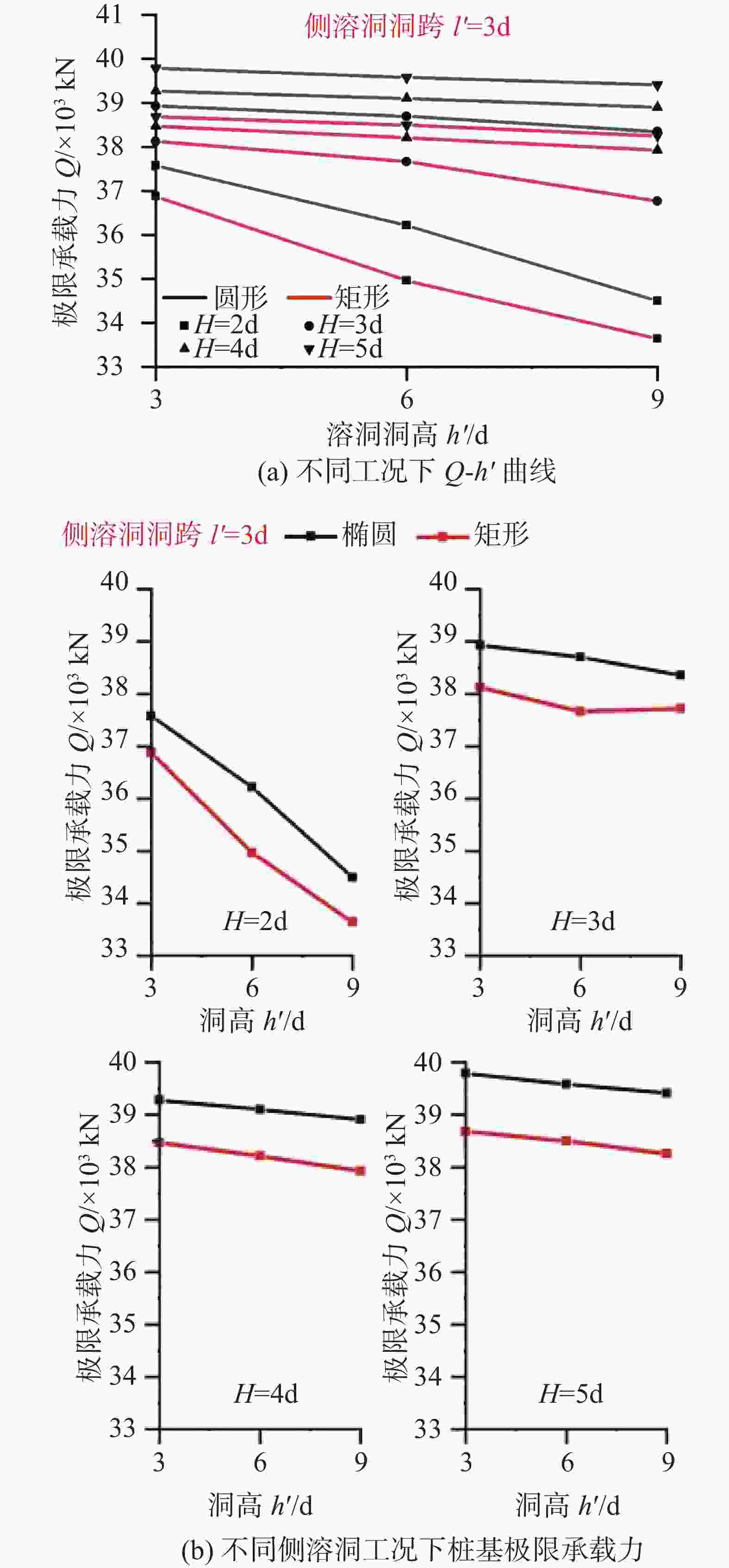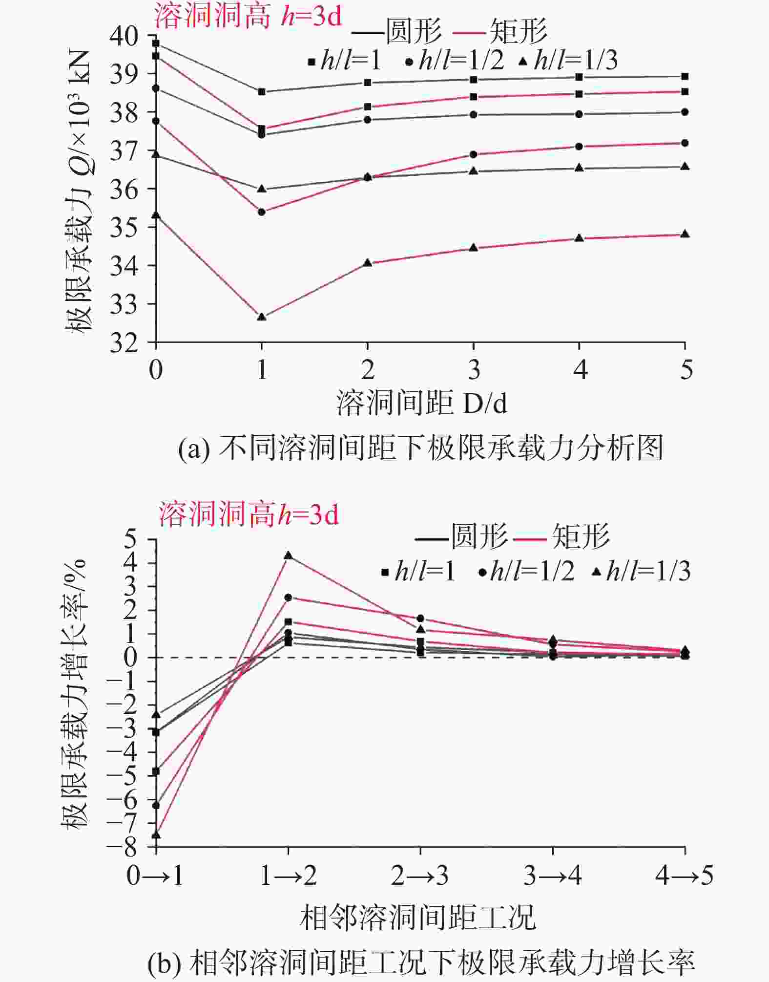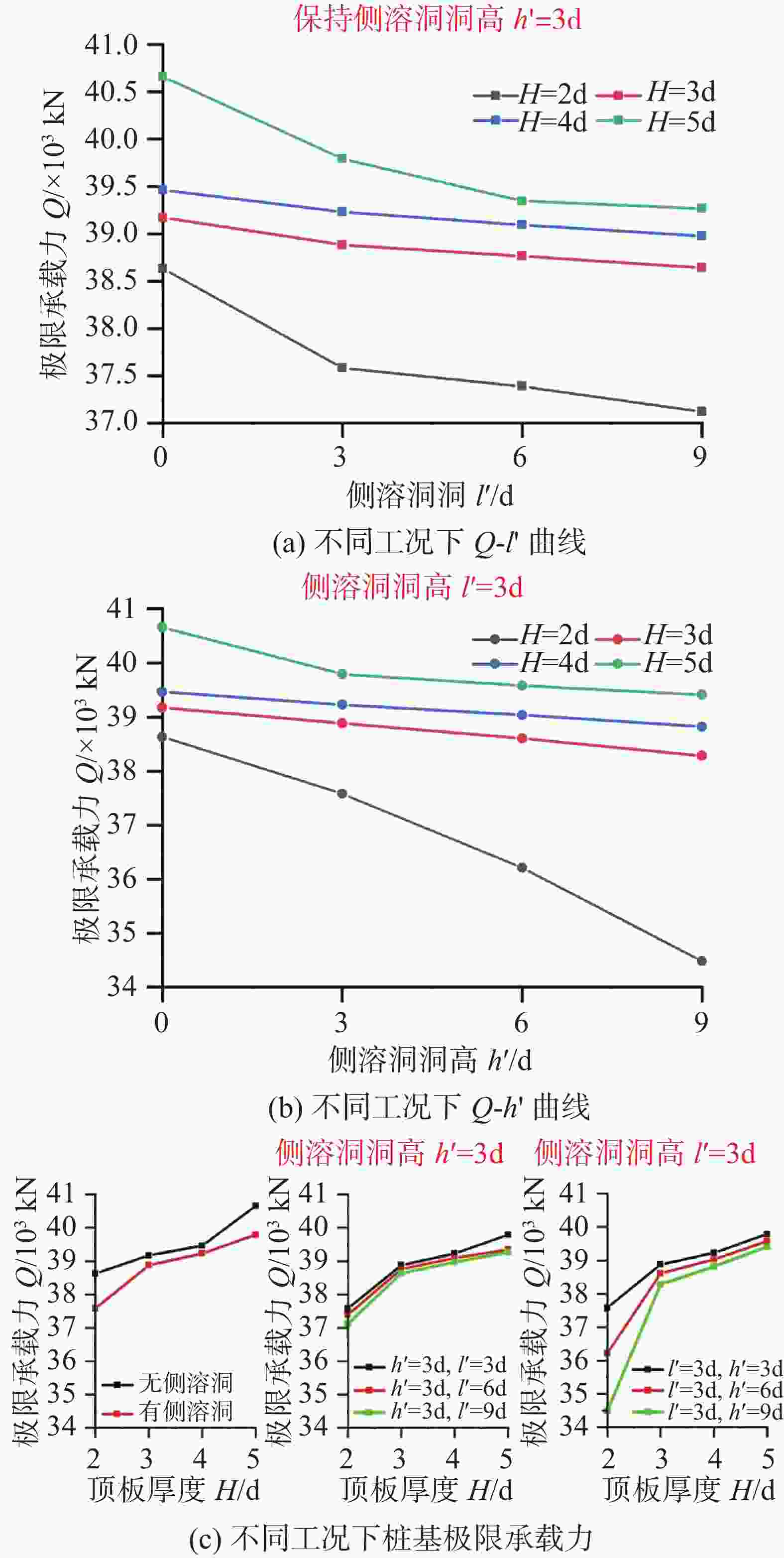 溶洞数 分组 溶洞特征 顶板厚度H 桩端溶洞 桩侧溶洞 溶洞间距D 形状 洞高h 洞跨l 高跨比h/l 形状 洞高h' 洞跨l' 高跨比h'/l' 单 G1 d/2d/3d/4d/5d 矩形椭圆 3d 3d 1 / 6d 1/2 9d 1/3 12d 1/4 15d 1/5 双 G2 2d/3d/4d/5d 椭圆 3d 6d 1/2 矩形椭圆 3d 3d 1 d 6d 2 9d 3 表 3 G3组模拟工况参数表