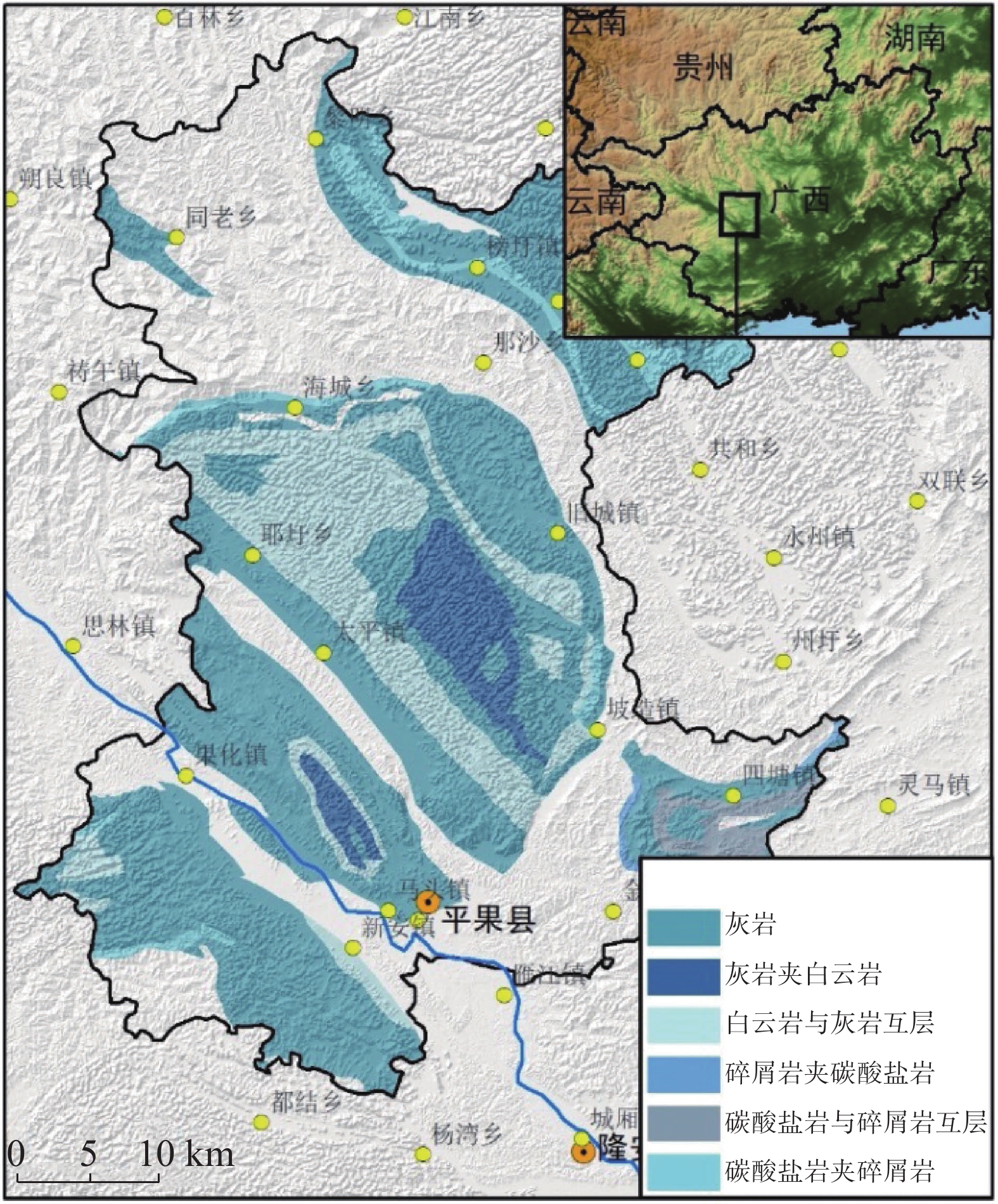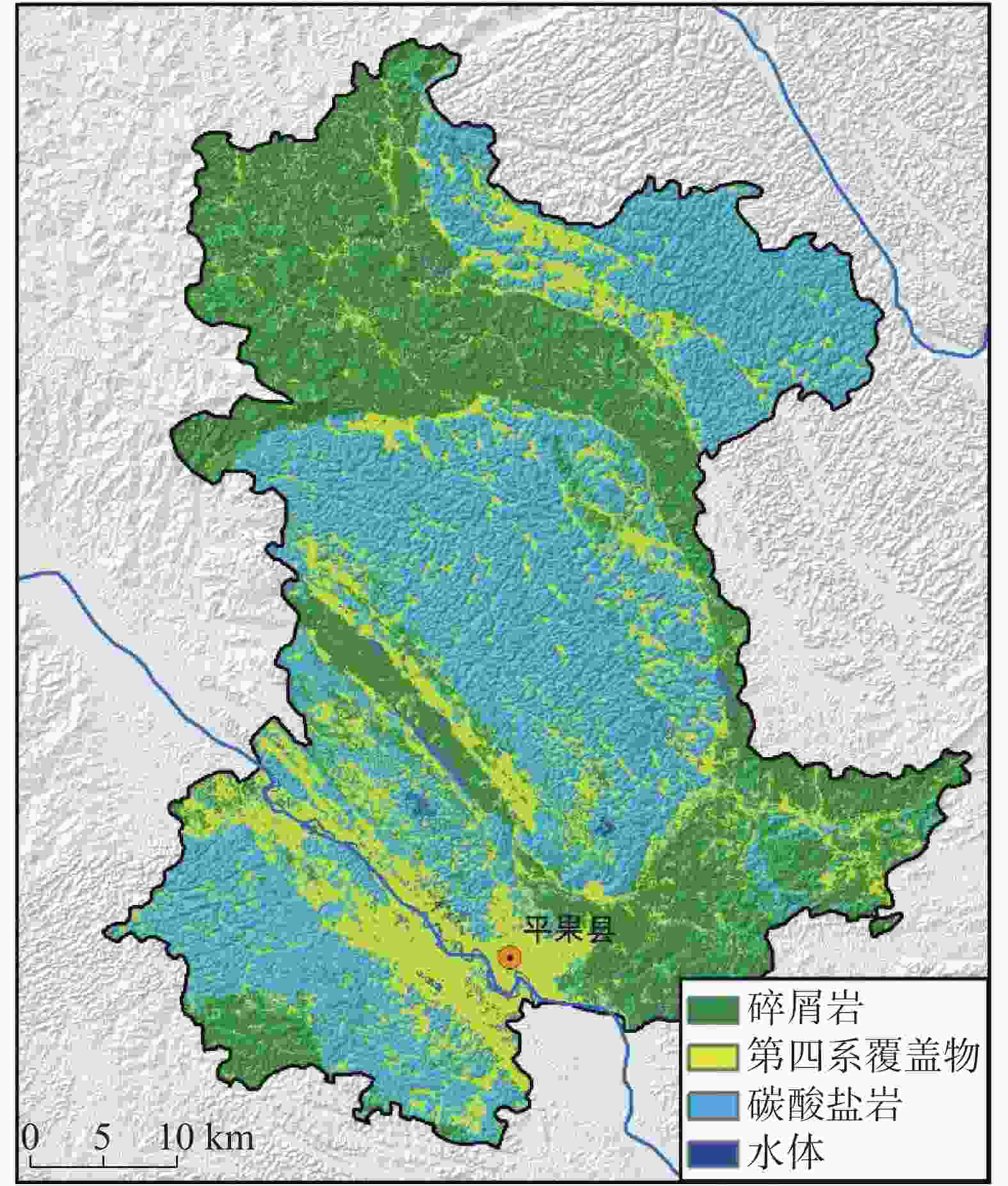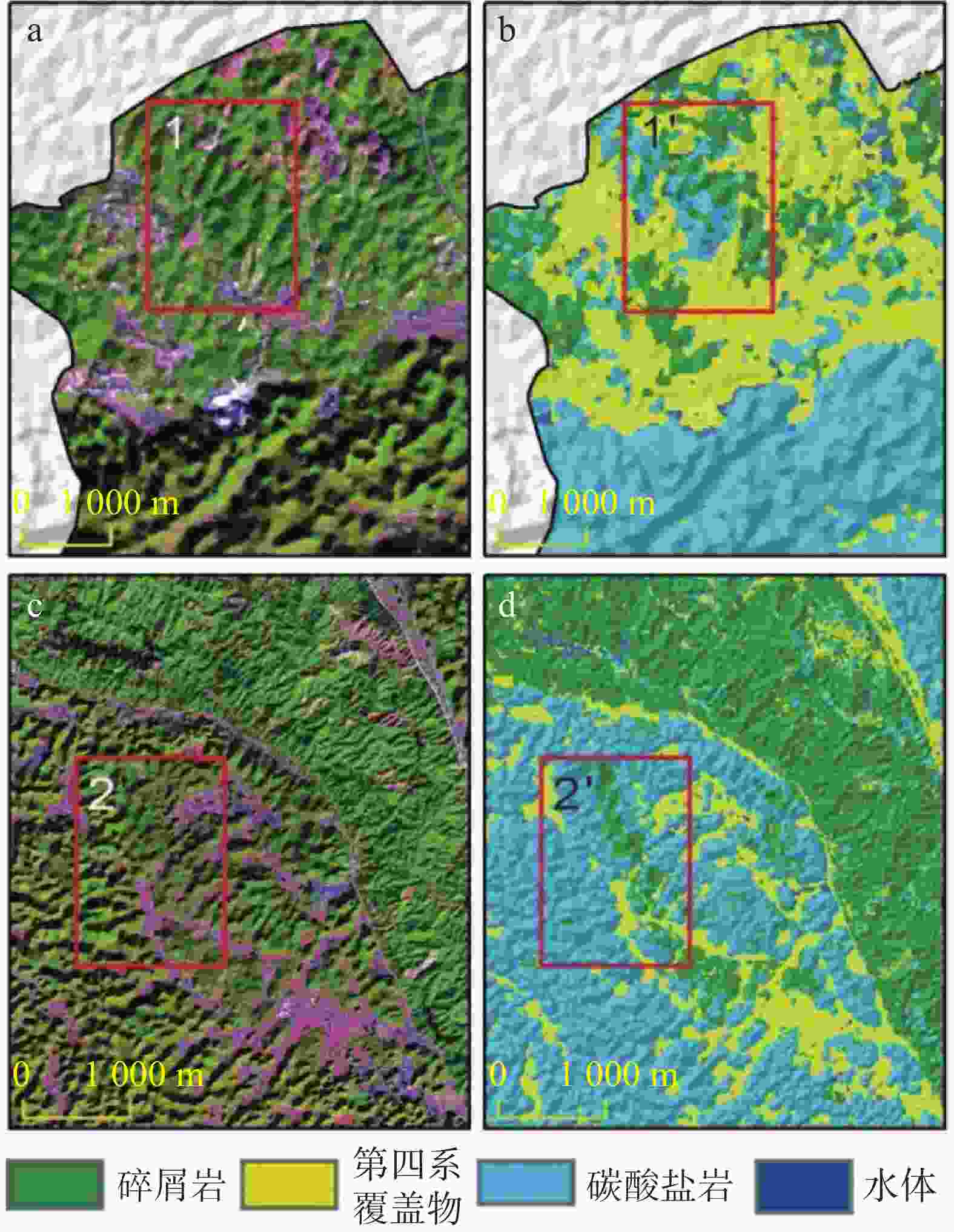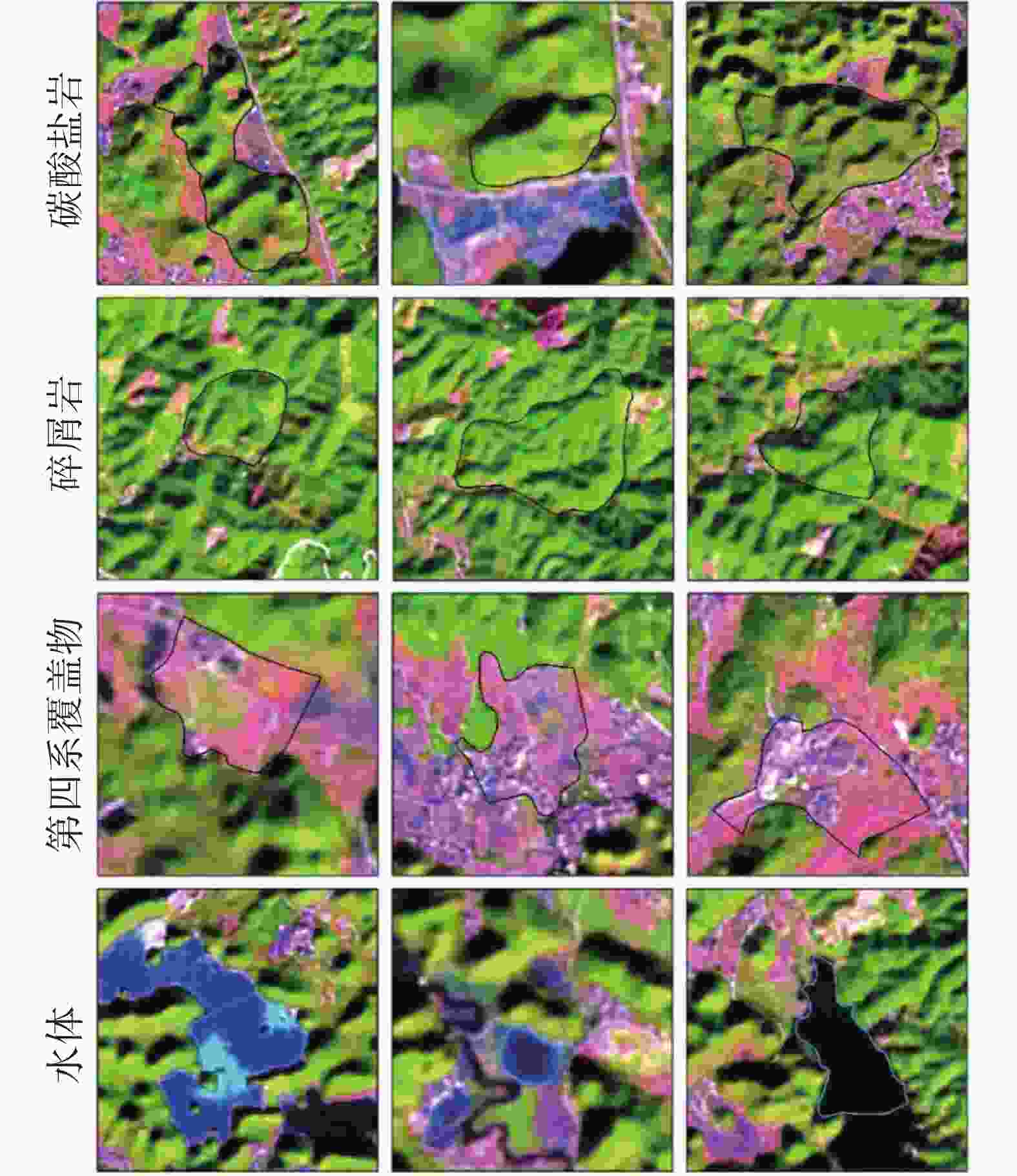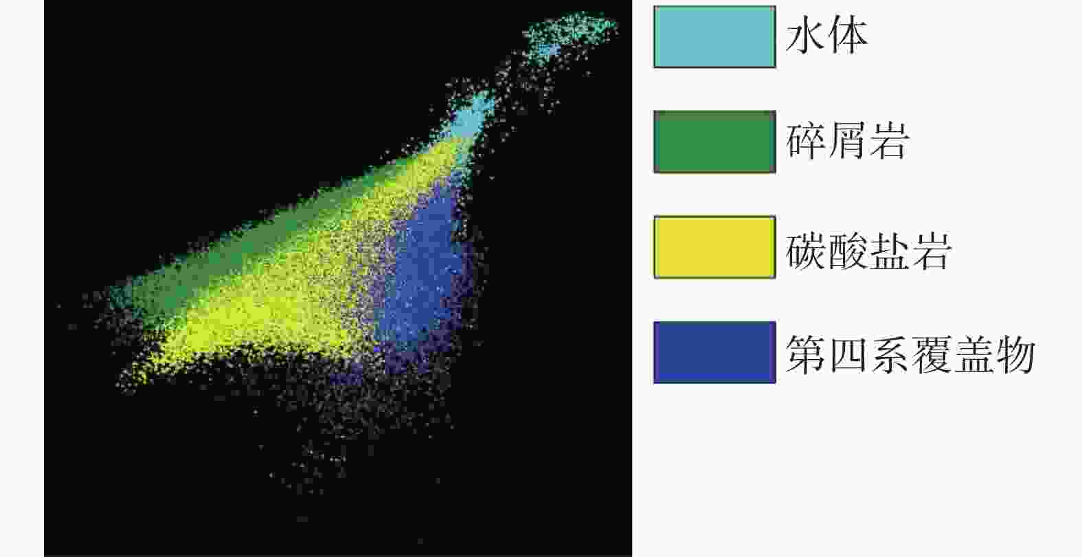 样本类别 碳酸盐岩 碎屑岩 第四系覆盖物 水体 碳酸盐岩 — 1.80 1.98 1.99 碎屑岩 1.80 — 1.99 1.99 第四系覆盖物 1.98 1.99 — 1.96 水体 1.99 1.99 1.96 — 表 2 平果地区岩性分类结果精度评价表