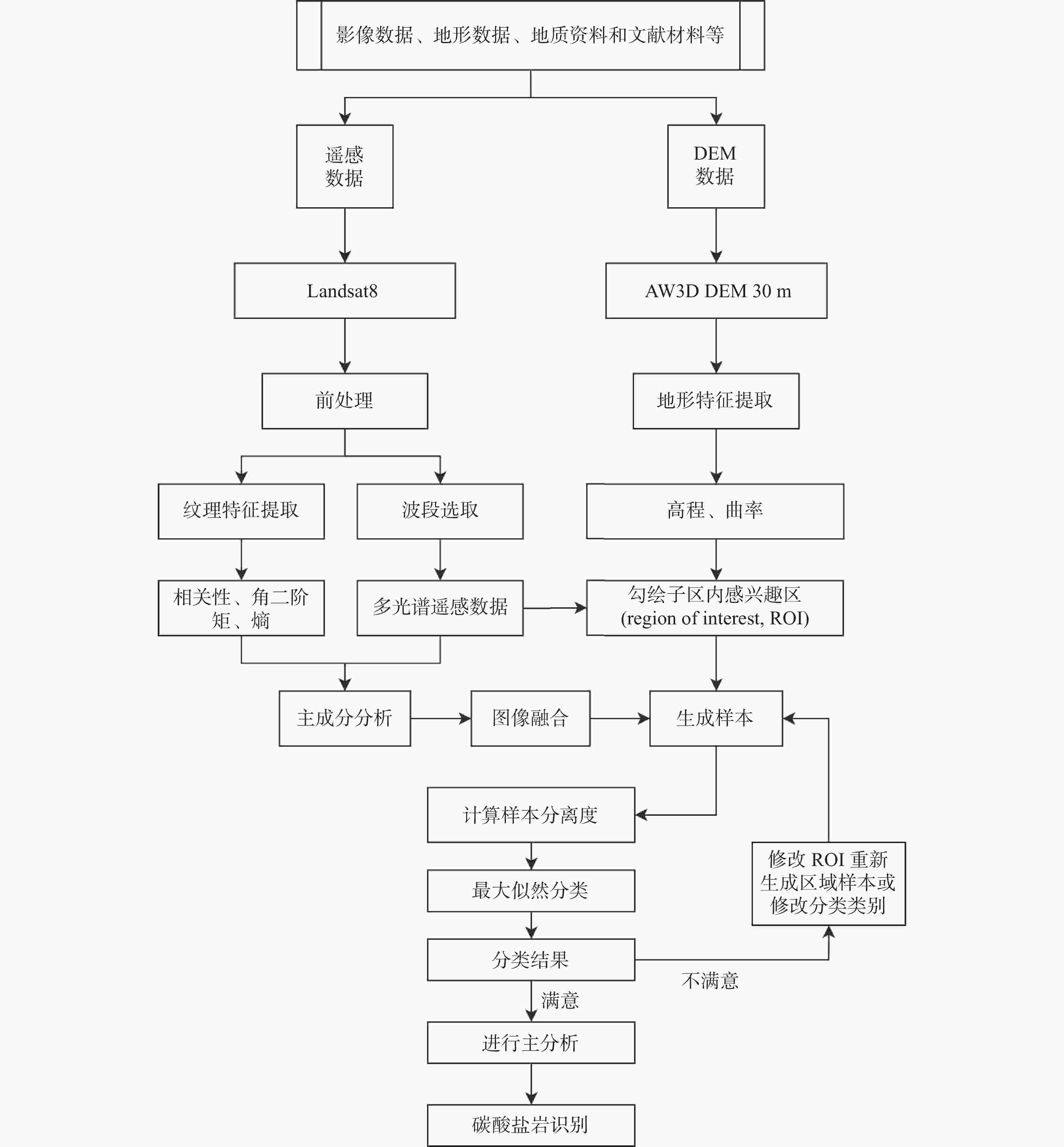 摘要: 快速准确识别碳酸盐岩对于岩溶区的基础设施建设和重大工程实施十分重要,通过遥感岩性分类实现碳酸盐岩的快速提取目前仍然是最高效的途径之一。文章基于Landsat和AW3D 30 DSM遥感数据,以广西平果地区典型岩溶区为研究对象,采用碳酸盐岩的可见光到短波红外的多光谱信息、熵和角二阶矩等纹理信息及曲率和坡度等地形特征,对平果地区岩溶分布区的碳酸盐岩、碎屑岩、第四系及水体进行岩性分类,在选取606个总体样本并验证303个分类样本的基础上,采用最大似然分类方法对区域岩性进行快速分类。结果表明:碳酸盐岩的生产者精度和用户精度分别达到94.54%和97.64%,基本能够实现碳酸盐岩的快速提取和准确识别的需求,在典型岩溶区的岩性分类方法中具有准确率高、实现路径简单、所需数据源易获取的特点,将为典型岩溶区的岩性快速分类提供一种新的思路。Abstract: