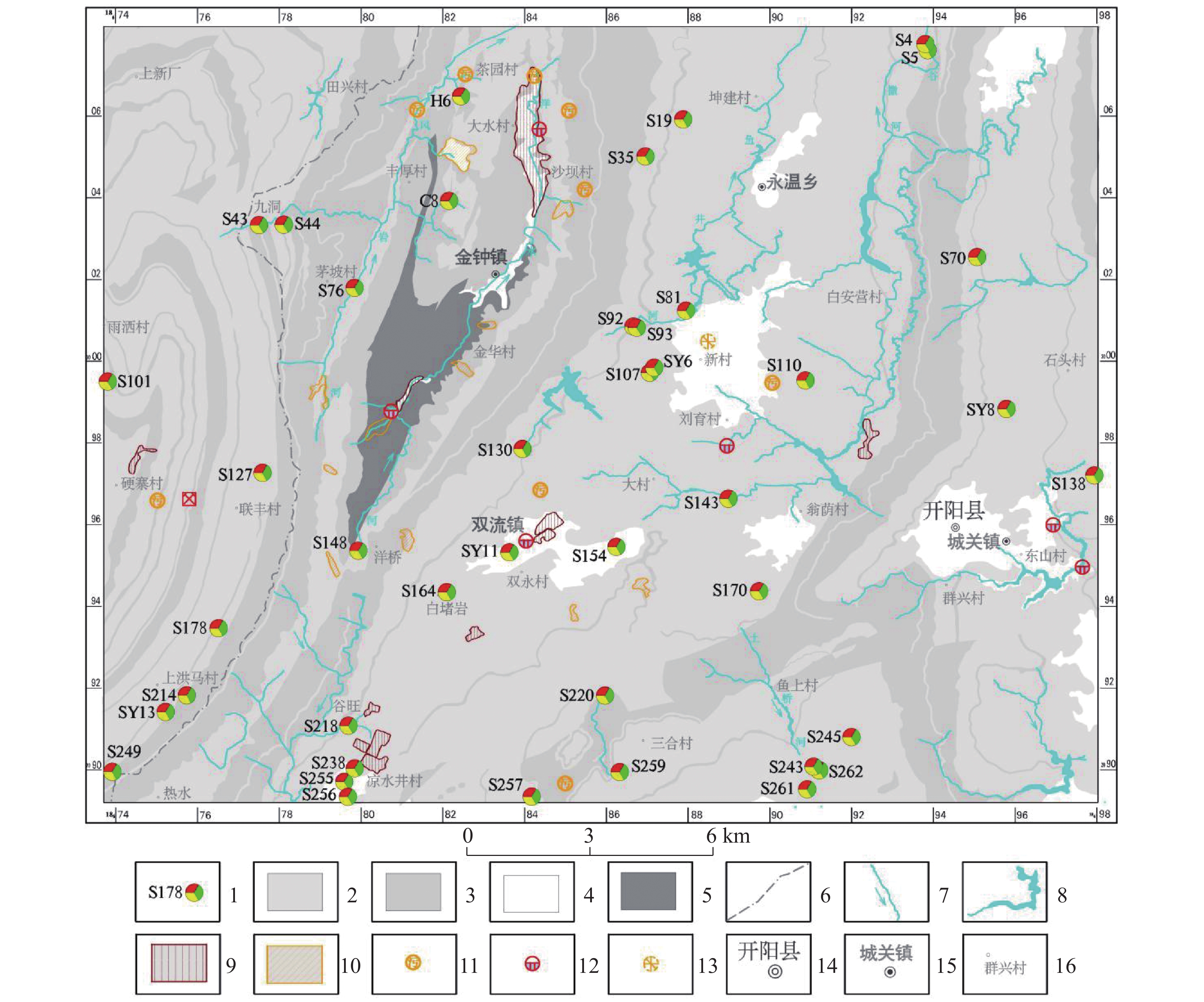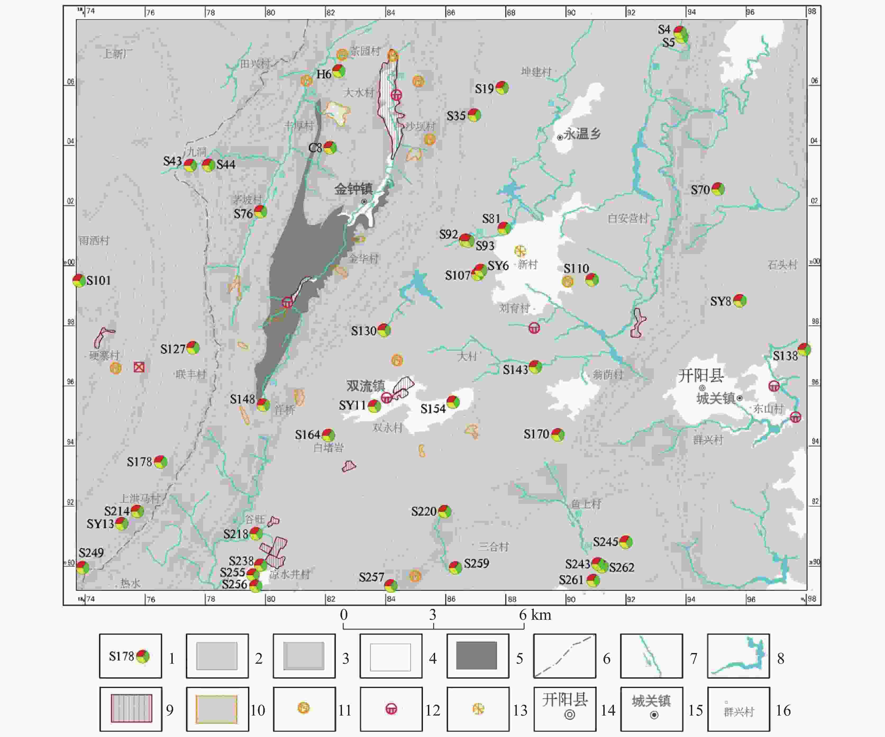 1.取样点及编号 2.碳酸盐岩区 3.碎屑岩区 4.第四系区 5.变质岩区 6.县域界线 7.河流水系 8.水库水域 9.工矿企业 10.工业固废堆场(依比例尺) 11.工业固废堆场 12.污水处理厂 13.垃圾堆场 14.县政府驻地 15.乡镇驻地 16.村寨驻地