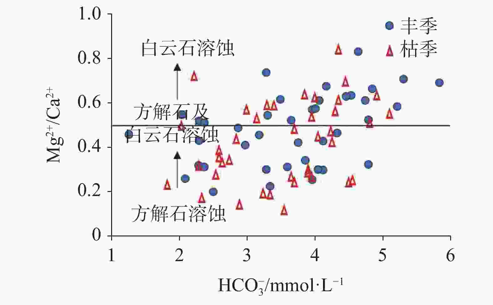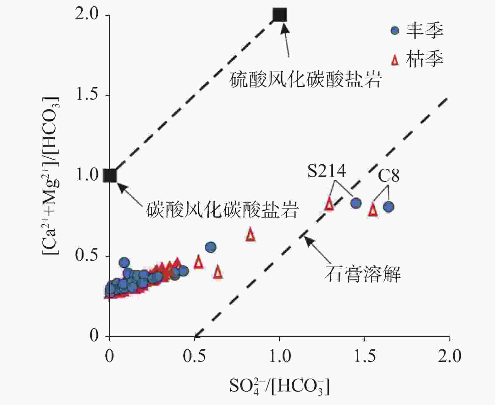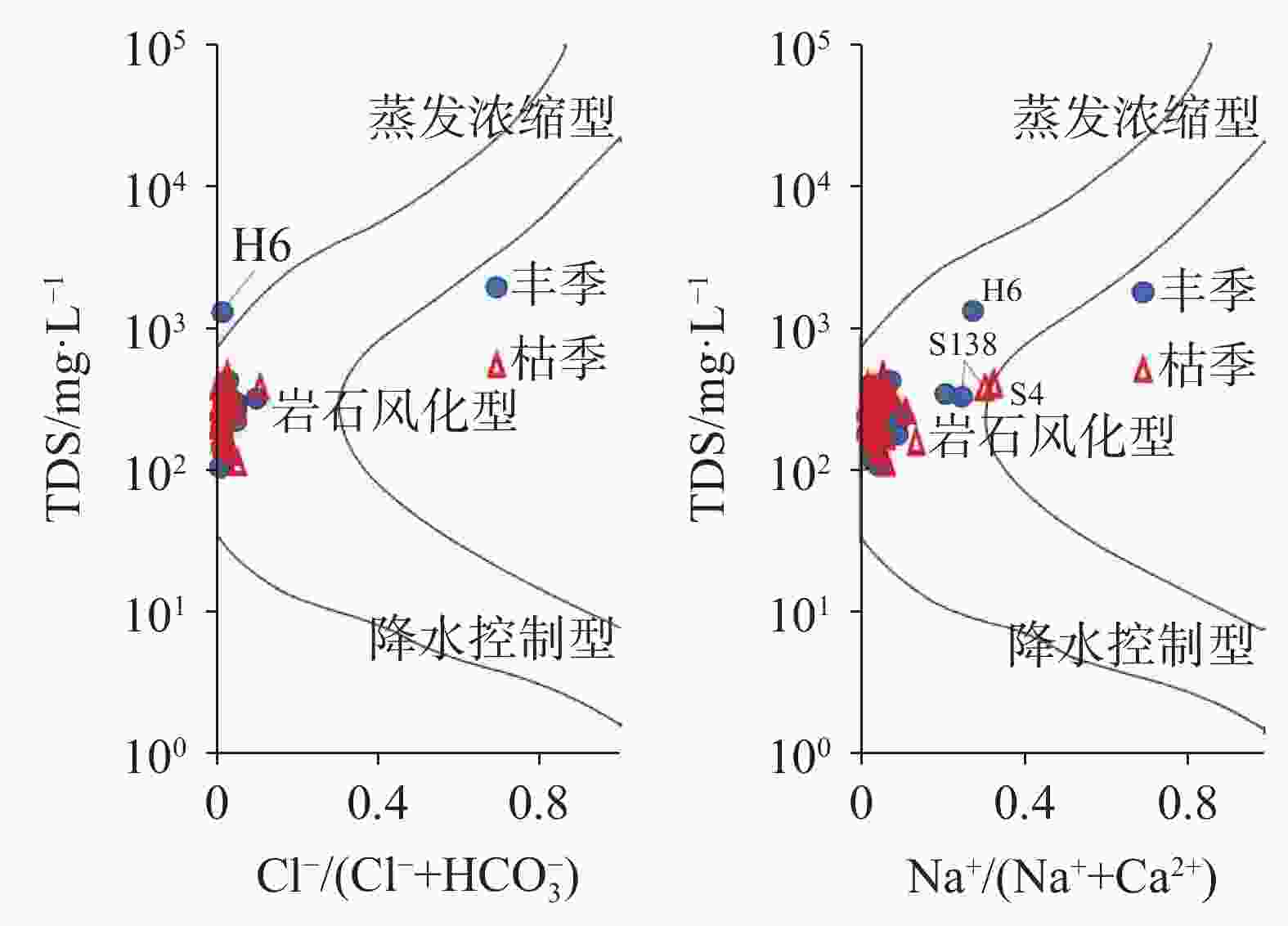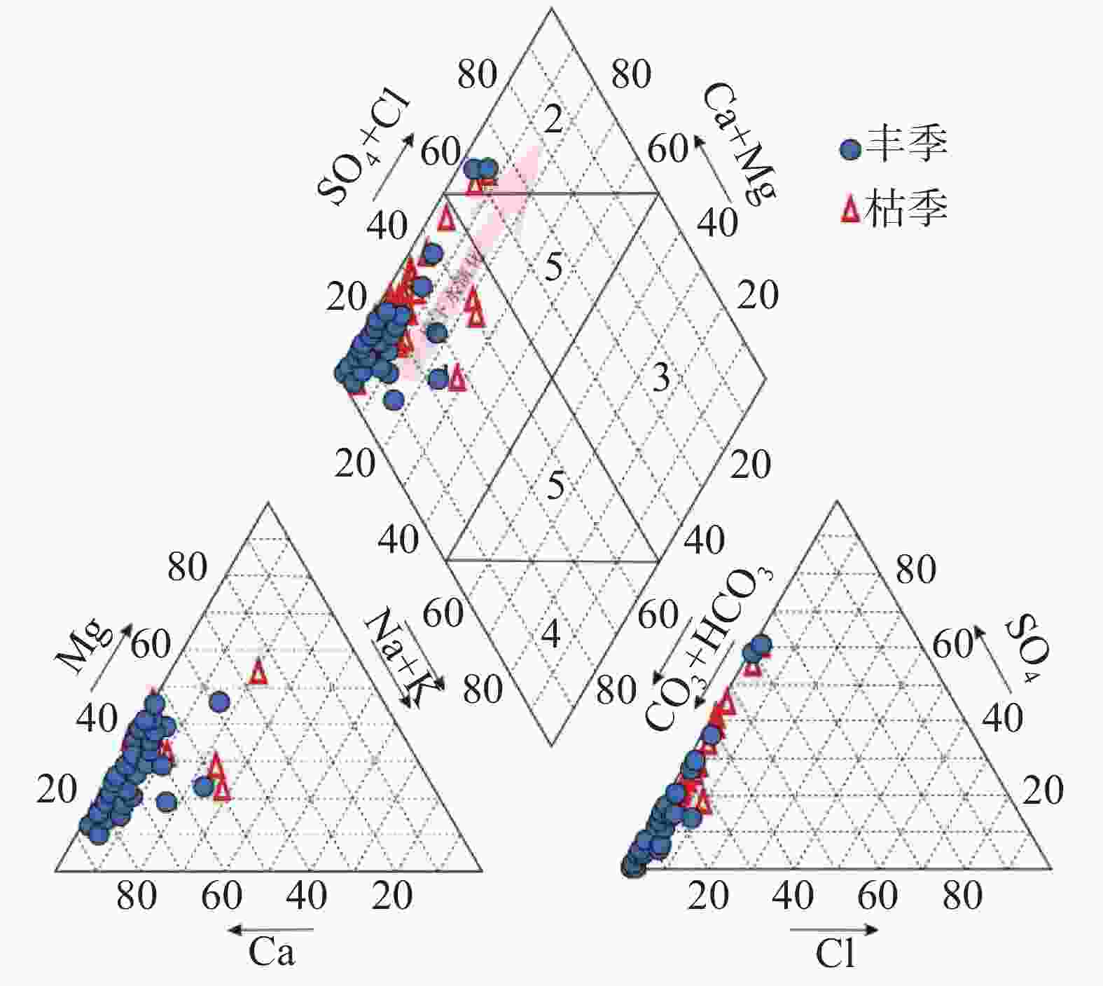 摘要: 文章基于区域水文地质、环境地质调查成果,对黔中岩溶区43个地下水点进行了枯水期和丰水期水样采集测试,利用地球化学图解及主成分分析(PCA)法,探讨该区枯水期和丰水期岩溶地下水水化学特征、离子来源及其影响因素。结果表明,该区地下水枯水期和丰水期的水化学特征及影响因素一致,水化学类型均以HCO3(SO4)-Ca(Mg)为主,吉布斯图解分析表明研究区岩溶地下水为岩石风化型,水化学组成主要来源于岩石风化淋滤溶解;[(Ca+Mg)/HCO3] - [ SO4/HCO3]图解分析认为研究区可溶性碳酸盐岩主要受碳酸的风化侵蚀作用控制,局部样品受石膏溶解影响显著;丰水期地下水主成分主要受水岩作用过程(PC1)、人类活动(PC2)及工业生产(PC3)等3类因素影响,这三个影响因素能够解释丰水期地下水水化学组分83.7%的特征;枯水期地下水主要受水岩作用过程(PC1*)和人类活动(PC2*)影响,这二类综合因子能够解释枯水期地下水化学组分85.1%的特征。水岩作用过程是该区地下水水化学组分最主要的影响因素。水岩作用主要影响K+、Na+、Ca2+、Mg2+、${\rm{HCO}}_3^{-}$、TP、F−、SiO2等8项水质指标,人类活动主要影响NH$_4^{+}$、CODMn及Cl−等3项水质指标,而磷矿开采主要影响${\rm{SO}}_4^{2-}$。研究成果深化了对黔中地区岩溶地下水水化学特征的认识,揭示了地下水离子组分来源及影响因素,研究成果对黔中岩溶区地下水资源的合理开发利用与保护具有积极的指导意义。Abstract: