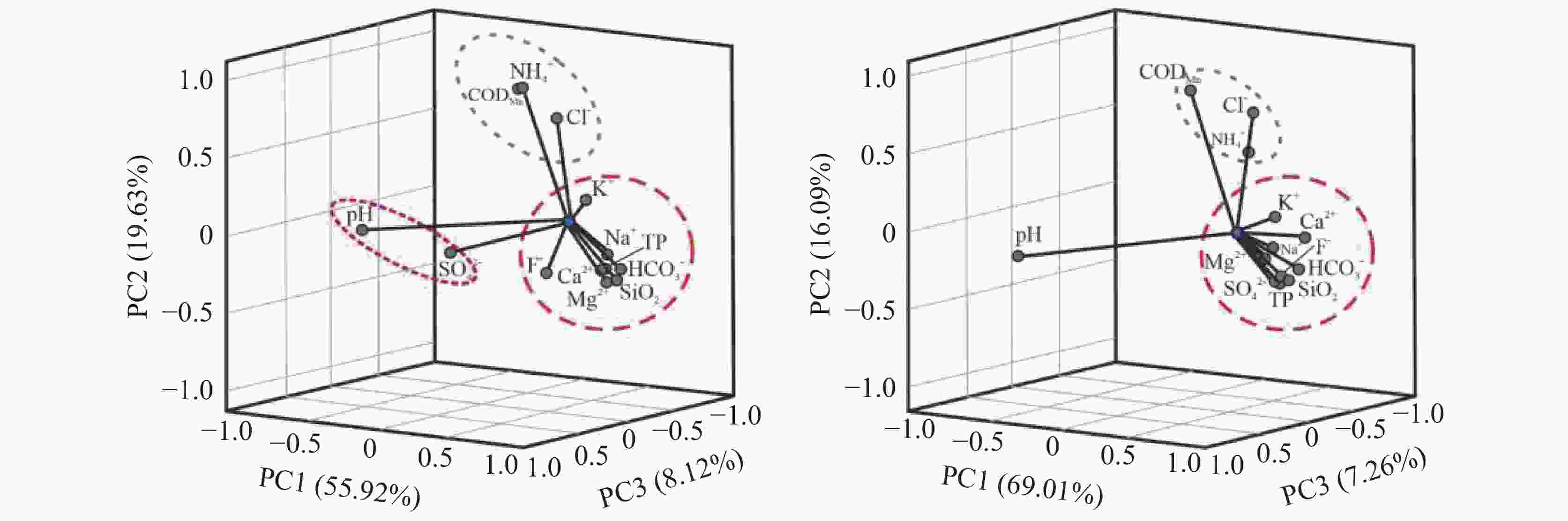 成分 PC1 PC2 PC3 PC4 PC5 PC6 PC7 PC8 PC9 PC10 PC11 PC12 PC13 特征值 7.269 2.552 1.055 0.661 0.614 0.329 0.17 0.102 0.095 0.076 0.042 0.03 0.004 方差百分数/% 55.918 19.628 8.115 5.088 4.725 2.535 1.306 0.788 0.729 0.588 0.324 0.228 0.029 累计方差百分数/% 55.92 75.55 83.66 88.75 93.48 96.01 97.32 98.10 98.83 99.42 99.74 99.97 100.0 表 4 枯水期地下水特征值、方差百分数和累计方差百分数