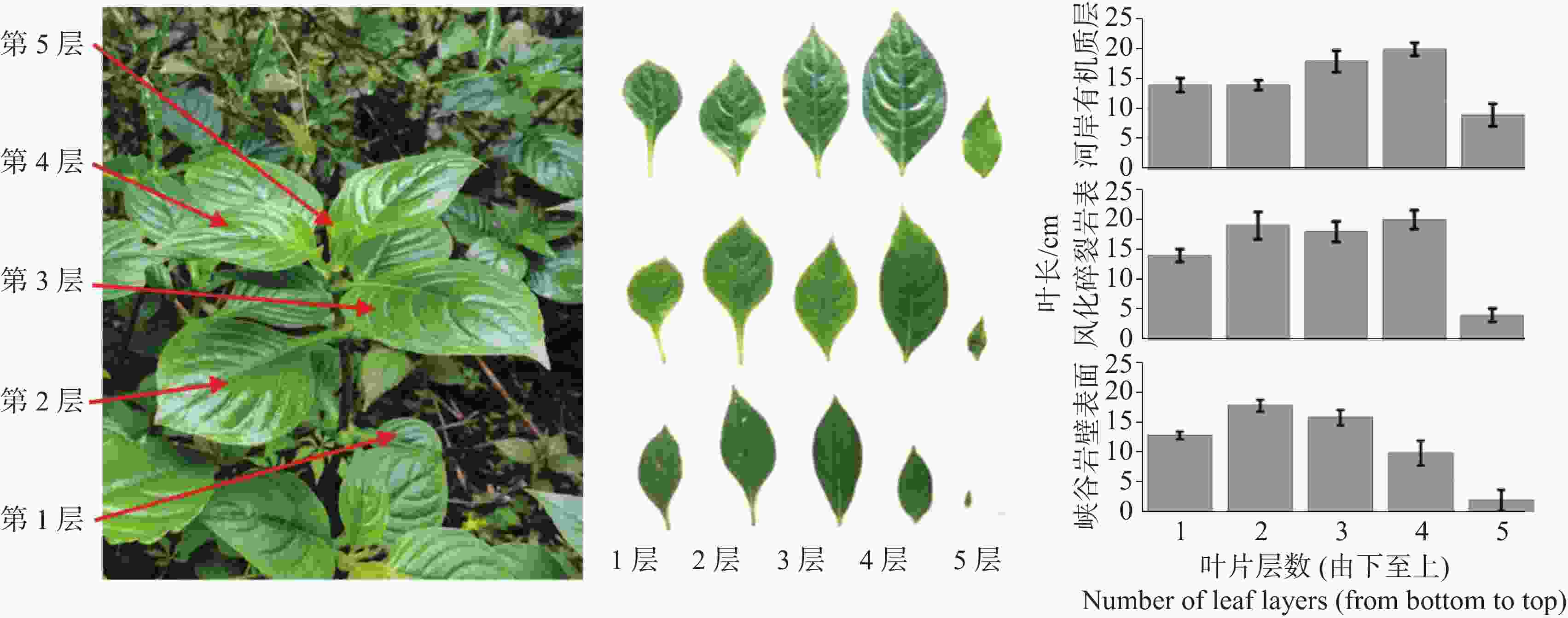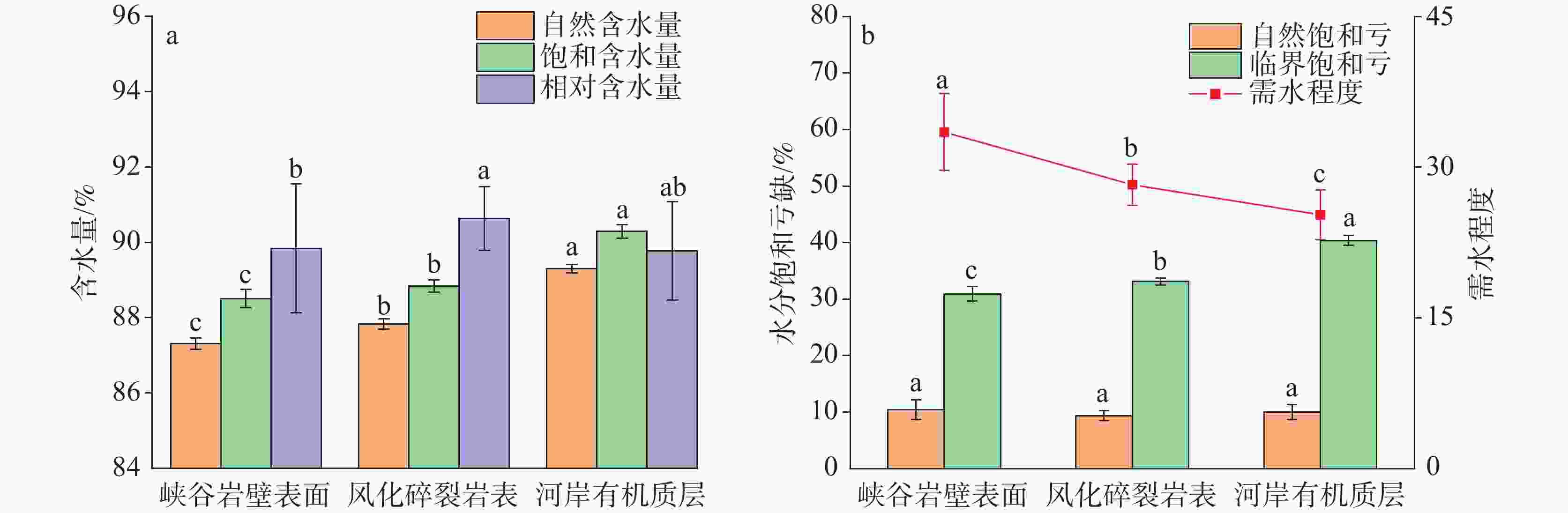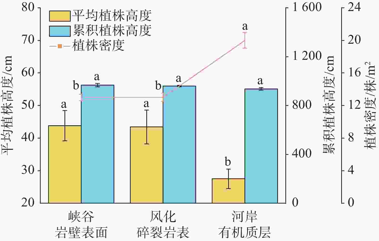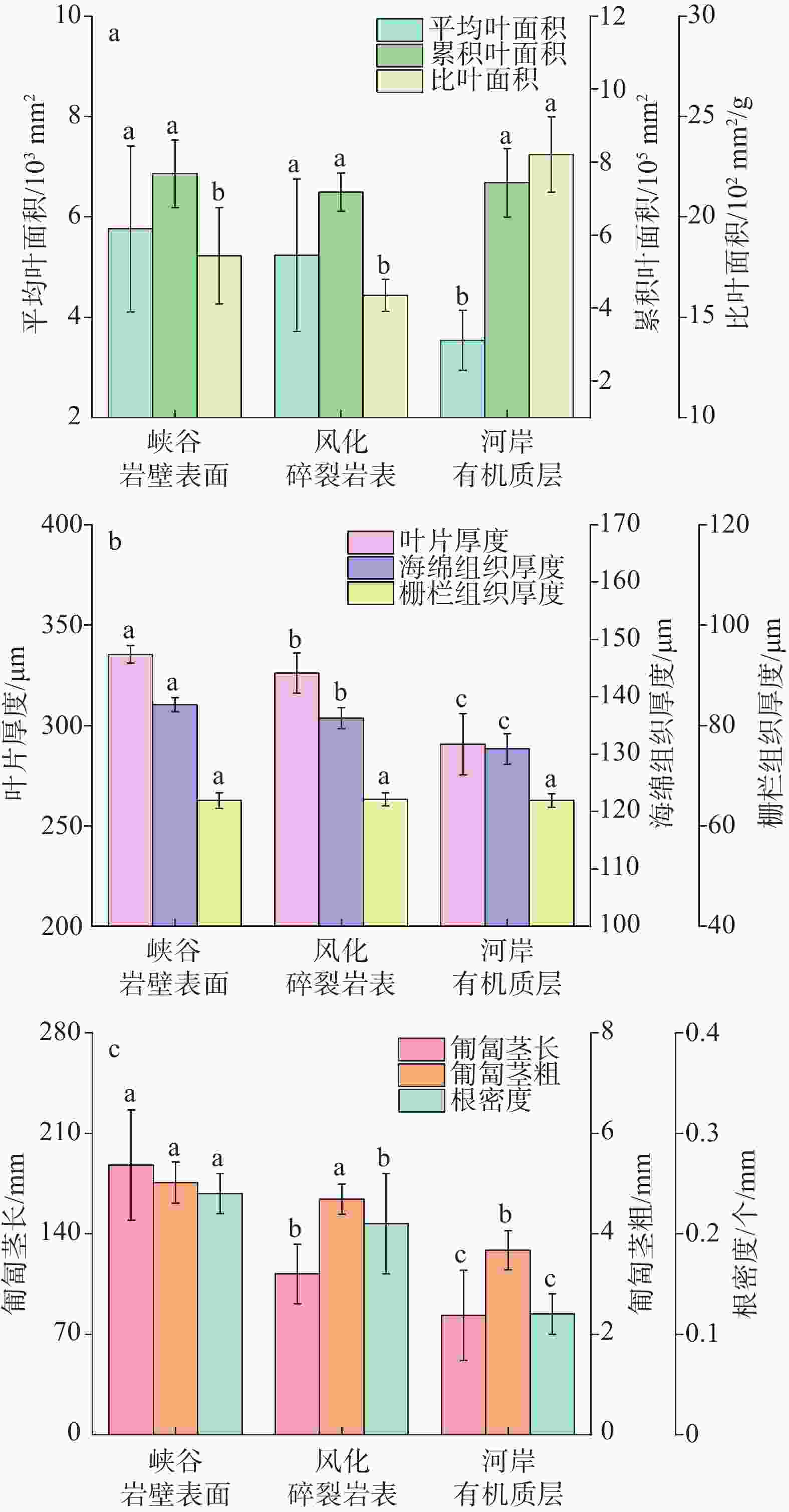 指标 Index 峡谷岩壁表面 风化碎裂岩表 河岸有机质层 水势/MPa −1.630 ± 0.047c −1.015 ± 0.041b −0.705 ± 0.025a 气孔密度/mm2 1518.00 ± 98.00c2198.24 ± 102.53b2299.00 ± 158.00a气孔导度/mol H2O·m−2·s−1 0.178 ± 0.045a 0.175 ± 0.069a 0.154 ± 0.085b 蒸腾速率/mmol H2O·m−2·s−1 1.601 ± 0.108a 1.739 ± 0.173a 1.704 ± 0.217a 胞间CO2浓度/μmol CO2·mol−1 420.988 ± 48.439a 414.436 ± 36.612a 394.325 ± 40.597a 气孔限制值/Ls 0.936 ± 0.031a 0.876 ± 0.086b 0.804 ± 0.080b 净光合速率/μmol CO2·m−2·s−1 4.820 ± 0.537b 6.075 ± 0.468a 6.923 ± 1.663a 水分利用效率/μmol CO2·mmol−1 H2O 3.029 ± 0.461b 3.519 ± 0.377ab 4.134 ± 0.333a 注:同行不同小写字母表示差异显著性(P<0.05)。