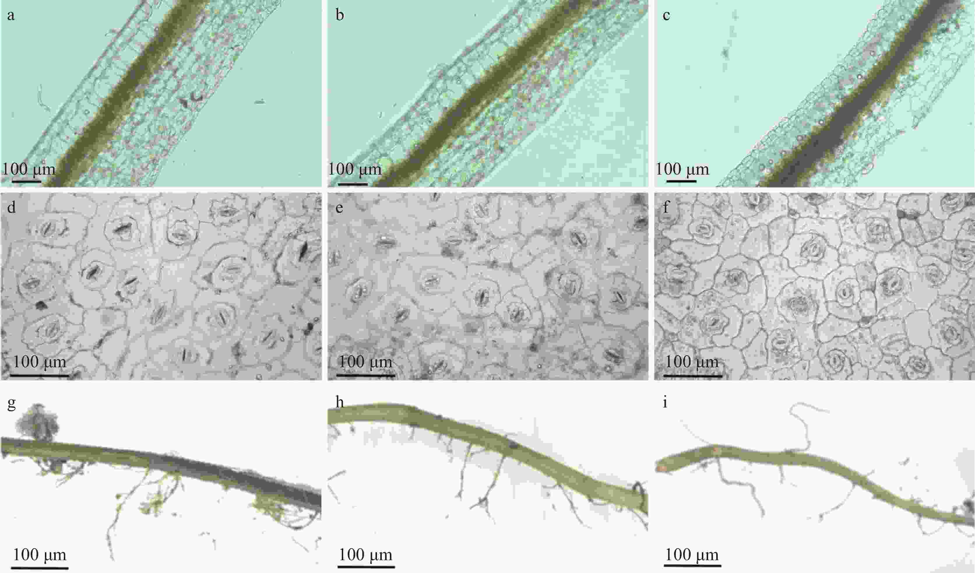 注:A. 峡谷岩壁表面半蒴苣苔叶片的横切 B. 风化碎裂岩表半蒴苣苔叶片的横切 C. 河岸有机质层半蒴苣苔叶片的横切 D. 峡谷岩壁表面半蒴苣苔叶片的气孔密度 E. 风化碎裂岩表半蒴苣苔叶片的气孔密度 F. 河岸有机质层半蒴苣苔叶片的气孔密度 G. 峡谷岩壁表面半蒴苣苔的根茎形态 H. 风化碎裂岩表半蒴苣苔的根茎形态 I. 河岸有机质层半蒴苣苔的根茎形态