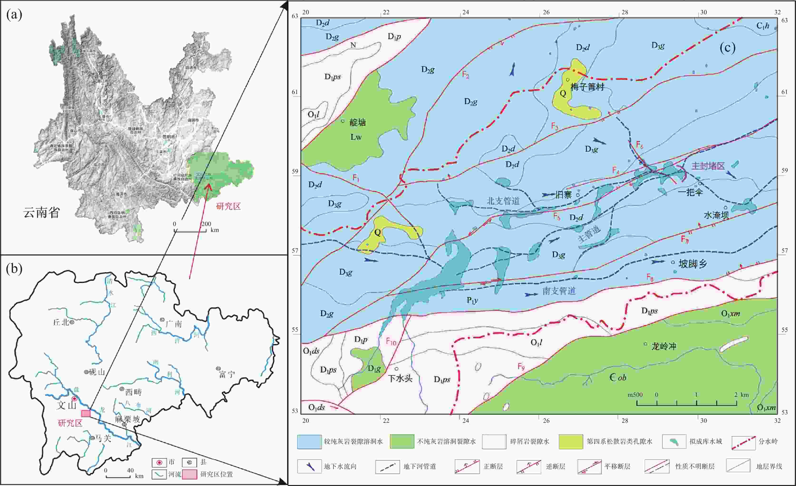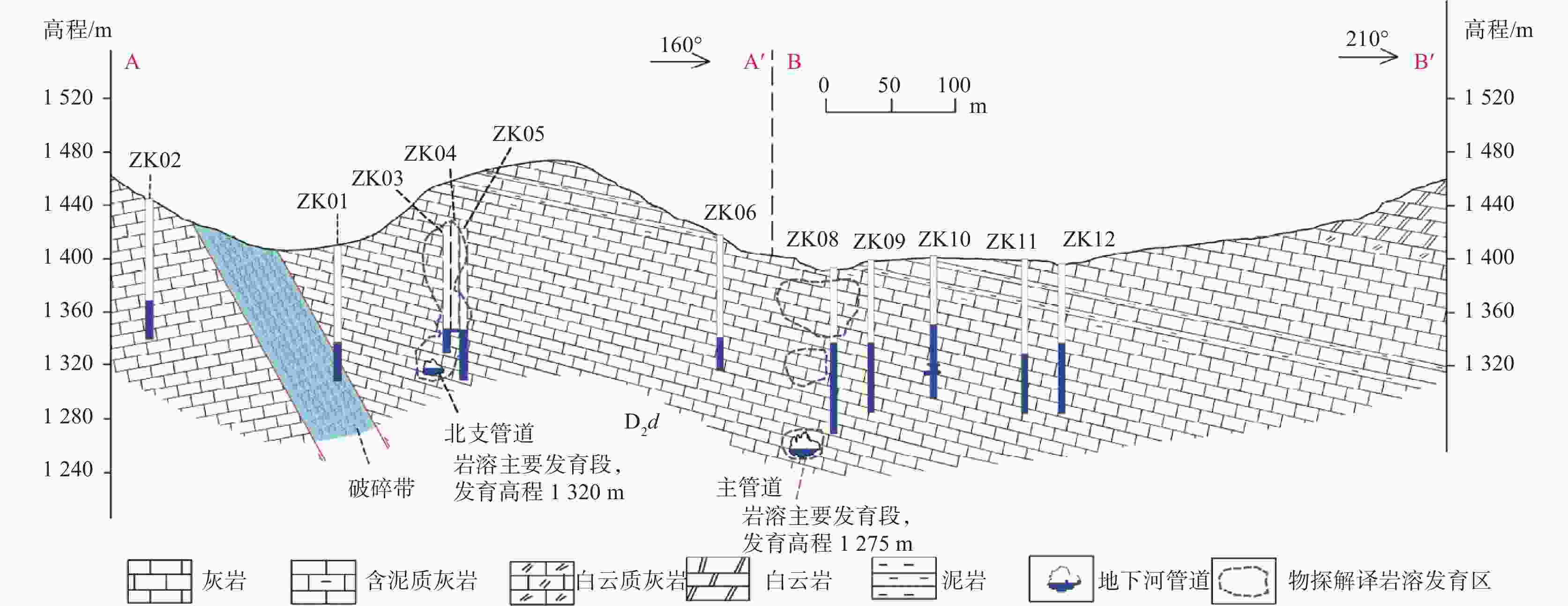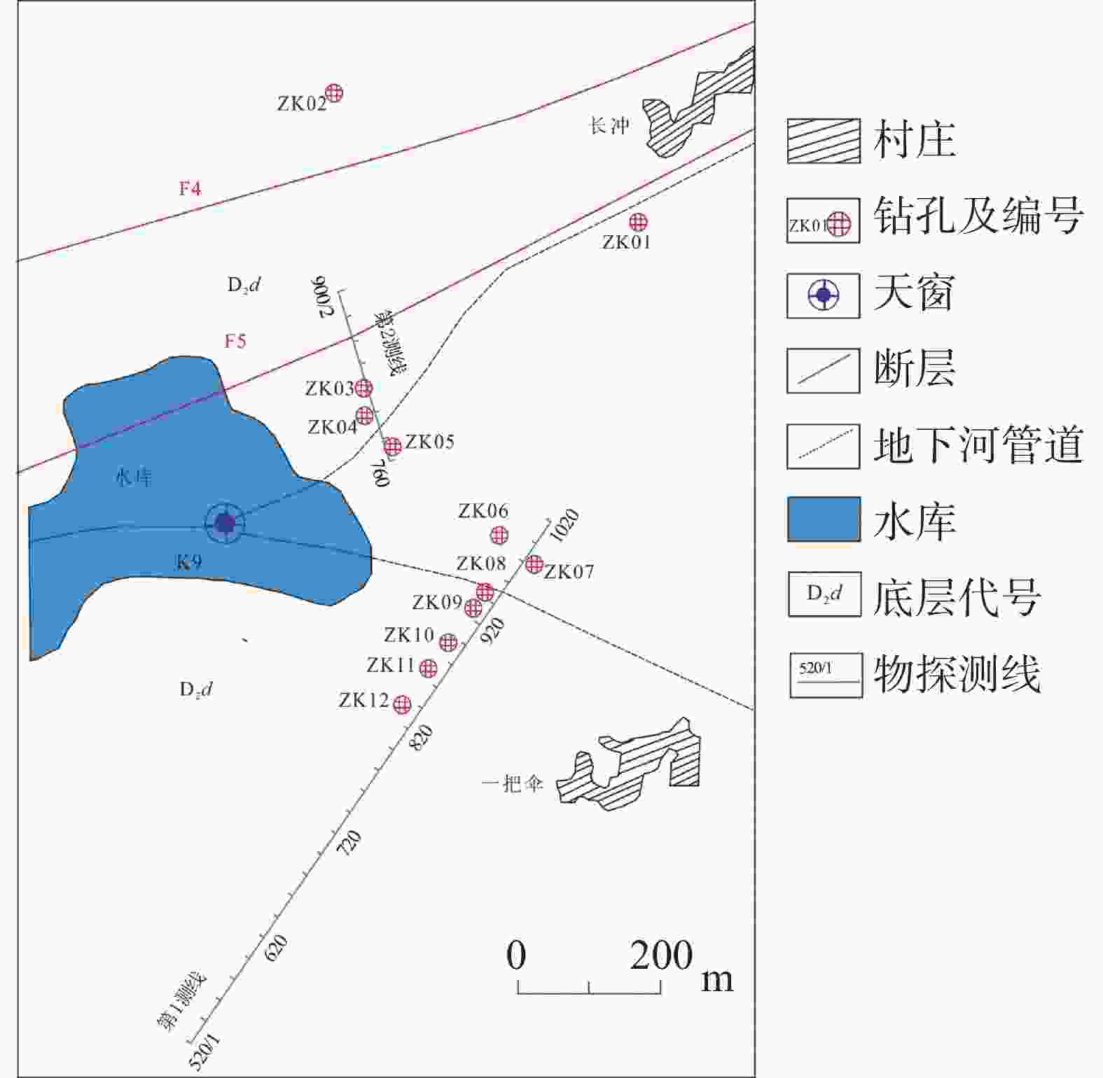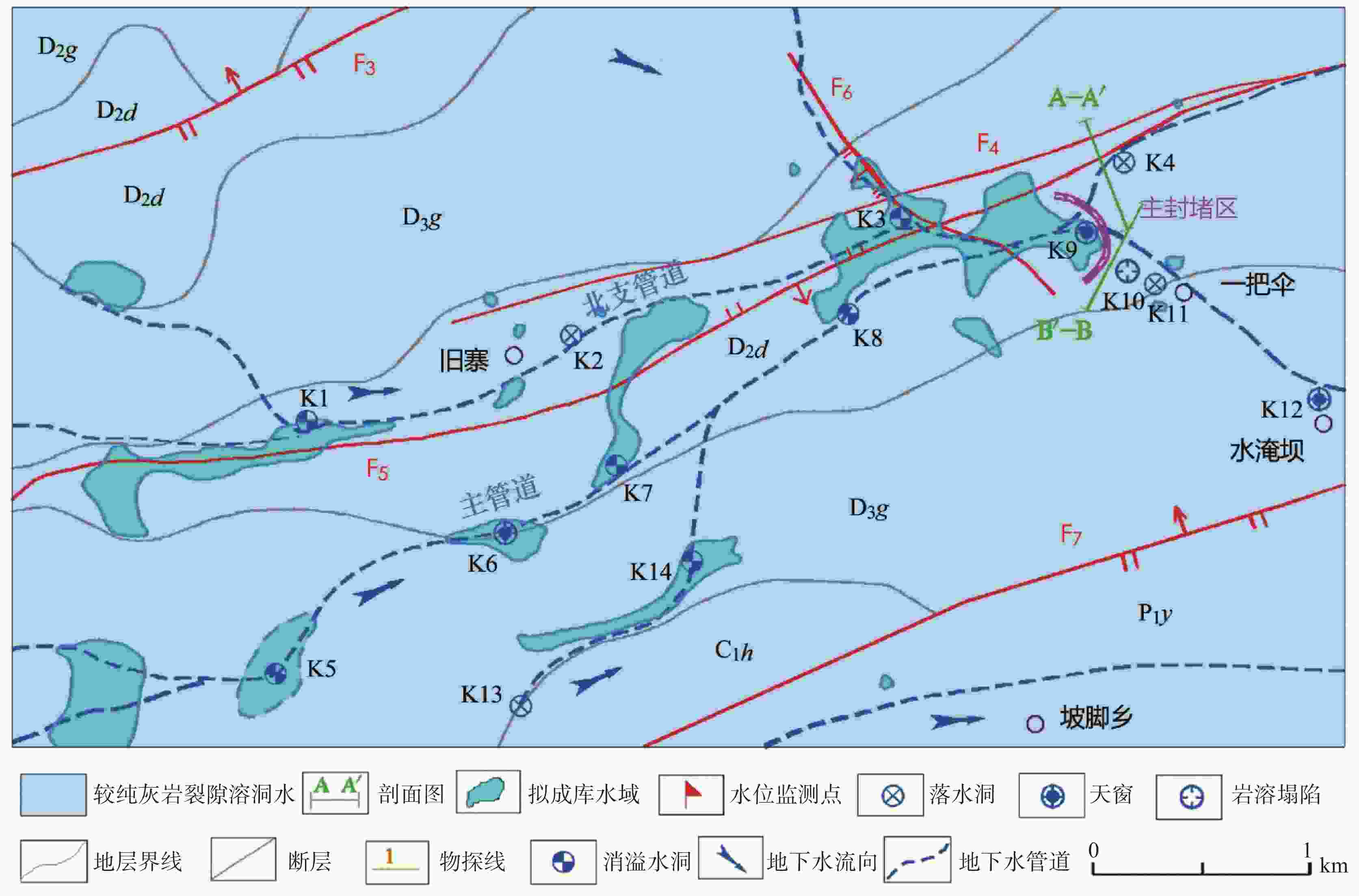 摘要: 水库渗漏是岩溶地区兴建水利枢纽关键的病害问题之一,以一把伞水库主封堵区为例,水文地质调查、地下水位动态监测、地球物理探测和钻探相互验证,分析主封堵区水文地质条件,识别岩溶渗漏管道位置及发育特征。结果表明:主封堵区岩溶渗漏带发育于泥盆系东岗岭组(D2d)较纯碳酸盐岩,SW至NE向压扭性断层构成南北隔水边界,东西两侧为透水地层,上游地下河至主封堵区汇流后又迅速分为南东、北东支流。岩溶渗漏带包括主管道以及北支管道,渗漏管道发育位置受断层作用控制显著。研究揭示了岩溶渗漏的季节变化规律,提出了主管道与北支管道的渗漏条件,并分析了渗漏管道分布特征、规模及充填性质,为一把伞水库主封堵区渗漏防范提供科学依据,并为岩溶地区类似渗漏病害问题的治理提供借鉴意义。Abstract: