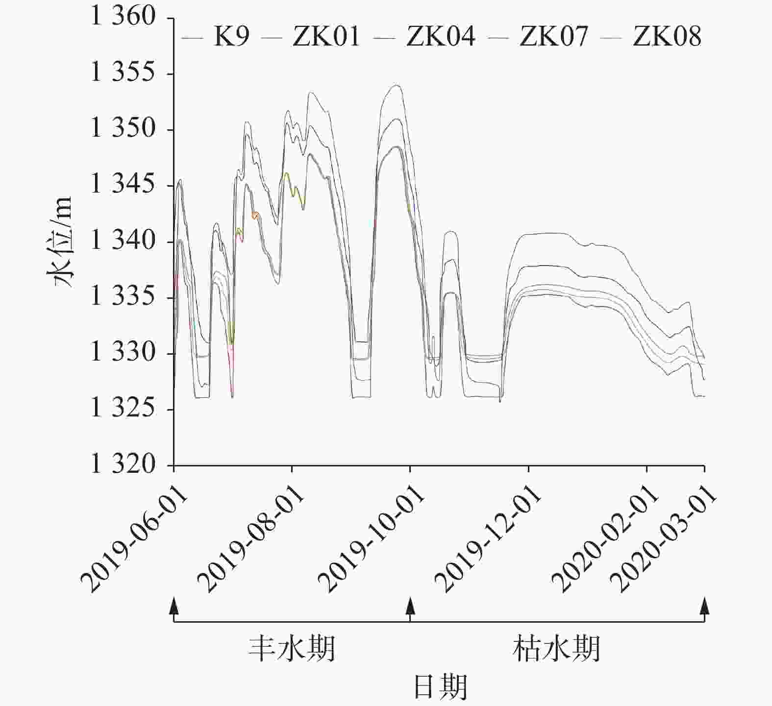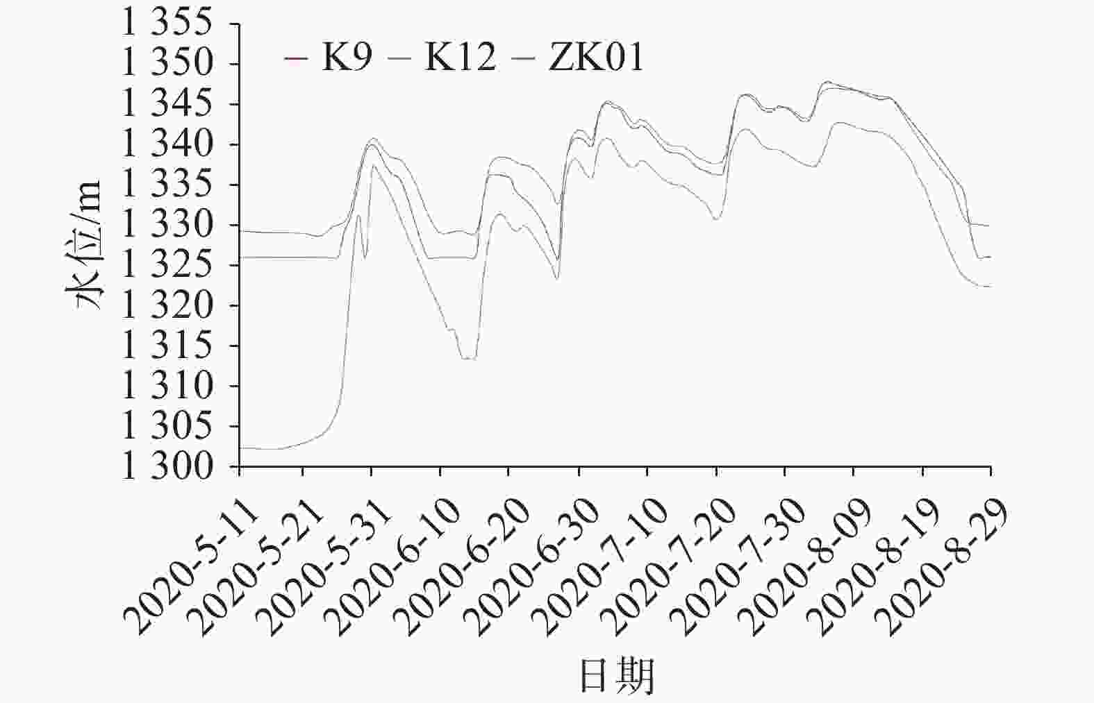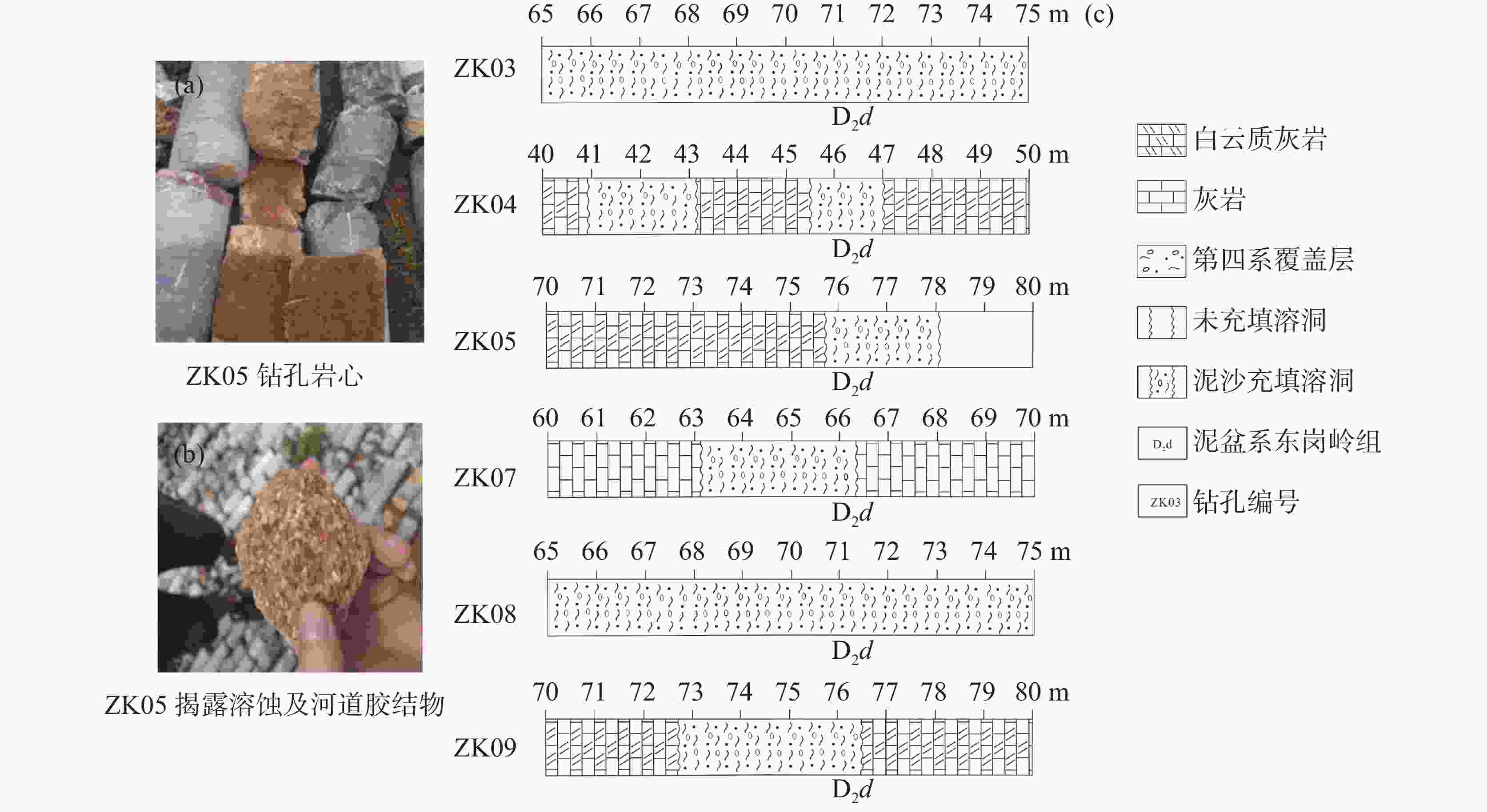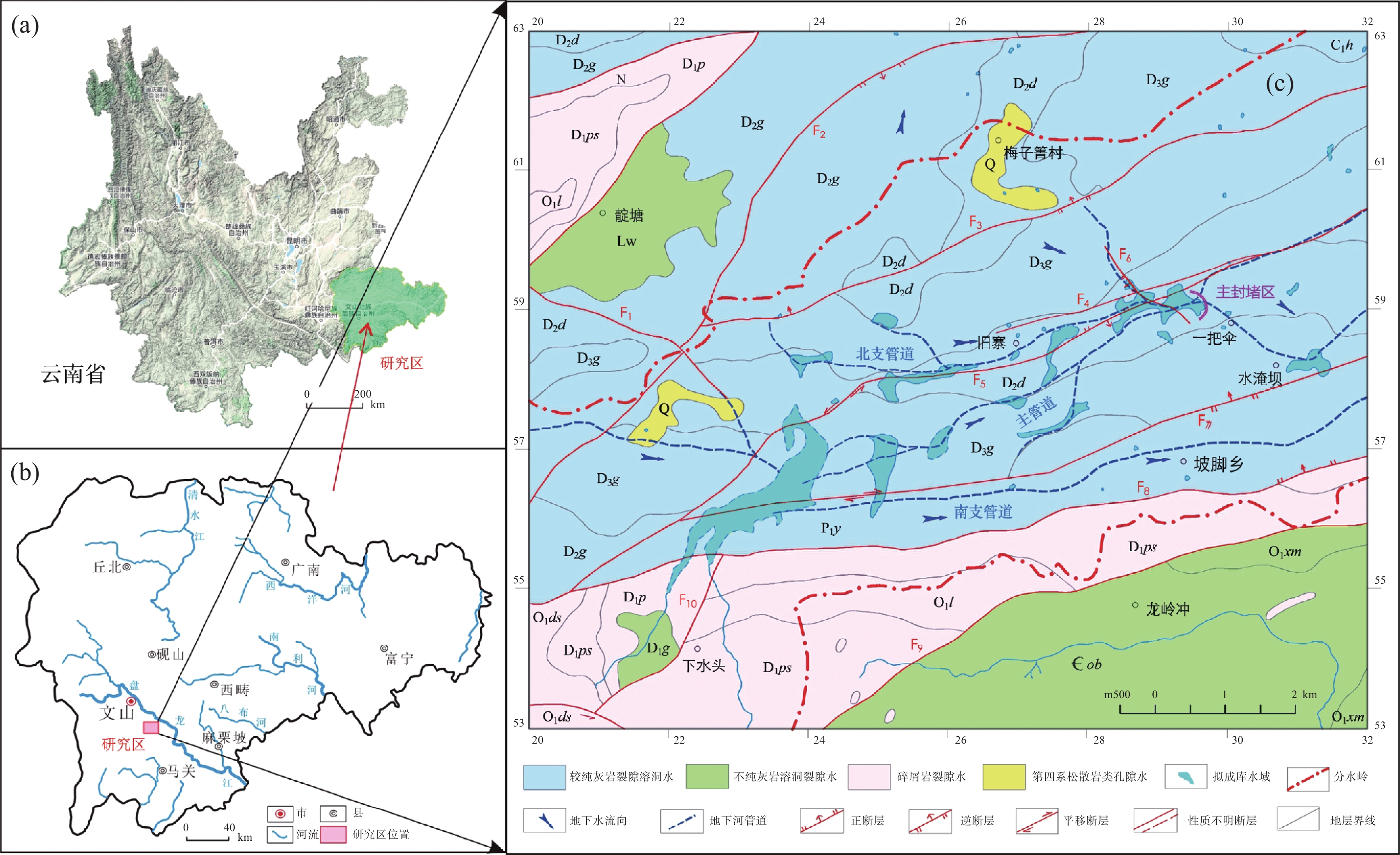 摘要: 水库渗漏是岩溶地区兴建水利枢纽关键的病害问题之一,以一把伞水库主封堵区为例,水文地质调查、地下水位动态监测、地球物理探测和钻探相互验证,分析主封堵区水文地质条件,识别岩溶渗漏管道位置及发育特征。结果表明:主封堵区岩溶渗漏带发育于泥盆系东岗岭组(D2d)较纯碳酸盐岩,SW至NE向压扭性断层构成南北隔水边界,东西两侧为透水地层,上游地下河至主封堵区汇流后又迅速分为南东、北东支流。岩溶渗漏带包括主管道以及北支管道,渗漏管道发育位置受断层作用控制显著。研究揭示了岩溶渗漏的季节变化规律,提出了主管道与北支管道的渗漏条件,并分析了渗漏管道分布特征、规模及充填性质,为一把伞水库主封堵区渗漏防范提供科学依据,并为岩溶地区类似渗漏病害问题的治理提供借鉴意义。Abstract: