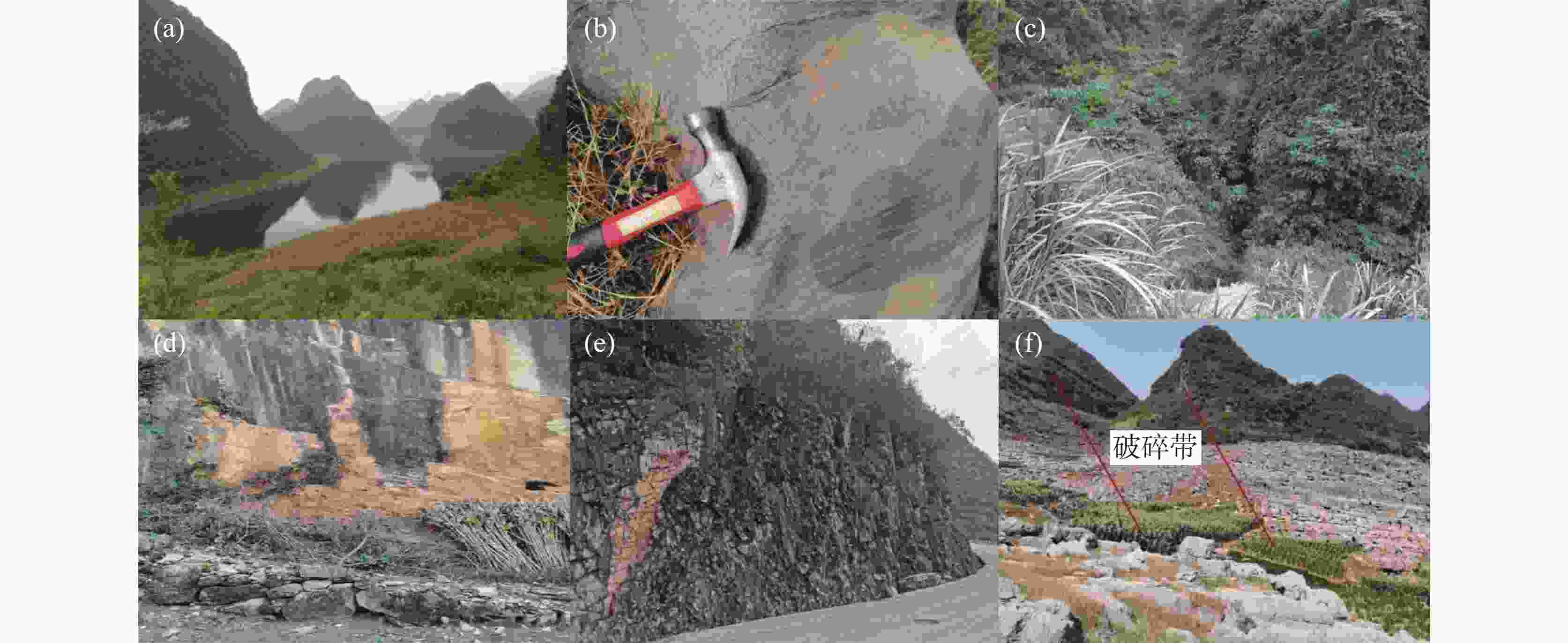 1 (a) 一把伞水库地貌特征,(b) 水库附近出露灰岩,(c) 水库附近落水洞,(d) F3沿线断层面紧闭, (e) F7断层沿线发育紧闭裂隙,(f) F5断层影响宽度达80 m