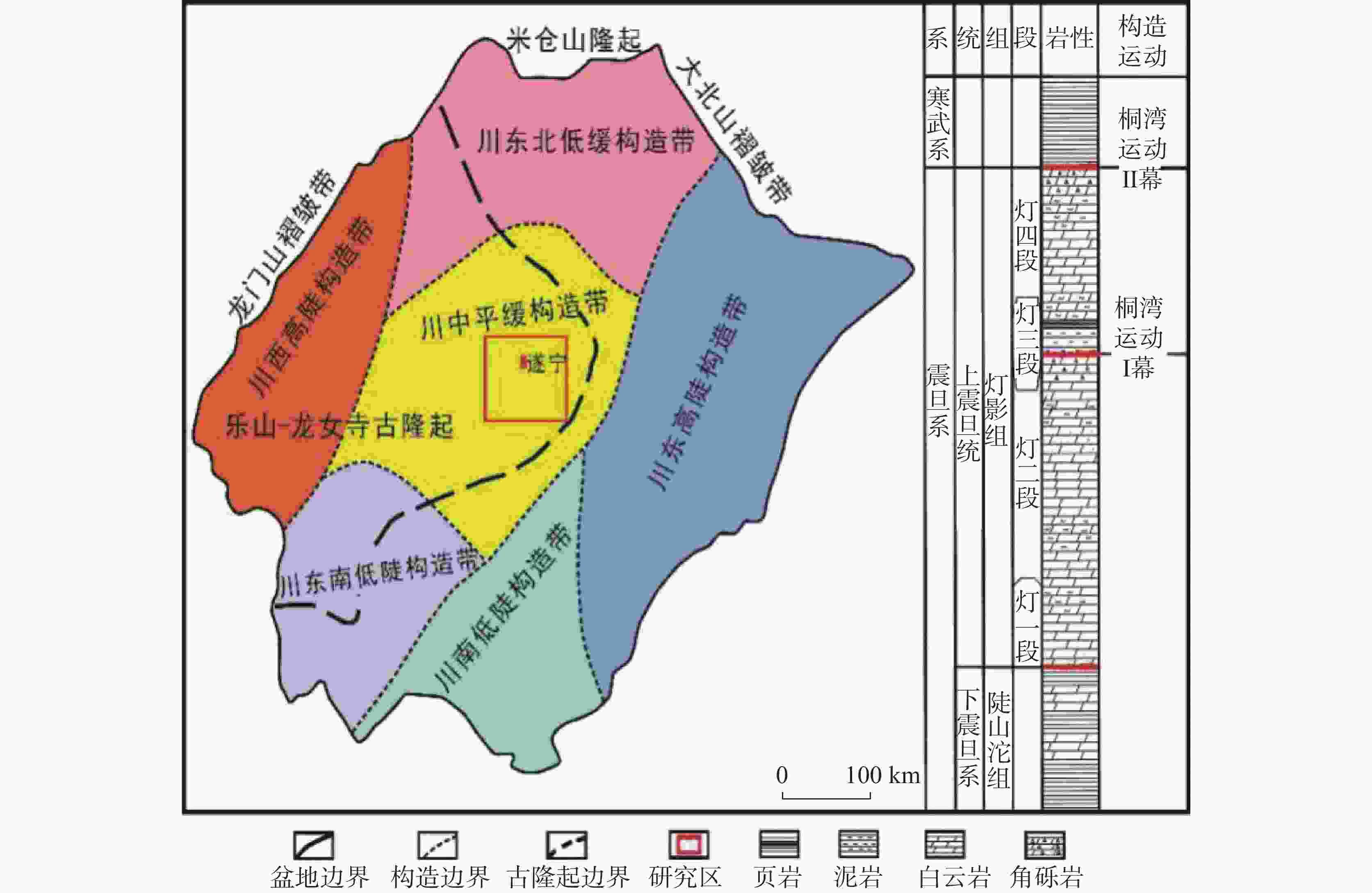 Figure  1.  Location of the study area and comprehensive stratigraphic histogram of the Dengying Formation (Modified according to ZHOU Zheng et al[4])