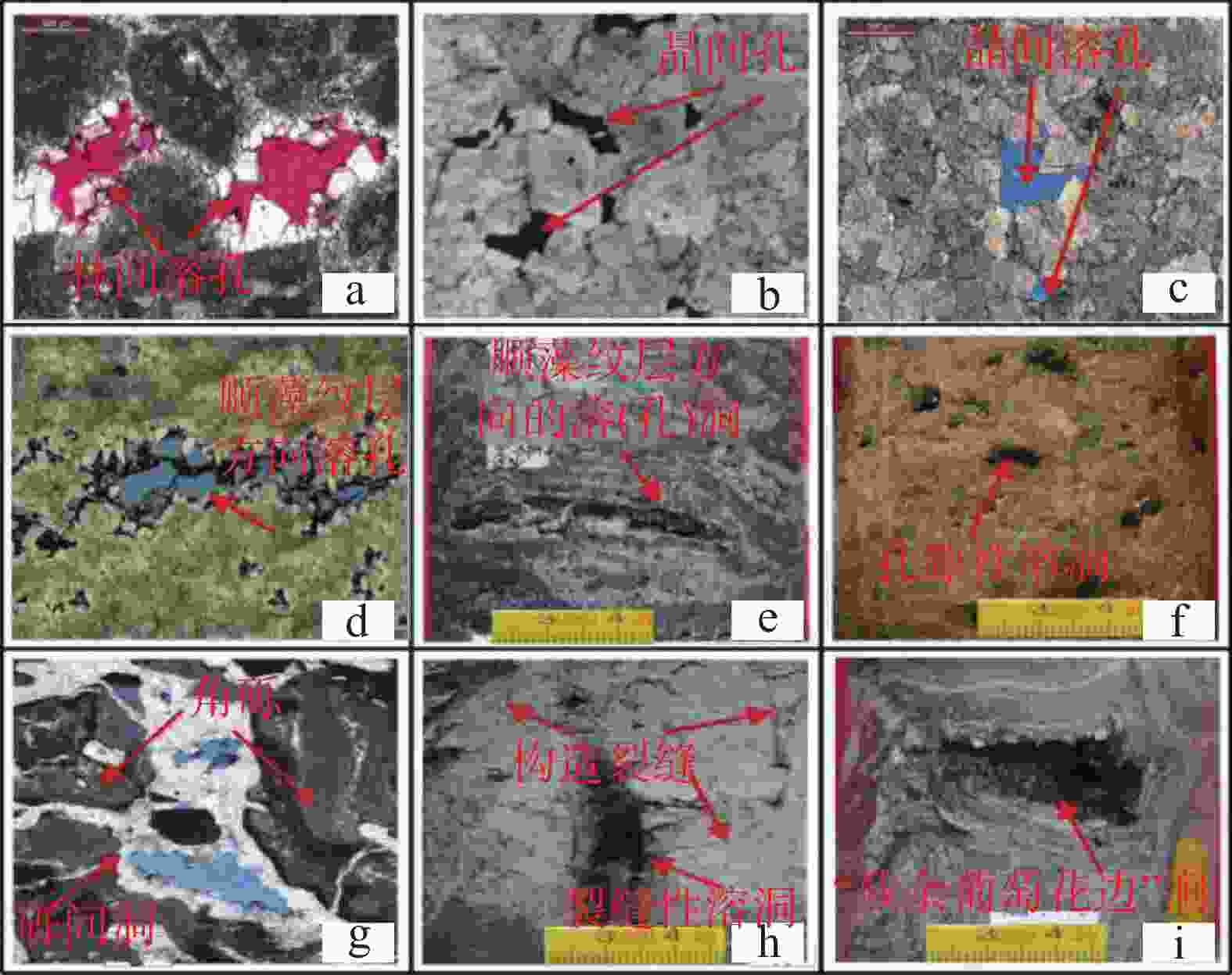 a.粒间溶孔,GK1井,5 443.33 m b.晶间孔,Z2井,3706.20 m,×5 (-) c.晶间溶孔,灯四段,先锋剖面 d.藻叠层白云岩,分布有顺藻纹层的溶孔、溶洞,且被白云石和沥青半充填,MX8,5482.76 m,(-),×10 e.顺藻纹层方向的溶(孔)洞, Z6井,5 149.98 m f.孔隙型溶洞, Z4井, 5 486.00 m g砾间洞,洞内被白云石充填,GK1井,5 296.00 m, (+),×1 h.构造裂缝与裂缝型溶洞, GK1井, 5 302.00 m i.残余“葡萄花边”洞,威117井,3 067.6 m