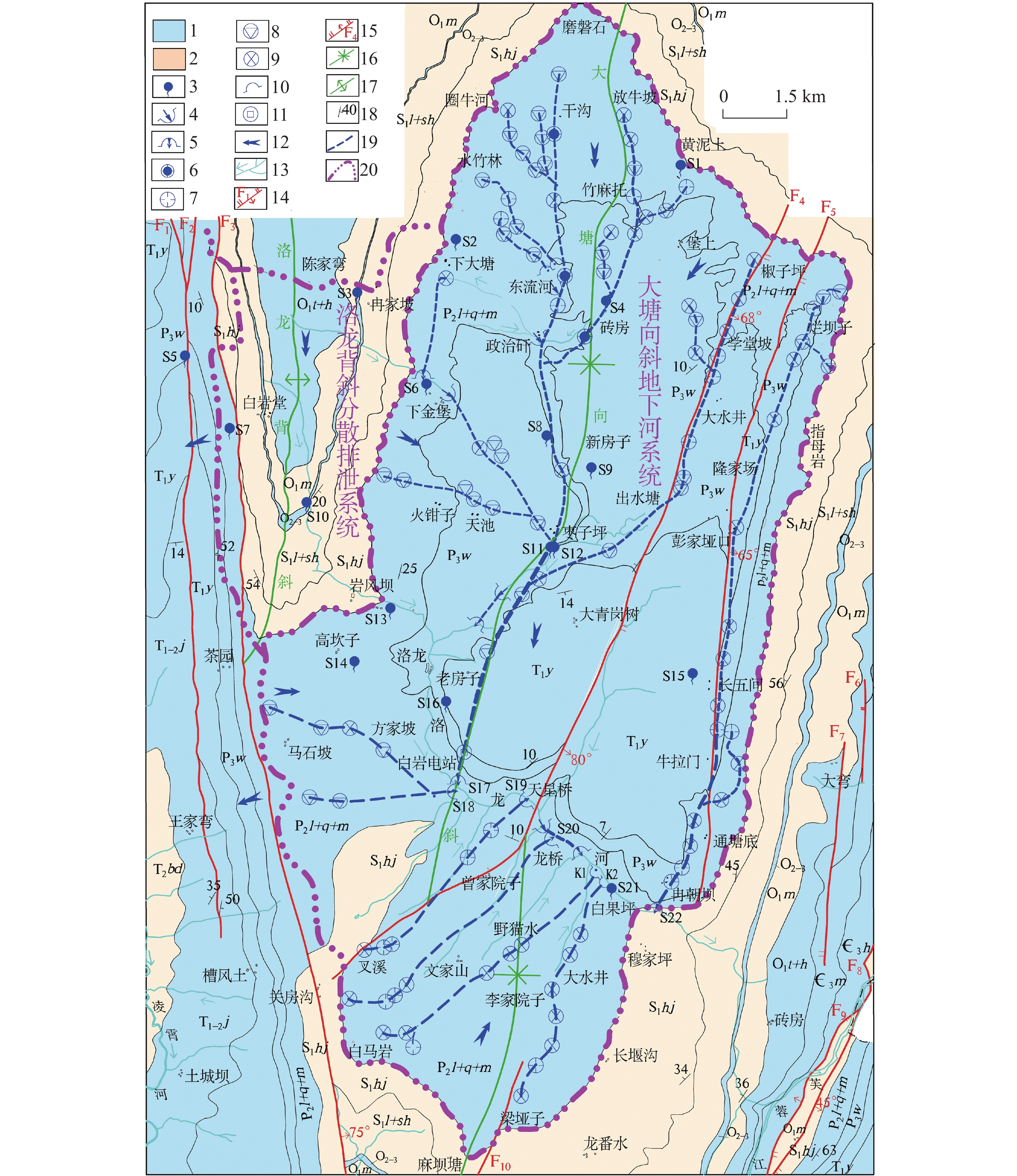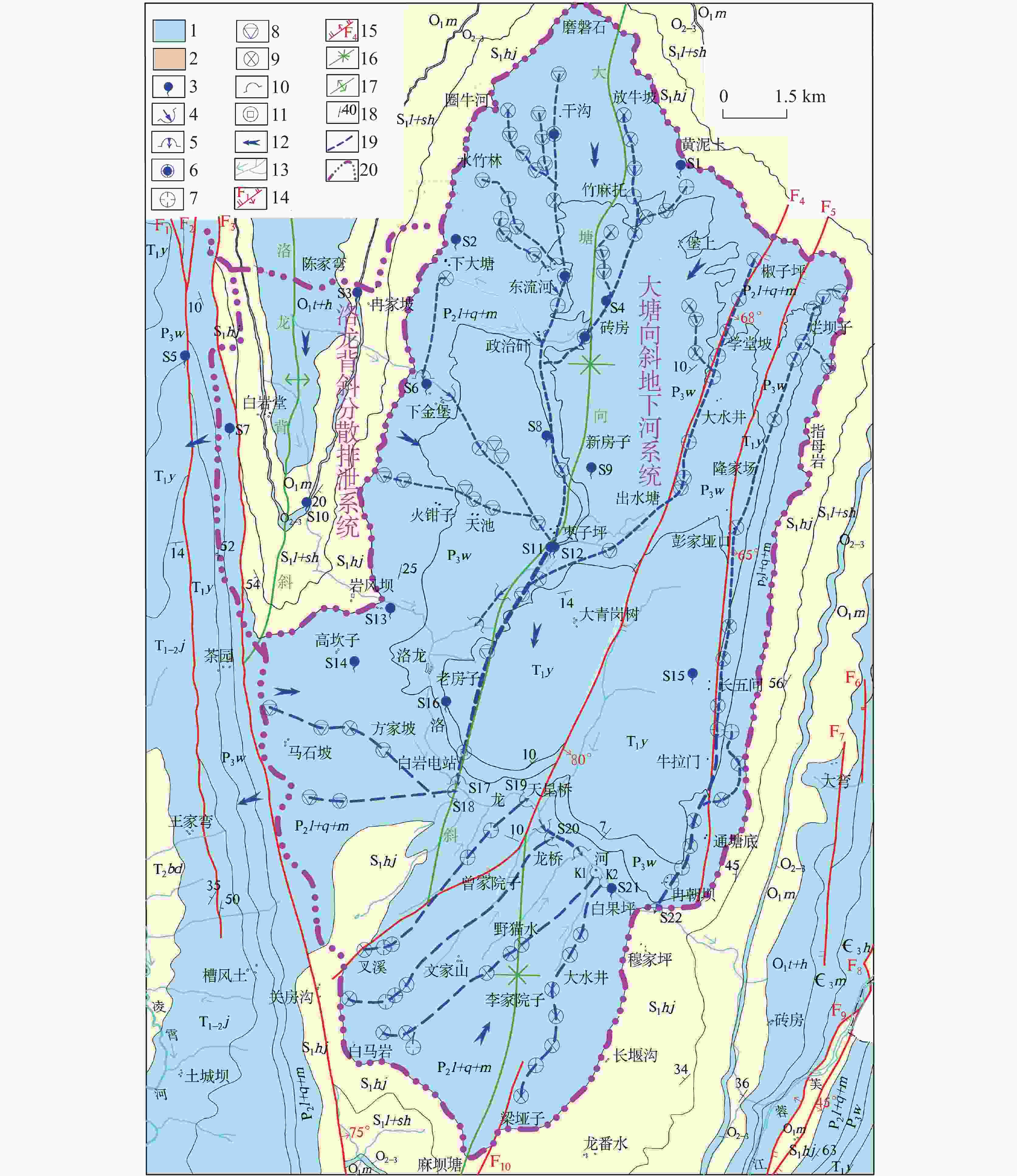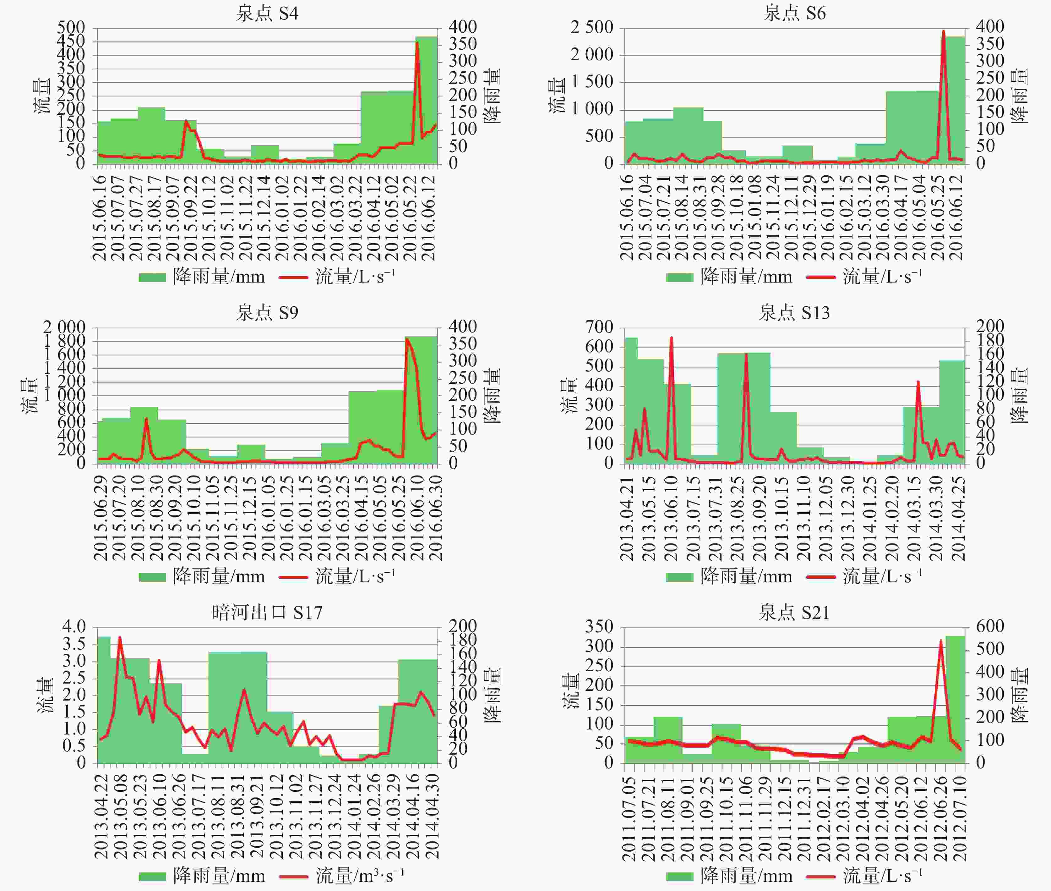 排泄点编号 S17 S13 S21 S6 S4 S9 丰水期平均流量/L∙s−1 1350 69.83 66.16 155 53.82 248.81 枯水期平均流量/L∙s−1 190 12.36 33.43 45 12.29 32.89 丰枯变幅系数/L∙s−1 7.11 5.65 1.98 3.44 4.38 7.57 观测期 最大流量/L∙s−1 3710 649.83 315.15 2440 446.57 1834.8 最小流量/L∙s−1 103 5.7 18.19 20 7.36 27.56 平均流量/L∙s−1 1150 54.90 54.93 121 40.53 177.82 极平变幅系数(倍) 3.23 11.84 5.74 20.17 11.02 10.32 极值变幅系数(倍) 36.02 114 17.33 122 60.68 66.57 表 2 水样中主要离子浓度统计表(单位:mg∙L−1)