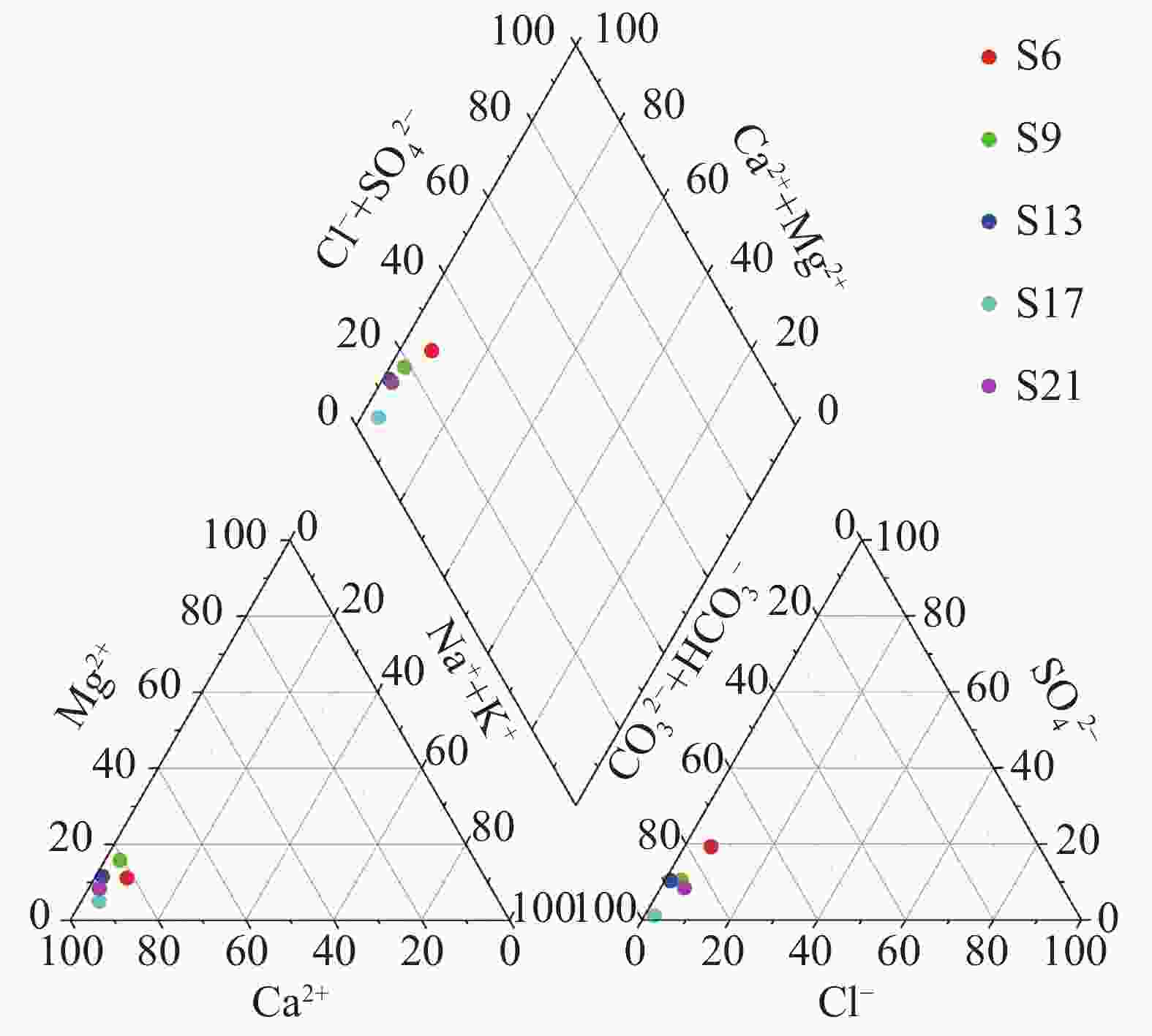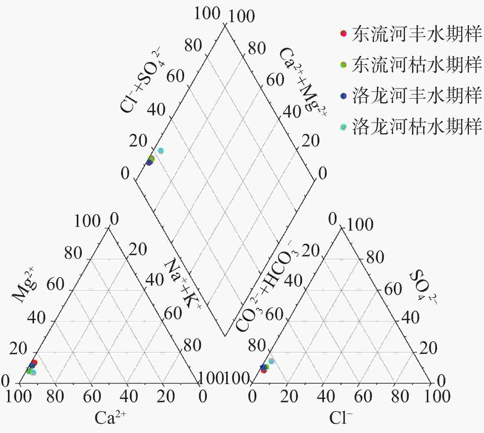 取样地点 K+ Na− Ca2+ Mg2+ Cl− ${\rm{SO}}_4^{2-}$ ${\rm{HCO}}_3^{-}$ ${\rm{CO}}_3^{2-}$ S6 0.74 2.02 27.78 2.26 3.97 17.17 84.37 0.00 S9 0.68 0.44 25.54 2.98 1.78 7.16 73.99 0.00 S13 0.4 0.44 43.22 3.40 1.08 11.61 126.25 0.00 S17 0.63 3.85 90.38 2.98 3.59 2.68 273.54 0.00 S21 0.33 1.67 65.76 3.67 6.61 14.00 182.32 0.00 东流河 丰水期 0.49 0.37 36.94 3.46 1.74 8.34 111.78 0.00 枯水期 0.33 0.44 38.30 2.00 2.07 11.00 117.63 0.00 洛龙河 丰水期 0.7 5.68 34.81 1.70 1.39 20.04 110.06 0.00 枯水期 0.76 1.83 47.93 2.24 3.50 18.03 131.05 0.00 -