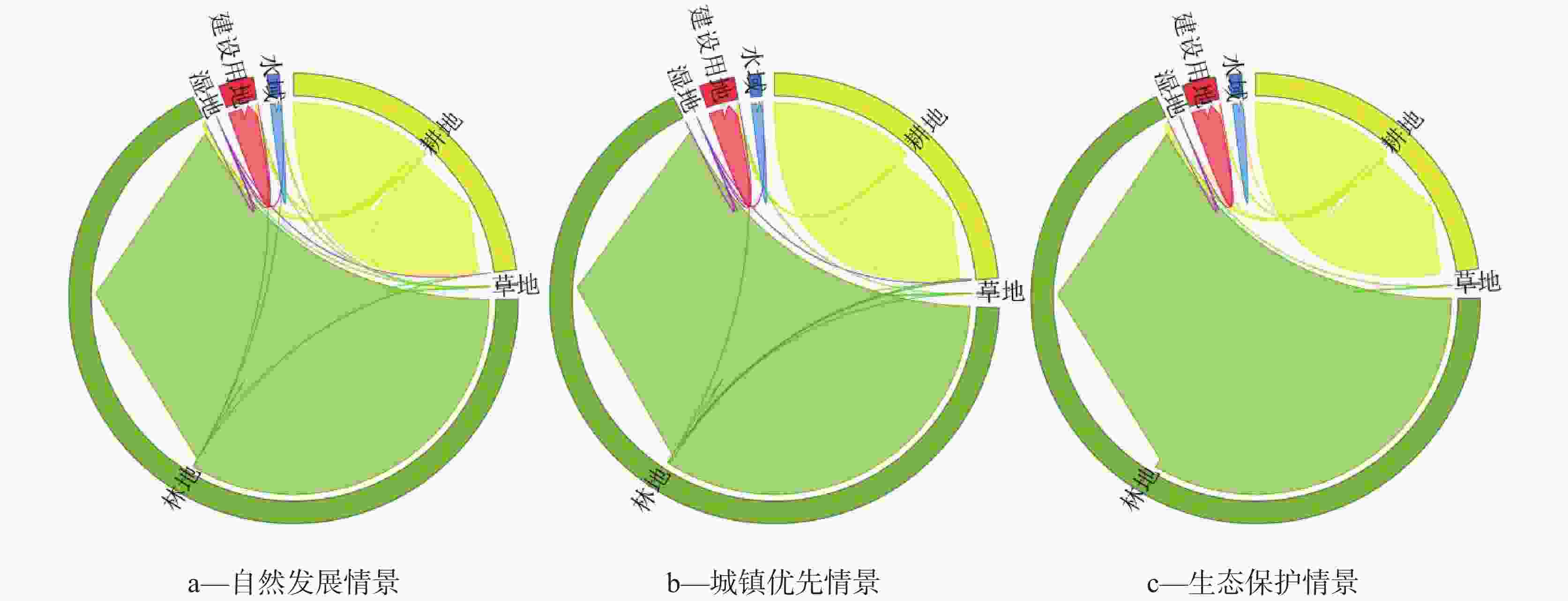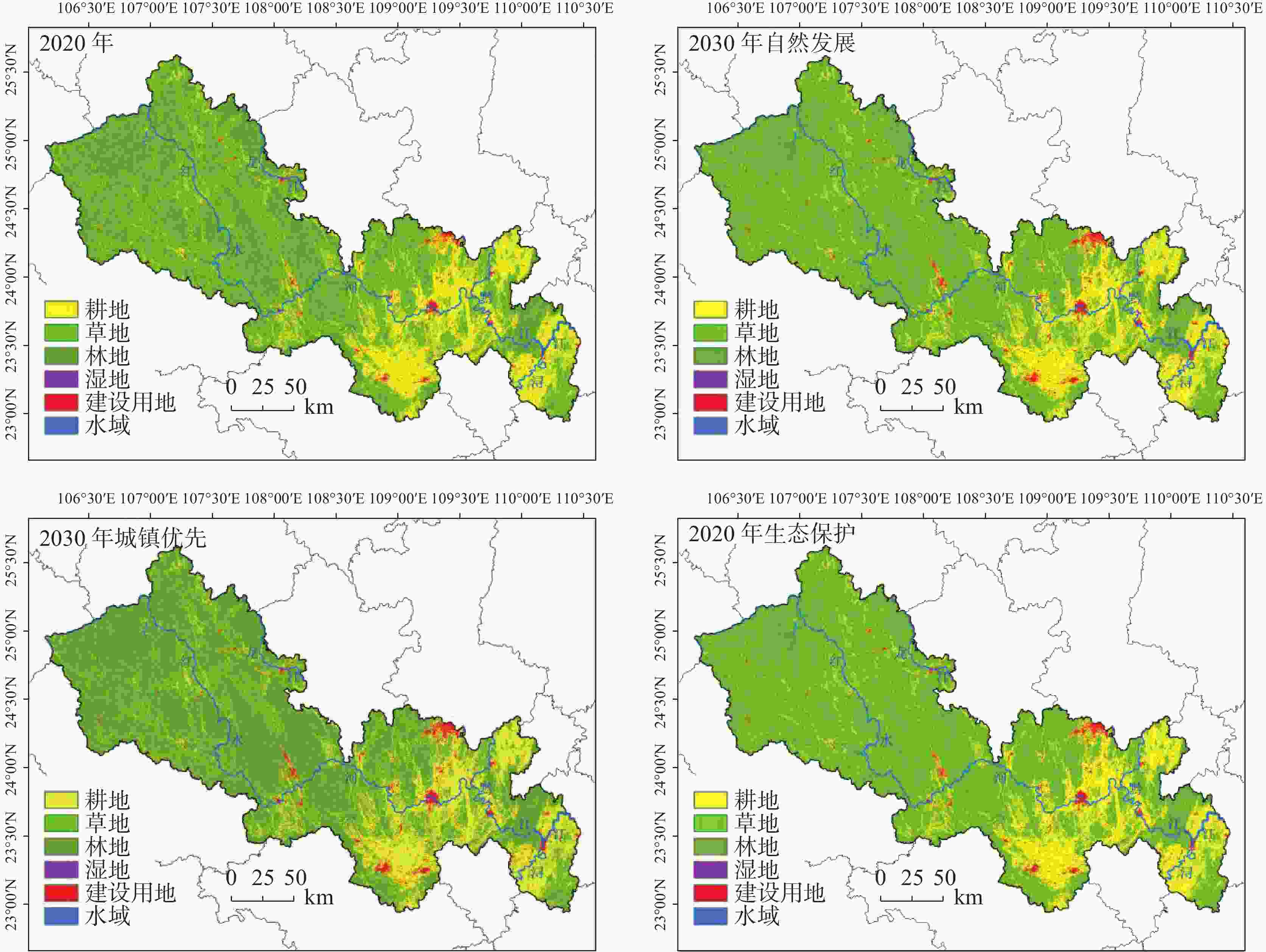 用面积/km2耕地 10896.853 13.354 6032.528 1.598 624.868 182.234 10896.853 草地 0.439 9.961 1.803 0.002 0.030 0.012 0.439 林地 1772.772 37.847 30002.547 0.074 80.328 54.315 1772.772 湿地 0 0 0 0.149 0 0 0 建设用地 0 0 0 0 500.090 0 0 水域 19.301 0.063 7.626 0.553 1.224 239.177 19.301 总面积 10896.853 13.354 6032.528 1.598 624.868 182.234 10896.853 表 6 未来各情景土地利用面积