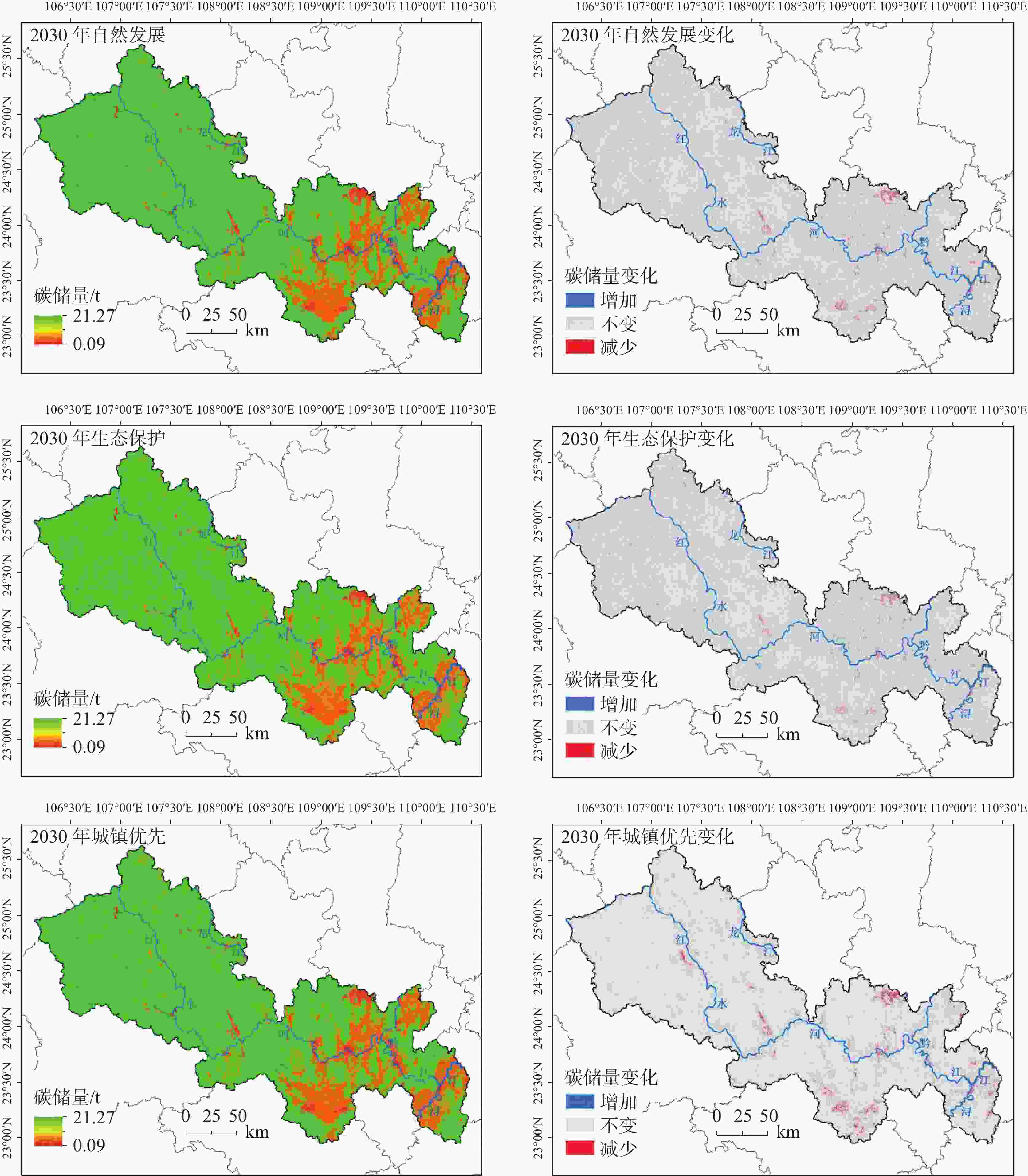 The vulnerable ecology of karst areas is characterized by limited environmental capacity, poor soil quality, insufficient water resources, low land carrying capacity, and high yet vulnerable biodiversity. These factors contribute to low ecosystem productivity and a diminished ability to withstand disturbances. Therefore, it is crucial to understand the causes of changes in ecosystem carbon storage to prevent and mitigate ecosystem degradation and to support sustainable development in karst areas. The Hongshui River Basin is located in the northwest and central regions of Guangxi, characterized by high terrain in the northwest and low terrain in the southeast. It is the main tributary of the Pearl River Basin and encompasses the largest contiguous karst area in Guangxi, covering an area of 50,479.745 km2. Of this, the karst landform area spans 33,942.048 km2, accounting for 67% of the total area. The Hongshui River Basin is a typical karst basin located in Southwest China. It features widely distributed karst landforms, significant altitude variations, and generally thin soil with low fertility and poor water retention capacity. As a result, the ecological environment in this regions is extremely fragile. The vulnerability of natural attributes such as carbon storage function and soil erosion in karst basins, combined with human activities, has led to severe ecological degradation in karst areas. Based on the InVEST model, this study took the Hongshui River Basin as an example to evaluate changes in ecosystem carbon storage in the karst area for the years 1990, 2000, 2010 and 2020. At the same time, the PLUS model was employed to simulate the trend of carbon storage changes in the study area under three future scenarios: natural development, urban prioritization and ecological protection. A geographical detector was utilized to identify the main driving factors influencing land use, precipitation, temperature, population density, and other elements affecting the spatial heterogeneity of carbon storage in the karst region of the study area. The conclusions are as follows, (1) From 1990 to 2020, the spatial distribution characteristics of carbon storage in the Hongshui River Basin showed a gradual increase from the southeast to the northwest. Over the past 30 years, the total carbon storage in the basin gradually increased by 71.59×106 t. The most significant increase in carbon storage occurred between 1990 and 2000, indicating that the carbon sink capacity of the Hongshui River Basin was stronger than its carbon source over this period. Overall, the carbon sink effect surpassed the carbon source effect in the basin. (2) In the year 2030, the carbon storage in the Hongshui River Basin is projected to be 927.67×106 t, 914.84×106 t and 930.71×106 t under the scenarios of natural development, urban development and ecological protection, respectively. Compared with 2020, both the natural development scenario and ecological protection scenario for the Hongshui River Basin are expected to demonstrate a generally increasing trend in carbon storage. This indicates that the carbon sink capacity under these scenarios in the future will be stronger than that of the carbon source. In 2030, the carbon storage of the Hongshui River Basin will increase by 7.69×106 t and 10.74×106 t, respectively. Compared with the natural development scenario, the ecological protection scenario shows advantages in areas where the overall spatial distribution of carbon storage increases. Under the urban development scenario for the year 2030, the carbon storage in the Hongshui River Basin is projected to decrease by 5.14×106 t. As urban socio-economic development necessitates the expansion of urban construction land, urban development will lead to a reduction in forest land, which has a significant capacity for carbon sequestration in karst areas. This reduction will disrupt the ecological balance in this regions, further diminishing the carbon sequestration capacity of the basin and gradually shifting its carbon source-sink effect from a carbon sink to a carbon source.(3) The single-factor detection results from the geographic detector indicate that land use is the main driving factor influencing the spatial heterogeneity of carbon storage in the Hongshui River Basin, with a q value of 0.833. Additionally, the average annual NDVI has been shown to explain the spatial heterogeneity of carbon storage, with a q value of 0.545. The interactive detection results show that the interaction between land use and the annual average NDVI factor have the most significant effect on the change in carbon storage within the Hongshui River Basin, with an explanatory power of 0.833. This indicates that the specific combination of the land use interactions, annual average NDVI and other factors—such as annual average temperature, annual average rainfall, digital elevation model, and population density—will influence the spatial distribution of carbon storage. The land use change factor is the main contributor to the increase of carbon storage in the Hongshui River Basin, followed by the annual average NDVI factor. The findings of this study may provide significant theoretical and data support for the sustainable development of carbon storage within ecosystem services in the Hongshui River Basin. Furthermore, they will assist in the formulation of more effective ecological protection and resource management policies aimed at enhancing the carbon sink capacity of the ecosystem and promoting environmental health and sustainable development. -