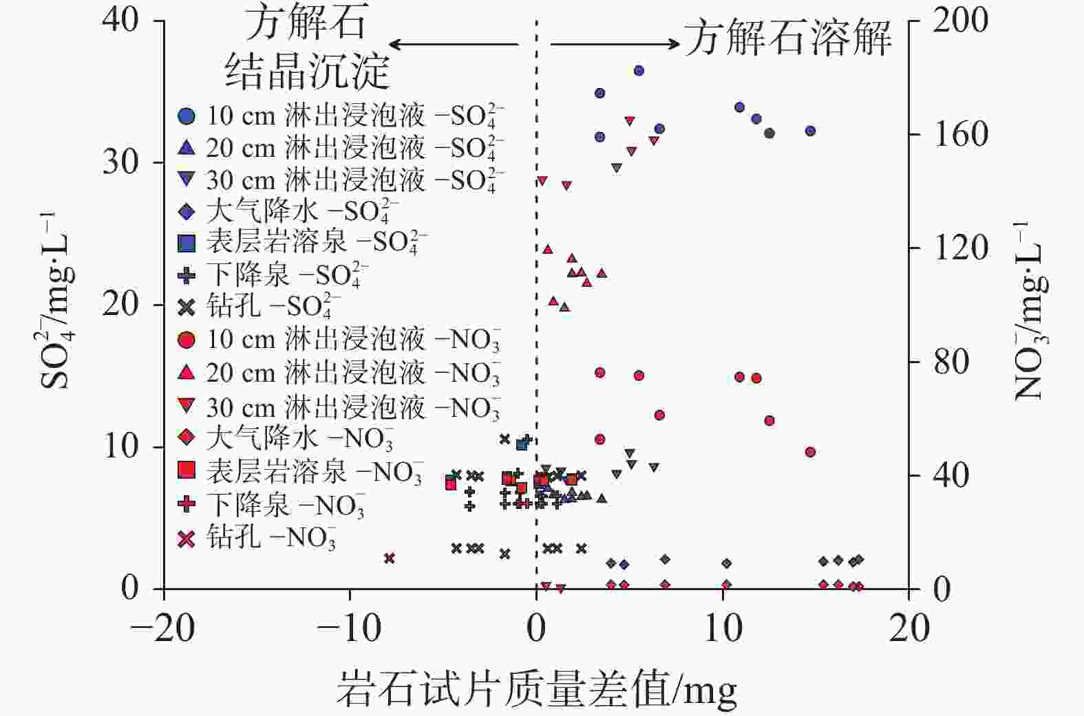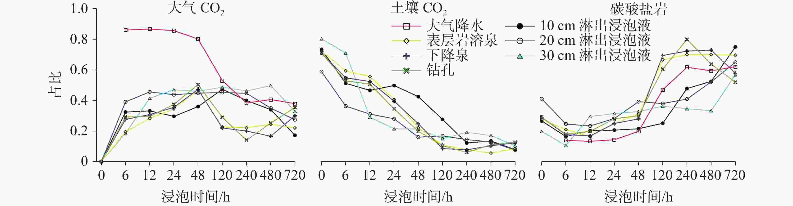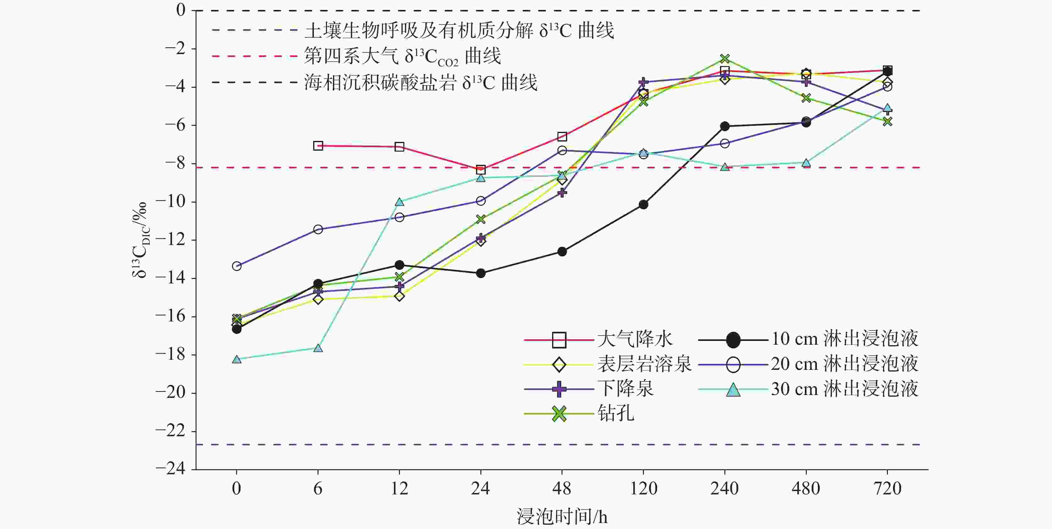 摘要: 碳酸盐岩溶解是一种发生在地球浅表层环境下的特殊地质过程,因其地球化学过程具有低温性、开放性、敏感性和生物参与性等特点,导致岩溶水体溶解无机碳(DIC)浓度及其稳定碳同位素(δ13CDIC)值的多变性。本研究开展大气开放环境中不同水体浸泡碳酸盐岩试片实验,探究大气降水、降水流经岩溶土壤及进入碳酸盐岩含水层再出露地表后对碳酸盐岩溶蚀的影响及δ13CDIC的演变规律。结果表明降水及降水在土壤中渗流再出露地表后,即使无水生光合植物和土壤CO2的持续输入,其对碳酸盐岩仍具有较强的溶蚀作用,而相同条件下岩溶管道/裂隙水出露地表后对碳酸盐岩溶蚀作用微弱或不溶蚀。在无水生光合植物和土壤CO2持续输入的大气开放系统水体中,当${\rm{SO}}_4^{2-}$>29 mg∙L−1或${\rm{NO}}_3^{-}$>50 mg∙L−1时,${\rm{SO}}_4^{2-}$、${\rm{NO}}_3^{-}$产生的盐效应和与阳离子形成的离子对作用可显著提高方解石溶解度,促进方解石溶解。土壤渗流水和岩溶管道/裂隙水出露地表后水中CO2在数小时内即可完成脱气作用,并使水体δ13CDIC值显著增重,增幅可达+10.98‰。