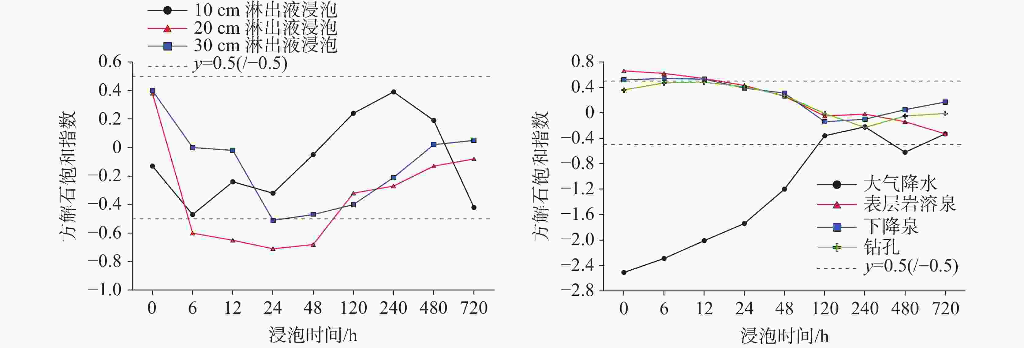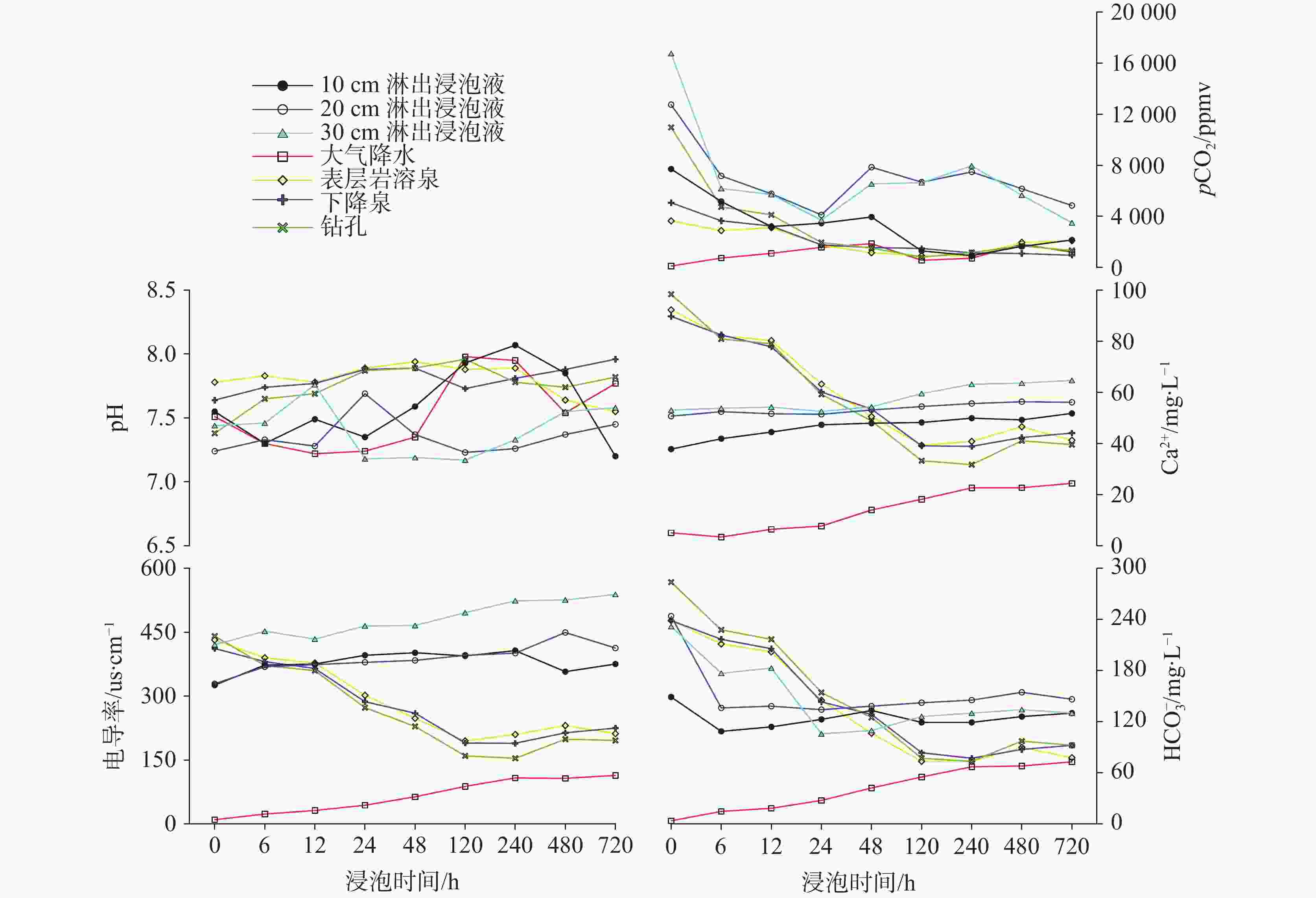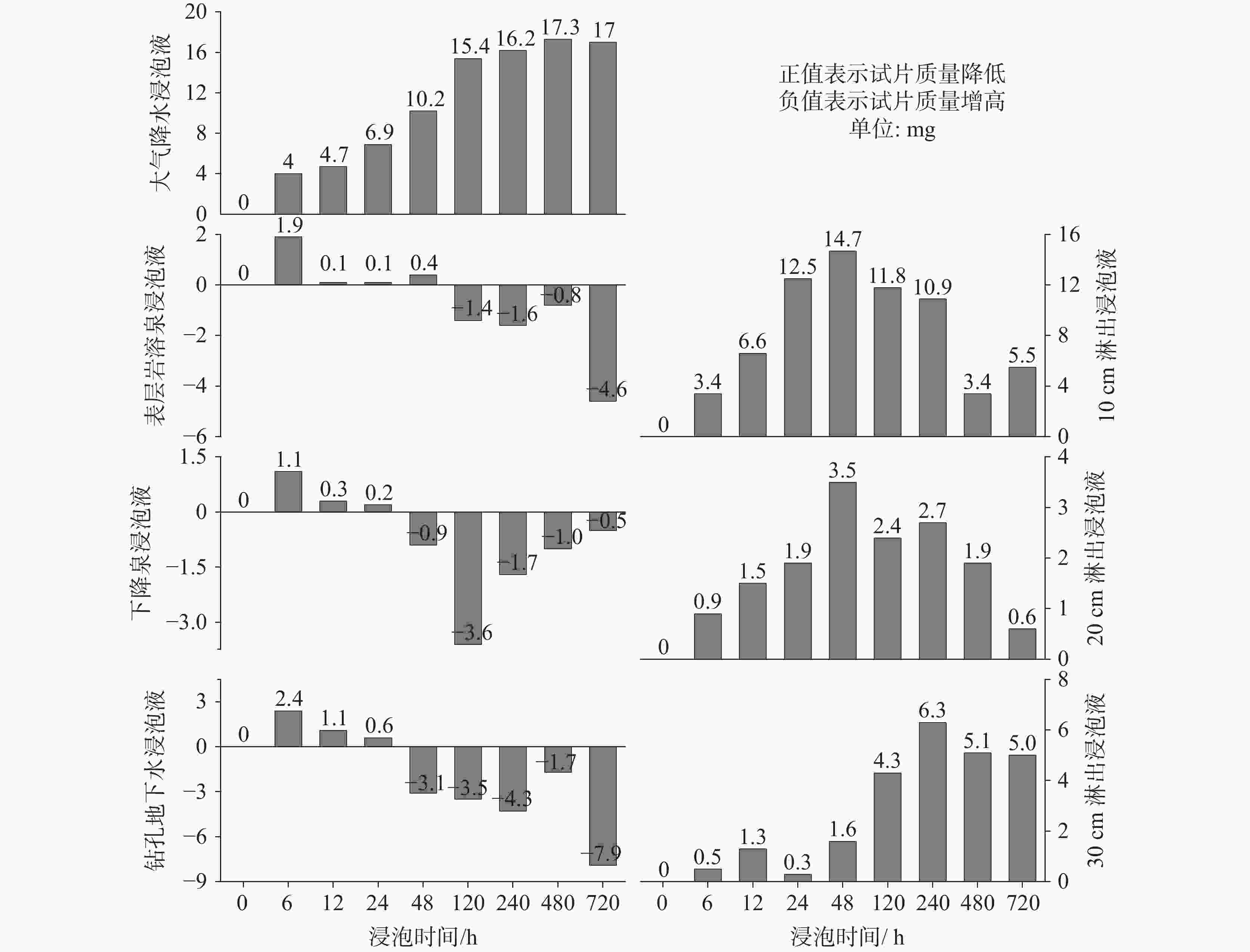 试片岩性 采样点 形状 直径/mm 高度/mm 表面积/cm2 CaO MgO CO2 酸不溶物 质量分数/% 灰岩 桂林市七星岩 圆饼状 40 3 28.9 55.69 0.42 42.97 0.67 表 3 浸泡液水化学指标检测结果统计