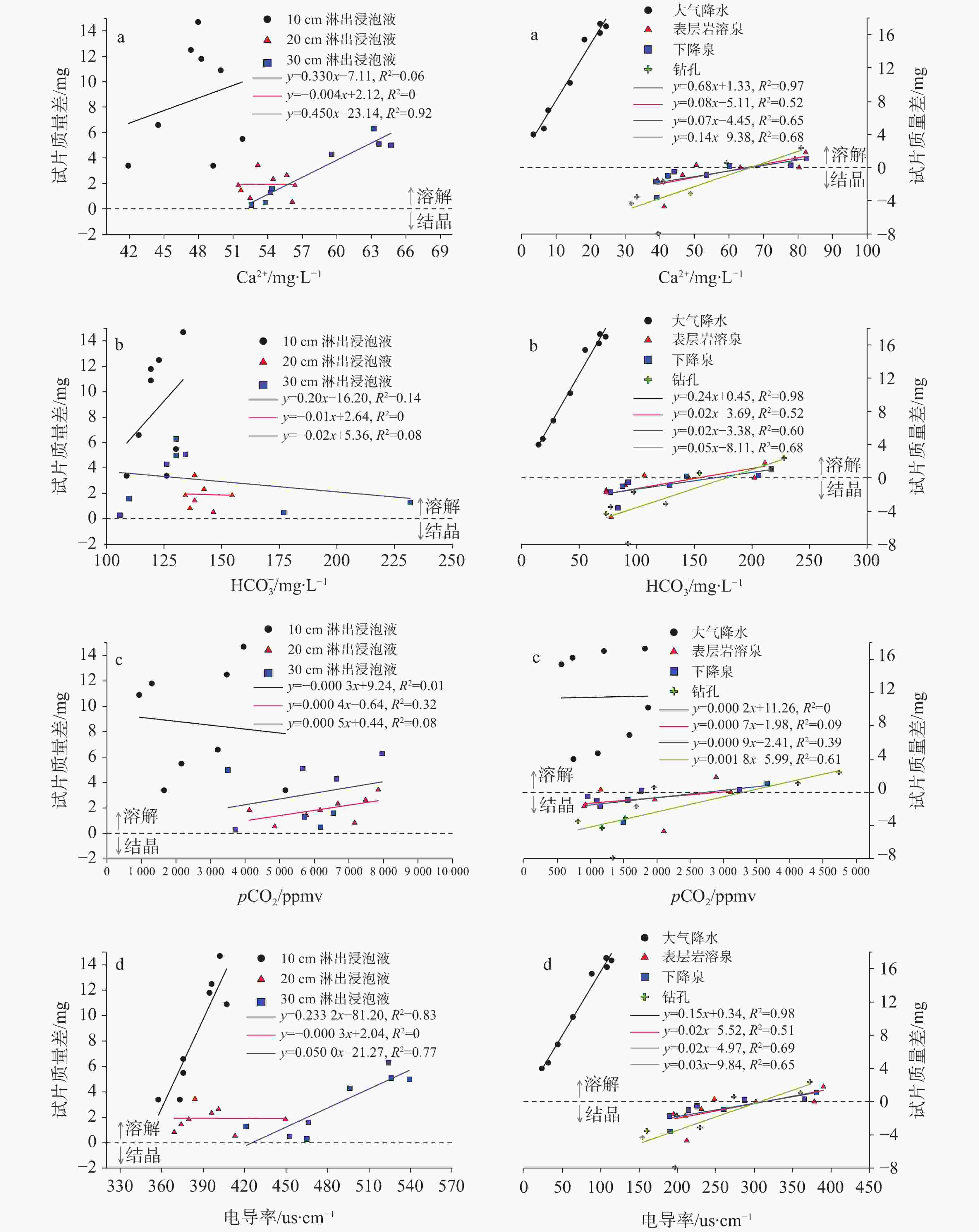 Figure 7. Relationship between major hydrochemical indexes of the soaking solutions and quality difference of rock tablets. (Except for the initial soaking solution; a: Ca2+ vs. quality difference of rock tablets; b: ${\rm{HCO}}_3^{-}$ vs. quality difference of rock tablets; c: pCO2 vs. quality difference of rock tablets; d: conductivity vs. quality difference of rock tablets)