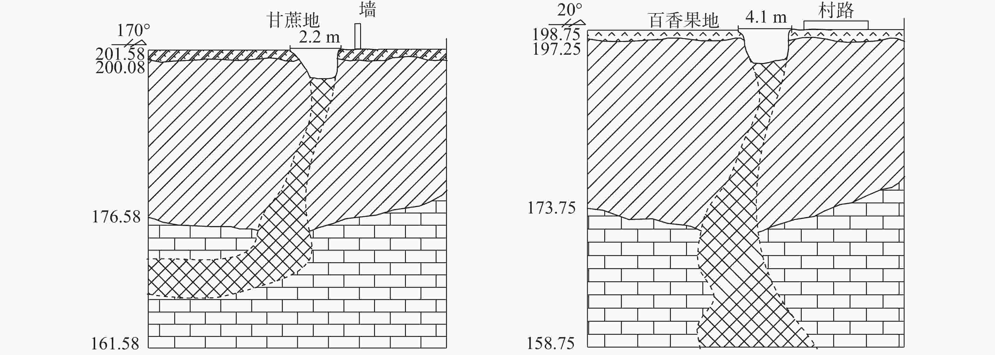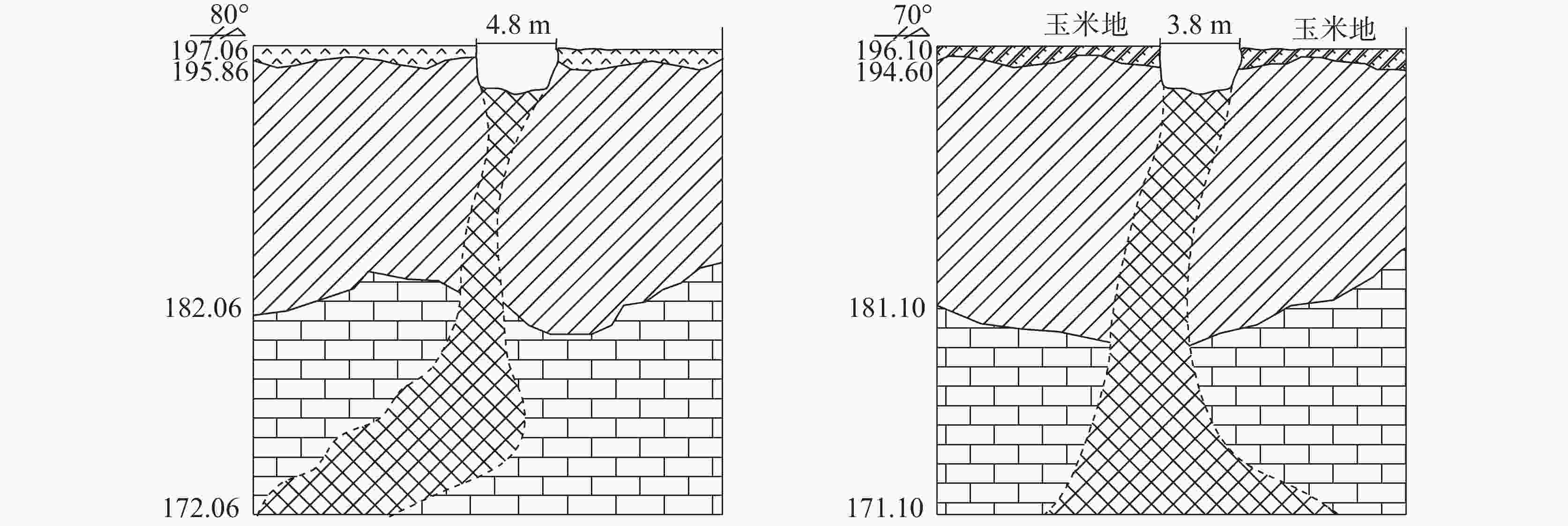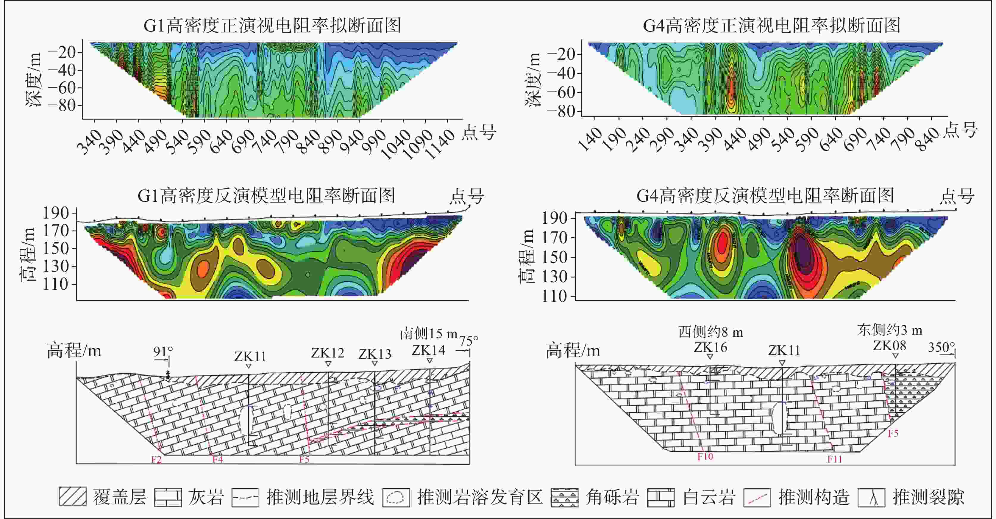 线号 异常点号 异常形态 推断解释结果 G1 376~385 “V”字型低阻异常 岩溶发育区,发育深度为11~14 m 518~538 “W”字型低阻异常 岩溶发育区,发育深度为27~33 m 668~701 “W”字型低阻异常 岩溶发育区,发育深度为36~69 m 768~788 “U”字型低阻异常 岩溶发育区,发育深度为35~54 m 850~880 “W”字型低阻异常 岩溶发育区,发育深度为35~59 m 940~990 “W”字型低阻异常 岩溶发育区,发育深度为7~36 m 1089~1115 低阻异常 岩溶发育区,发育深度为12~44 m G4 368~381 等值线不均匀 岩溶发育区,发育深度为15~23 m 508~541 中段等值线不均匀 岩溶发育区,发育深度为36~69 m 595~605 等值线不均匀 岩溶发育区,发育深度为11~14 m 613~621 等值线不均匀 岩溶发育区,发育深度为9~13 m 632~651 “V”字型低阻异常 岩溶发育区,发育深度为20~27 m 683~696 “V”字型低阻异常 岩溶发育区,发育深度为20~25 m 708~714 “V”字型低阻异常 岩溶发育区,发育深度为13~17 m 749~765 “V”字型低阻异常 岩溶发育区,发育深度为16~20 m -