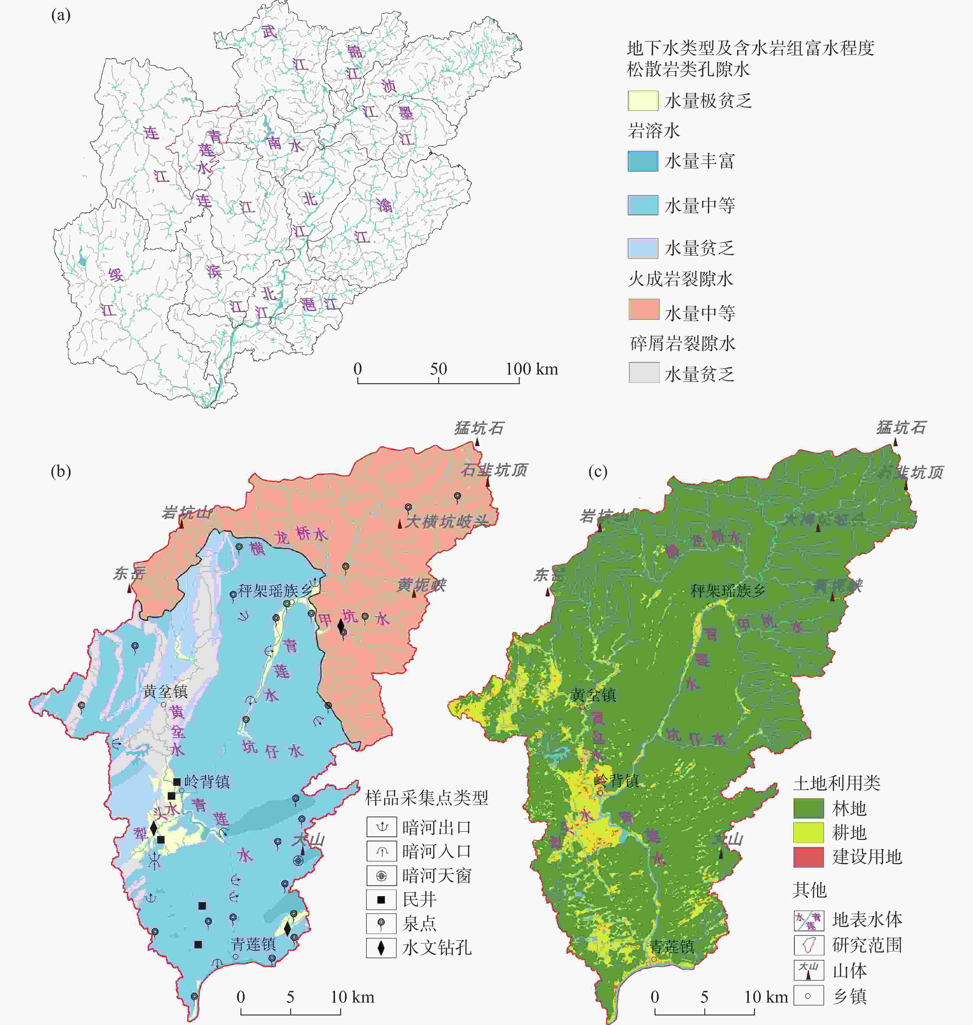 The Qinglian River Basin is a typical basin unit within the ecological security pattern. Therefore, clarifying its groundwater quality is crucial for strengthening the ecological security barrier of the hilly and mountainous areas in South China and for maintaining the ecological security of the Guangdong−Hong Kong−Macao Greater Bay Area. The chemical composition of water is significantly related to water potability, availability for agriculture and tourism, and interaction with biological systems. However, the lack of understanding regarding the nature of groundwater has presented some challenges for the scientific management of groundwater in the Qinglian Basin, particularly concerning irrational spatial exploitation of groundwater. To address these challenges, methods such as hydrochemical parameters and multivariate statistical techniques-including Durov diagram, Gibbs plot, Schoeller diagram and Positive Matrix Factorization (PMF) model-were employed to trace the sources of chemical substances in groundwater and quantify the contribution rates of various factors affecting groundwater quality. The main land use types in the study area include forest land, cultivated land, construction land, and water bodies, which account for 87.30%, 11.31%, 1.14%, and 0.27%, respectively. Based on the deposit conditions of groundwater and the characteristics of water-bearing media, the types of groundwater are mainly classified as karst water, igneous-fissure water, clastic-fissure water, and pore water. According to the extended Durov diagram, the pore water in Quaternary sediments predominantly exhibits HCO3·SO4−Ca characteristics, while the igneous-fissure water is classified as HCO3−Ca·Na (Na). The groundwater in areas with dolomitic limestone and clastic rocks is primarily of HCO3−Ca·Mg types, whereas the other karst water is mainly classified as HCO3−Ca type. In the PMF model, a total of 53 groundwater samples were used for the identification and apportionment of groundwater chemical sources. Five major factors of groundwater chemical sources within the basin were identified. Factor 1 (F1) is characterized by Mg2+, ${\rm{HCO}}_3^{-}$, and total dissolved solids (TDS), originating from weathering and dissolution of dolomitic limestone and Mg-containing silicate minerals, with a contribution rate of 18%. Factor 2 (F2) is characterized by ${\rm{NO}}_3^{-}$, Cl−, and Na+, which are derived from anthropogenic activities such as domestic and agriculture practices, with a contribution rate of 20%. In addition, agricultural activities on sloping farmland can cause substances such as ${\rm{NO}}_3^{-}$ to be discharged into the karst basin through underground runoff, further increasing the concentrations of chemical substances in the groundwater of the karst basin. Factor 3 (F3), is characterized by ${\rm{HCO}}_3^{-}$, Ca2+, and TDS, resulting from the weathering and dissolution of carbonate minerals, and it is the factor with the highest contribution rate (27%). The dominance of F3 among the five factors corresponds to the largest proportion of karst area in the basin (55%), making it the primary source of chemical substances in the groundwater of the Qinglian River Basin. The most relevant parameter of Factor 4 (F4) is mainly ${\rm{SO}}_4^{2-}$, and its apportioned contribution rate is 16%. The majority of ratios of ${\rm{SO}}_4^{2-}$ to ${\rm{NO}}_3^{-}$− in groundwater fall between one and four, indicating that the primary source is the use of sulfur-containing fertilizers in agricultural activities. Notably, the pore water in loose rock formations within the karst basin has a relatively high concentration of ${\rm{SO}}_4^{2-}$, with a maximum value of 81.30 mg·L−1, showing a significant impact from human activities. However, the underlying karst water has a lower concentration of ${\rm{SO}}_4^{2-}$ (6.90 mg·L−1), indicating less influence from human activities. F5 is characterized by Na+, K+, Cl−, and TDS, which are derived from the weathering of silicate minerals and the dissolution of a small amount of halite, with a contribution rate of 19%. The distribution areas with high concentrations of chemical parameters are significantly correlated with the spatial distribution of contribution rates of source factors, which indicates that water chemistry responds to the spatial distribution of lithology and land use. F1, F3 and F5, belonging to natural factors such as rock weathering and water−rock interaction, contribute 64% and have a significant correlation with lithology. F2 and F4 are significantly correlated with the distribution of cultivated land and construction land, and are considered to be influenced by human activities, with a contribution rate of 36%. In general, the main sources of the chemical substances in karst water are the weathering and dissolution of carbonate, and silicate and halite minerals. In some areas, human activities such as domestic wastewater and the use of fertilizers areas also have an impact. The main source of igneous-fissure water is the weathering and dissolution of silicate minerals. The quantitative analysis of the contribution rates of groundwater ion sources helps to deepen the understanding of fissures and karst aquifers in the study area, and provide a basis for the scientific management of groundwater. -