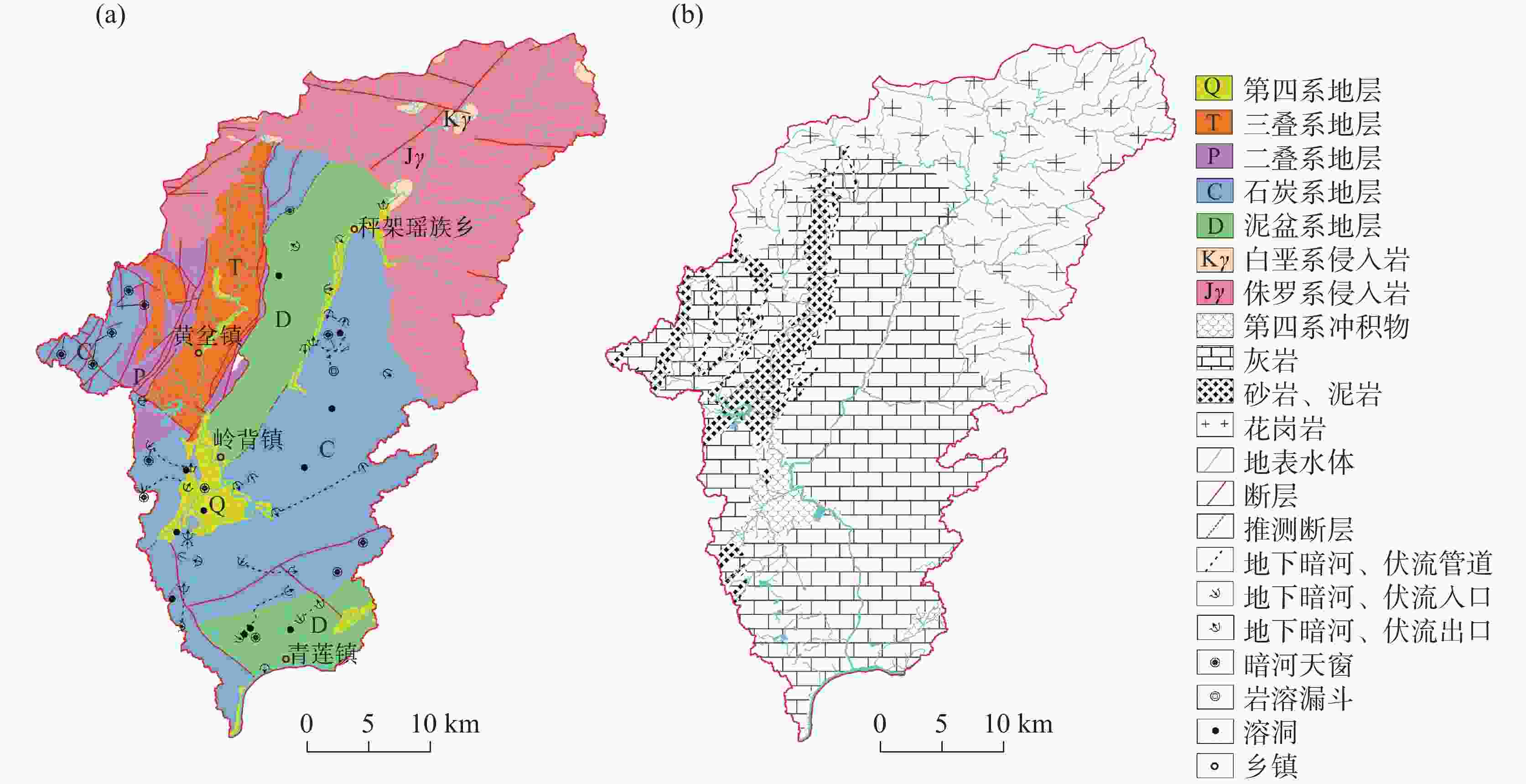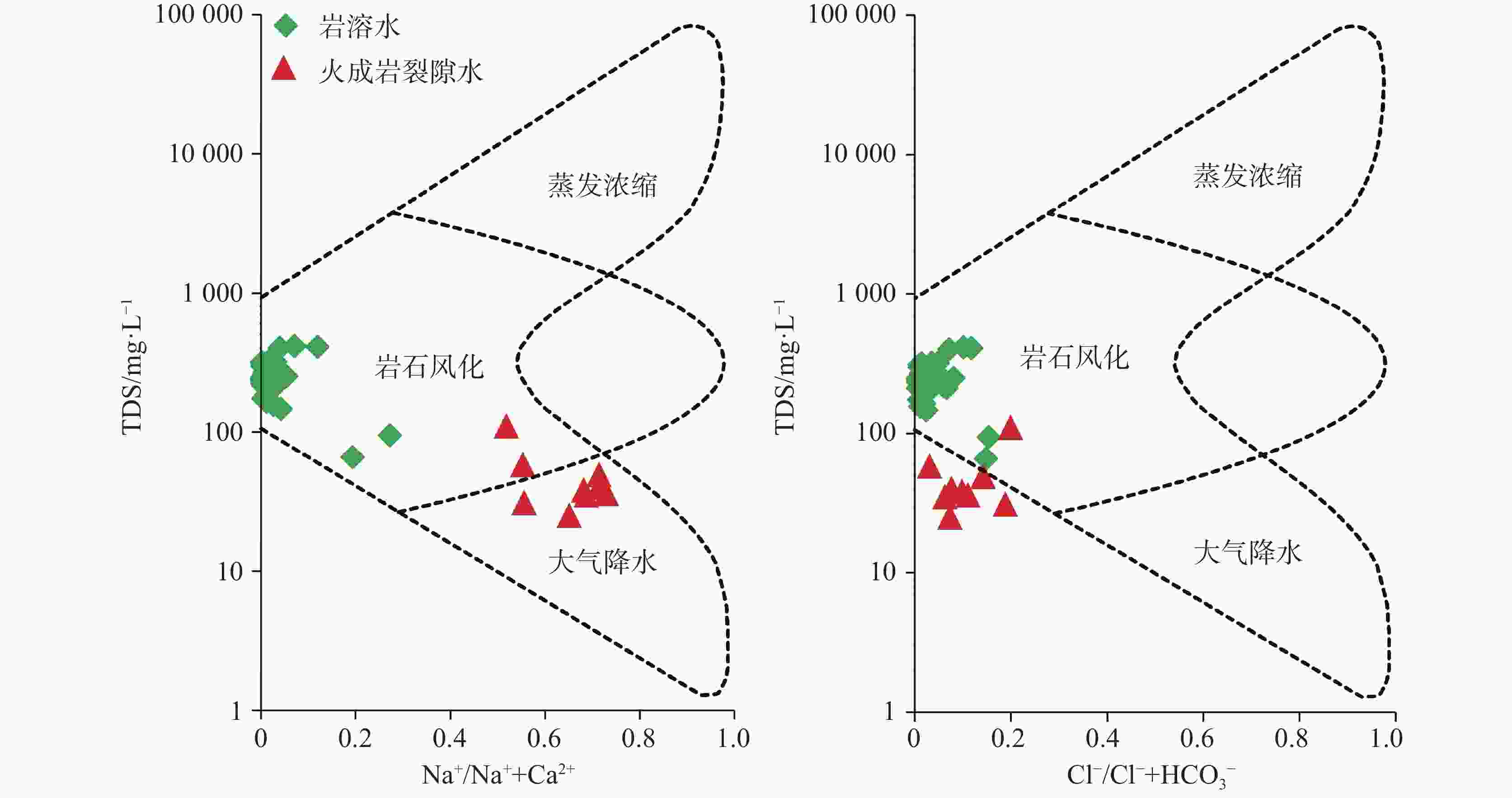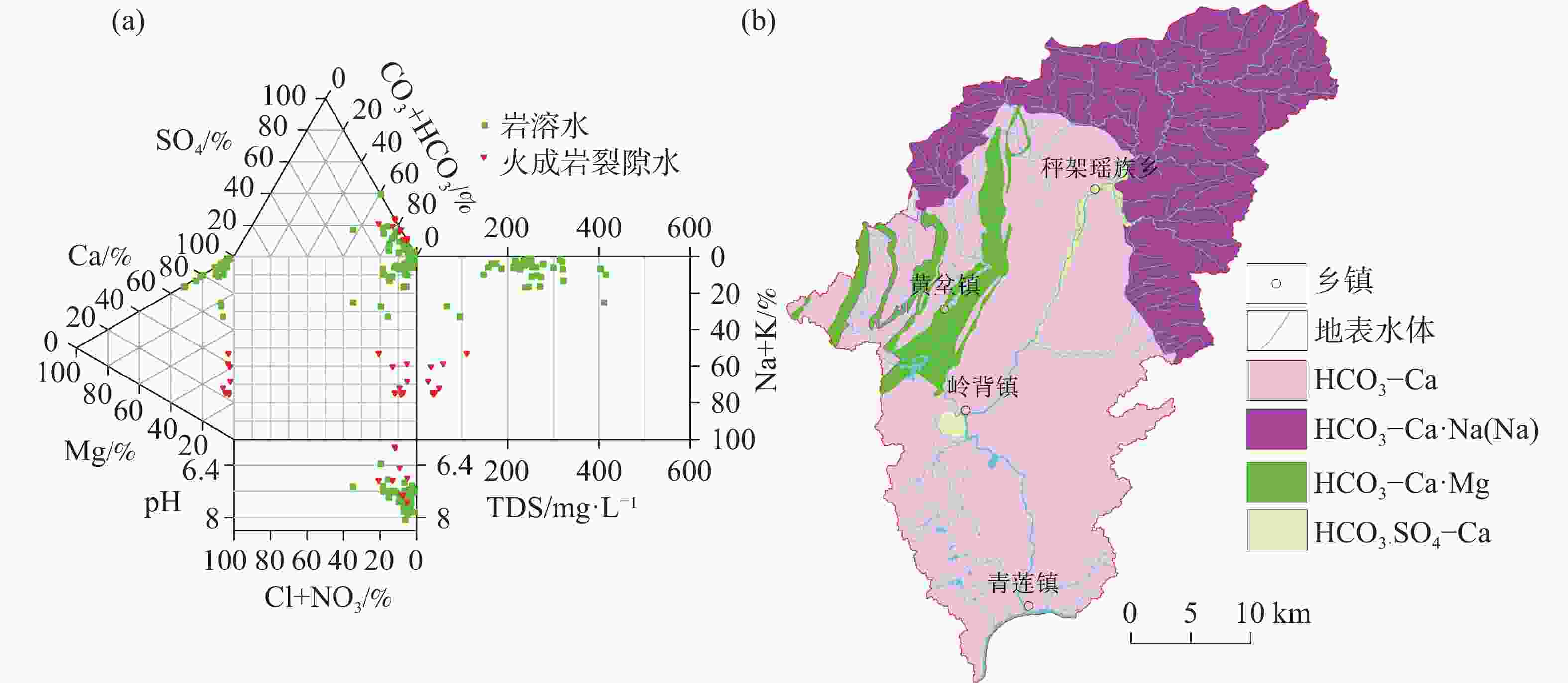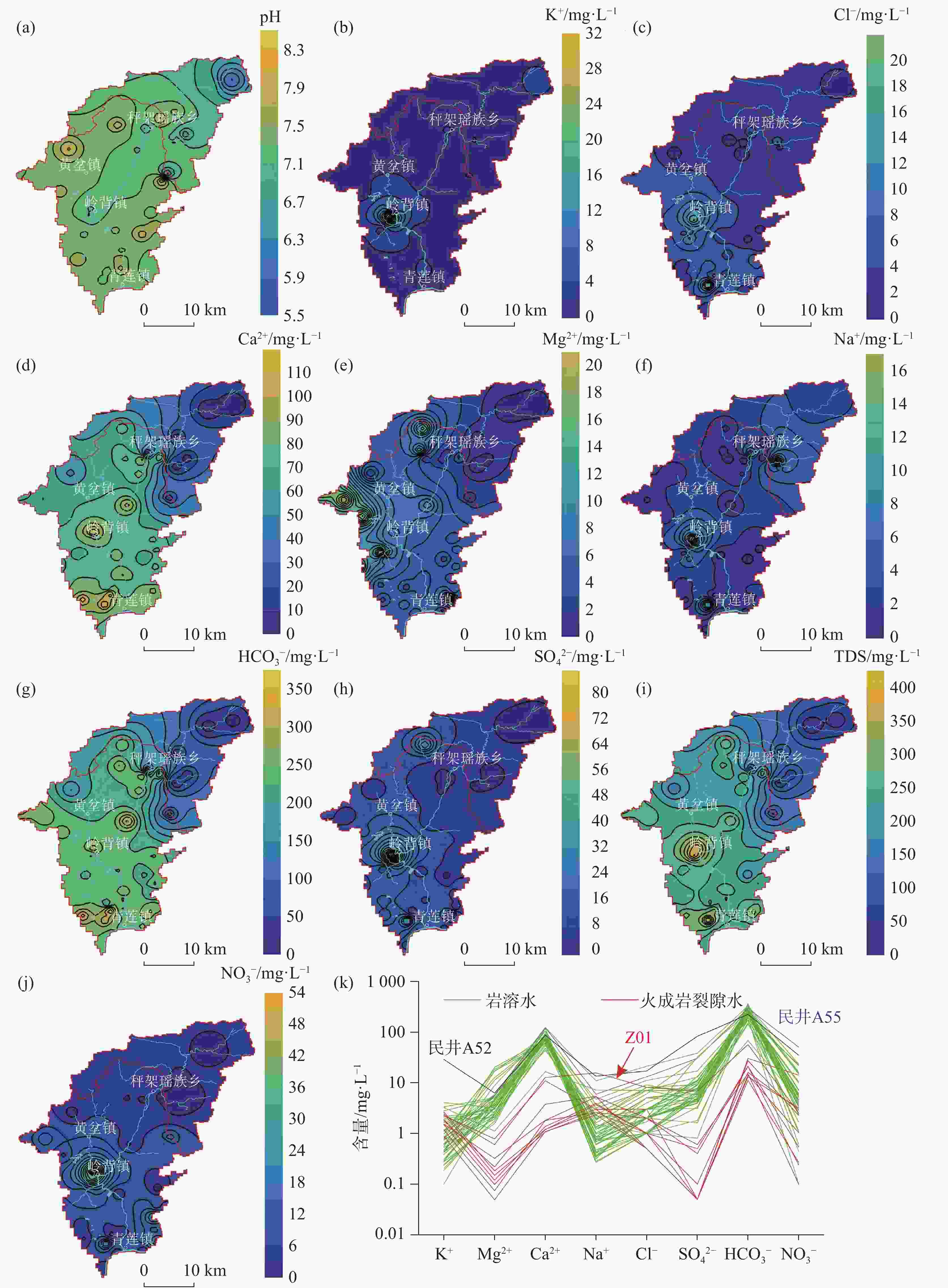 化学指标 pH K+ Na+ Ca2+ Mg2+ ${\rm{HCO}}_3^{-}$ Cl− ${\rm{SO}}_4^{2-}$ ${\rm{NO}}_3^{-}$ TDS 无量纲 mg·L−1 mg·L−1 mg·L−1 mg·L−1 mg·L−1 mg·L−1 mg·L−1 mg·L−1 mg·L−1 地下水质量标准a 6.50~8.50 − 100.00 − − − 250.00 250.00 20.00 1000.00 岩溶水 最大值 8.09 28.60 13.40 122.00 20.10 360.00 21.00 81.30 49.80 415.00 最小值 6.87 0.10 0.27 16.50 1.10 67.00 1.00 0.80 0.10 95.00 平均值 7.40 1.62 1.91 79.55 5.40 242.46 4.39 10.73 8.31 249.88 标准偏差 0.27 4.31 2.73 20.45 4.70 55.38 4.37 13.81 9.97 63.33 火成岩裂隙水 最大值 7.57 2.64 15.60 12.60 0.78 56.00 8.00 6.80 14.10 110.00 最小值 5.86 0.88 2.32 1.06 0.05 11.00 0.50 0.05 0.10 25.00 平均值 6.76 1.83 4.72 3.66 0.26 22.40 1.95 0.87 2.72 48.80 标准偏差 0.59 0.58 3.96 4.33 0.24 13.32 2.28 2.10 4.17 24.85 注: a,GB/T 14848 −2017《地下水质量标准》[28],“−”表示不是评价指标,无限值。 -
