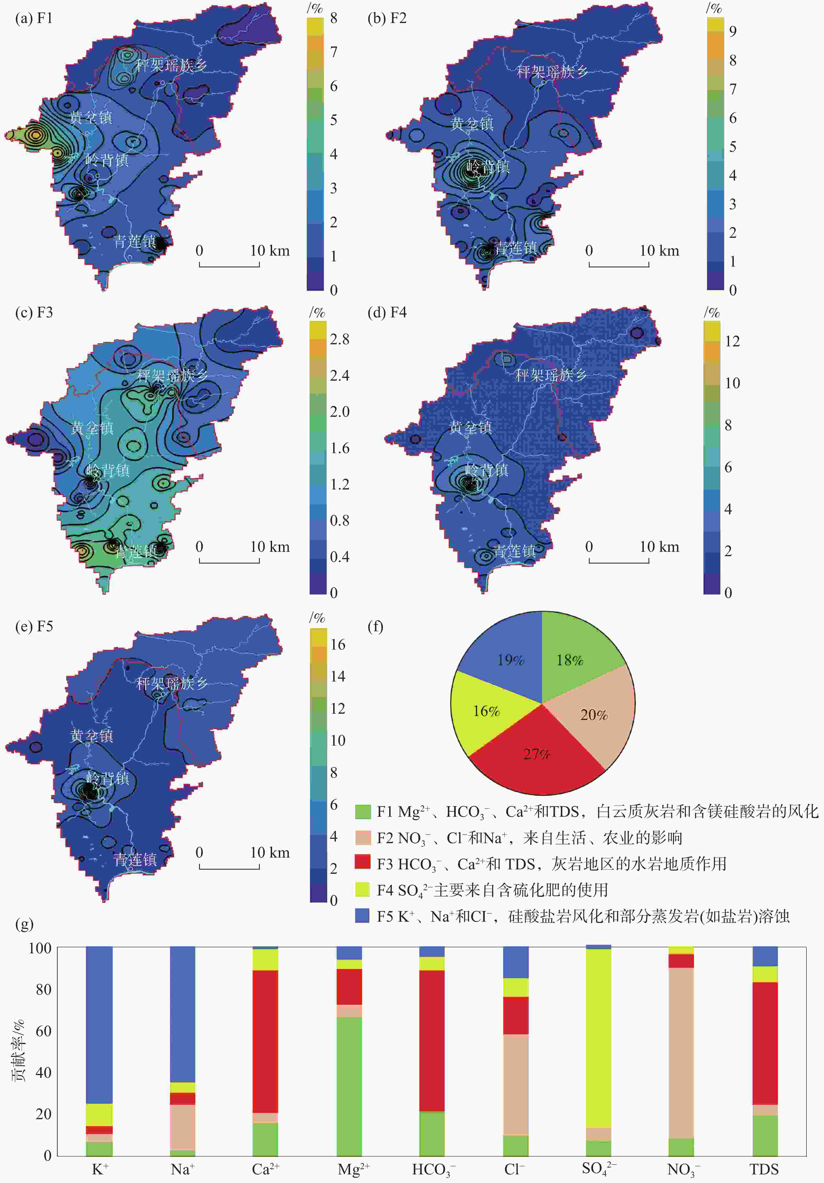 摘要: 作为国家“两屏三带”生态安全格局中典型流域的基本单元,掌握青莲水流域地下水水质状况,对筑牢南方丘陵山地带生态安全屏障、维护粤港澳大湾区生态安全具有重要意义。结合水文地质调查和地下水化学指标特征分析,采用正矩阵因子分解模型(PMF)分析方法,追踪地下水化学物质来源并定量分析影响地下水质量的因子贡献率。研究结果表明,流域内地下水化学物质主要来源于含镁碳酸盐和硅酸盐矿物的风化溶解(F1)、生活废水、农用肥料等人类活动(F2)、碳酸盐矿物的水−岩作用(F3)、含硫化肥的使用(F4)以及硅酸盐矿物和岩盐的风化溶解(F5)。各类矿物的风化和含水层水−岩作用等自然因素的贡献率为64%,是流域内地下水化学物质的主要来源,人类活动影响的来源仅占36%。水化学指标高含量分布区域和来源因子贡献率的空间分布区域有显著相关性,表明水化学对岩性和土地利用空间分布有响应关系。整体而言,岩溶水化学成分来源主要是碳酸盐、硅酸盐和岩盐矿物等风化溶解,局部地区还受生活废水和农用化肥的使用等人为活动的影响;火成岩裂隙水来源主要为硅酸盐矿物的风化溶解。地下水离子来源贡献率的定量分析有助于加深对研究区裂隙和岩溶含水层的认识,为地下水的科学管理提供依据。Abstract: