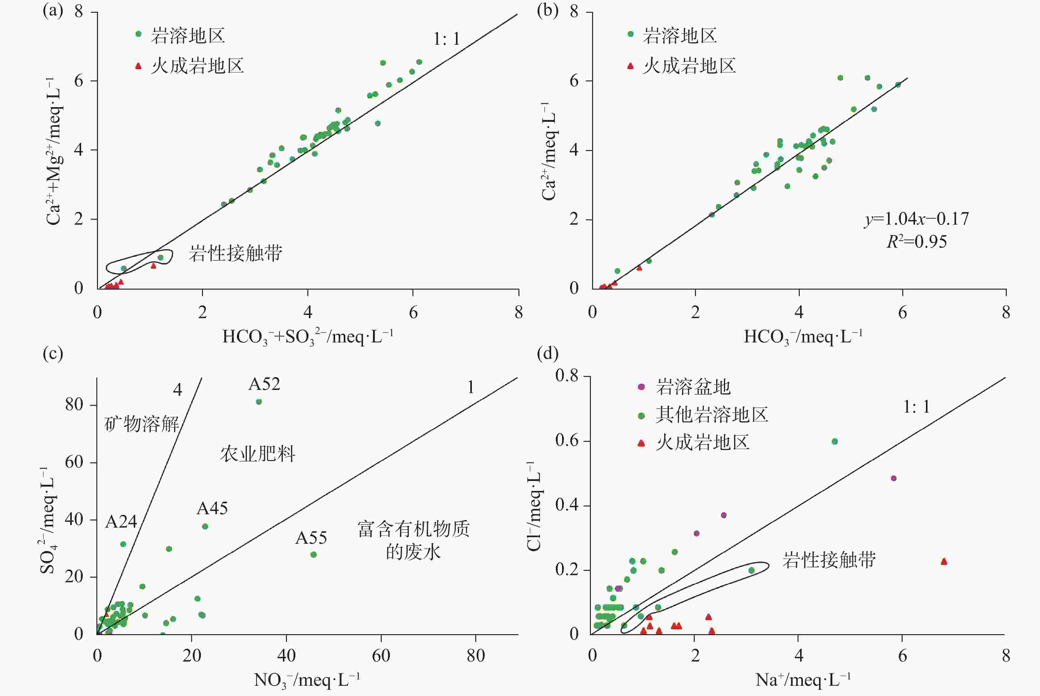 图 8 (Ca2+ + Mg2+)−(${\rm{HCO}}_3^{-}$ + ${\rm{SO}}_4^{2-}$)(a)、Ca2+−${\rm{HCO}}_3^{-}$(b)、${\rm{SO}}_4^{2-}$−${\rm{NO}}_3^{-}$(c)、Na+−Cl−(d)关系图