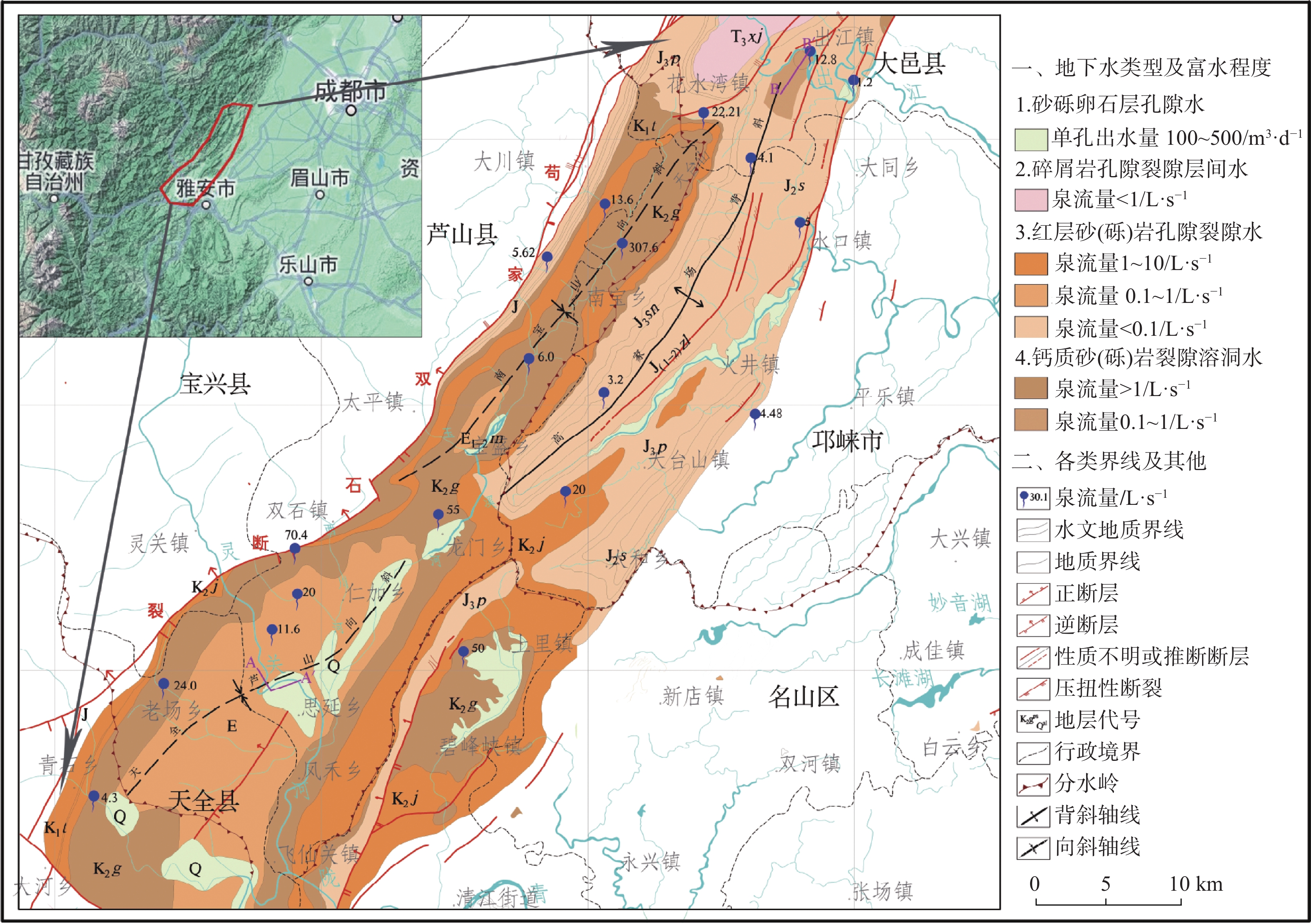 摘要: 侏罗纪至白垩纪期间,四川盆地西缘龙门山前沉积了一套陆相红色盆地沉积物,岩性以泥钙质胶结的砂(砾)岩为主。该套岩层在地下水溶蚀作用下,发育有规模宏大的洼地、数千米水平溶洞等岩溶现象,对研究区水库、隧洞等工程建设构成重大威胁。文章在已有地质、水文地质工作基础上,结合地面调查、岩矿鉴定等技术手段,从宏观构造演变、沉积环境、水动力条件及微观矿物成分、胶结特征等多角度出发,综合研究砂(砾)岩溶蚀发育特征及控制因素。结果表明:研究区地表、地下均有典型岩溶现象发育,显示出溶蚀空间主要顺层面发育、局部沿优势节理面垂向扩展的规律,区内岩溶强发育区、中等以及弱发育区面积占比为1∶2∶7;复杂多变的沉积环境导致了研究区岩性和岩组结构的时空差异,是控制红层岩溶发育位置及强度的根本内因;气候、地形地貌、地质构造等控制下的水动力条件是影响岩溶发育的重要外因,影响红层岩溶的延伸方向及发育规模;新构造运动稳定与隆升的间歇发生导致了不同时期形成的溶洞在垂向上呈层状发育。Abstract: