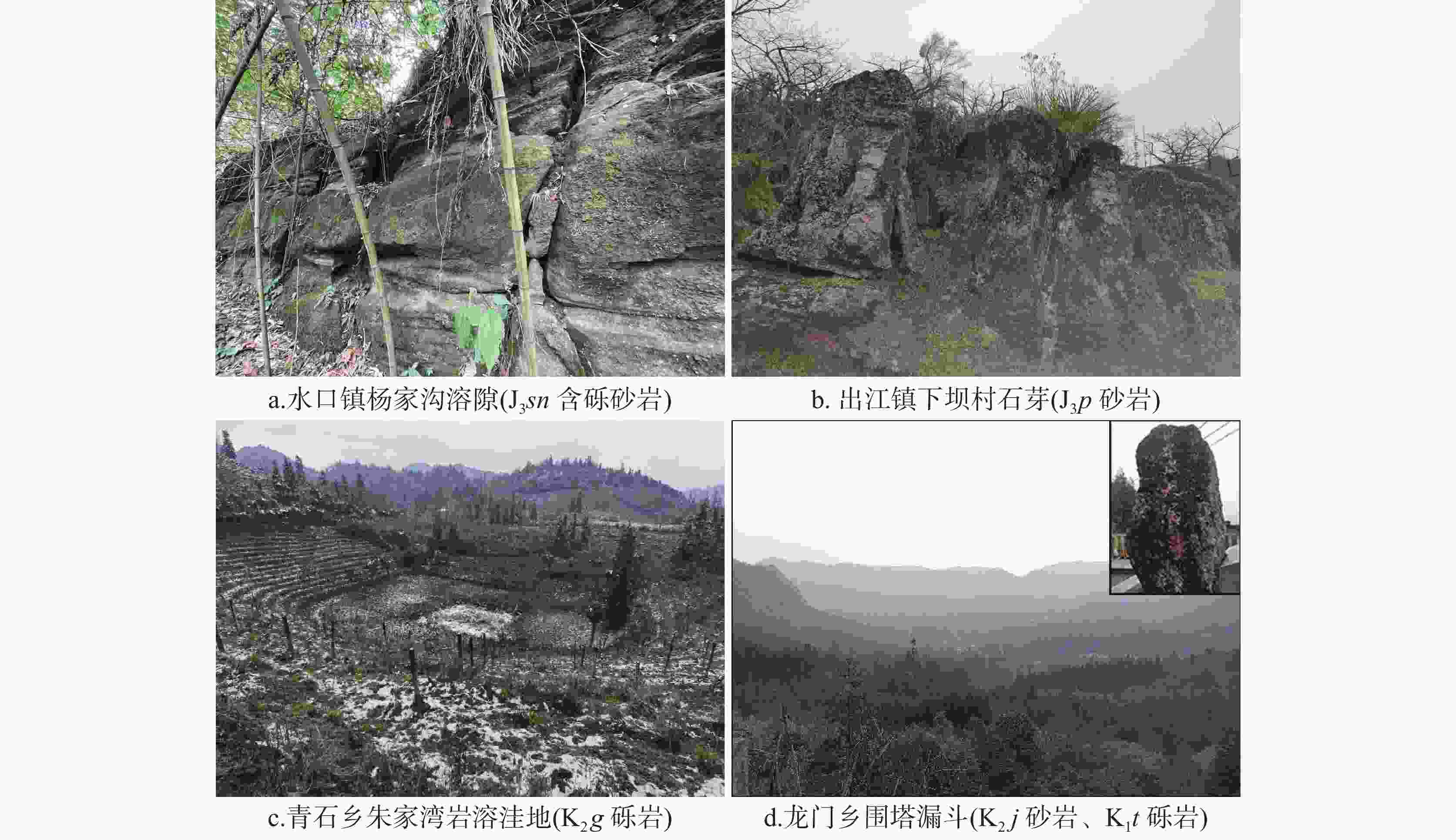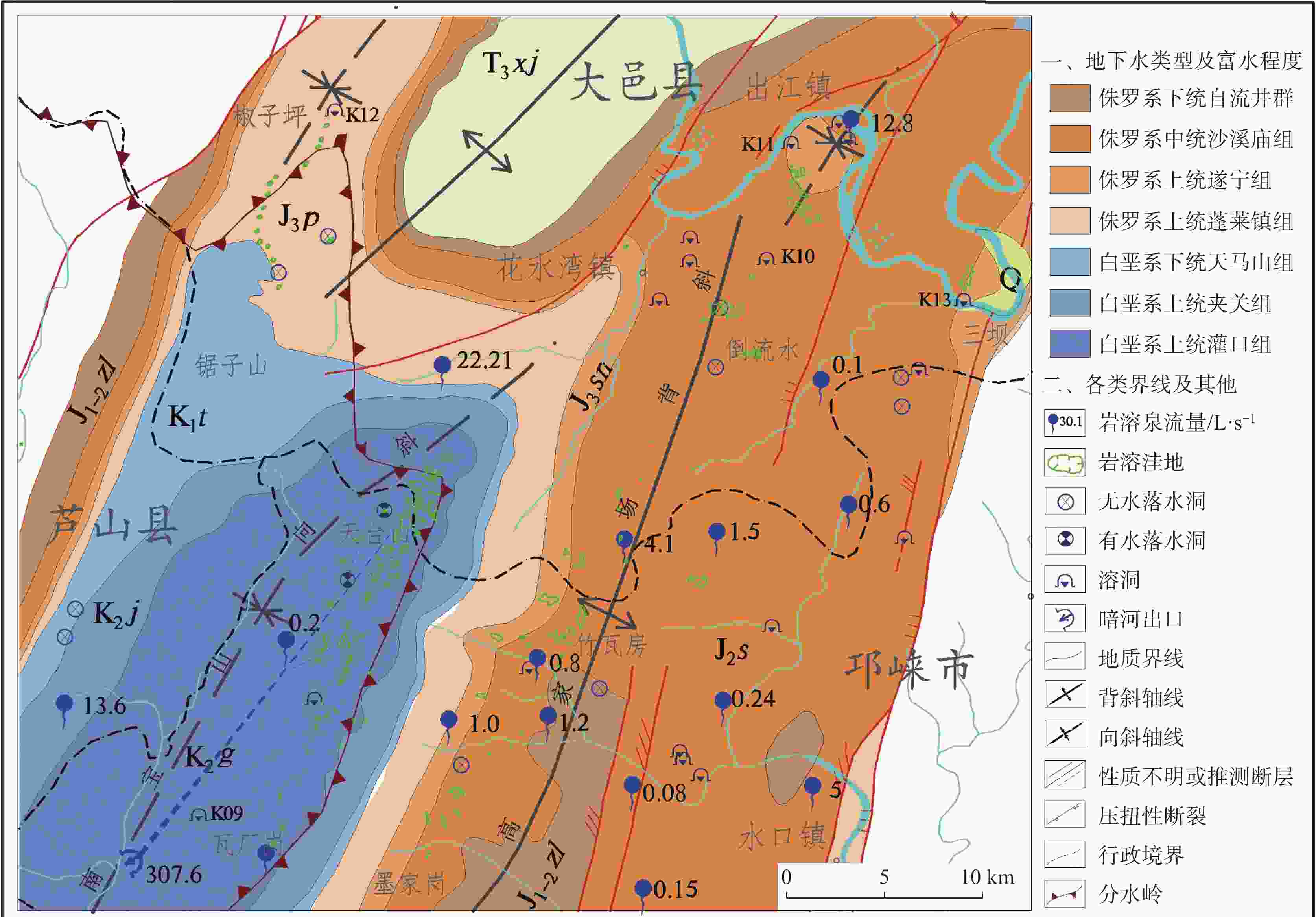 (104°∠32°)1113 272 SE108° 可探延伸约50 m,洞径3~6 m,洞内有常流水,丰枯流量动态变化大 K10 出江镇南侧半山坡仙宝洞 J2s砾岩、粉砂质泥岩
