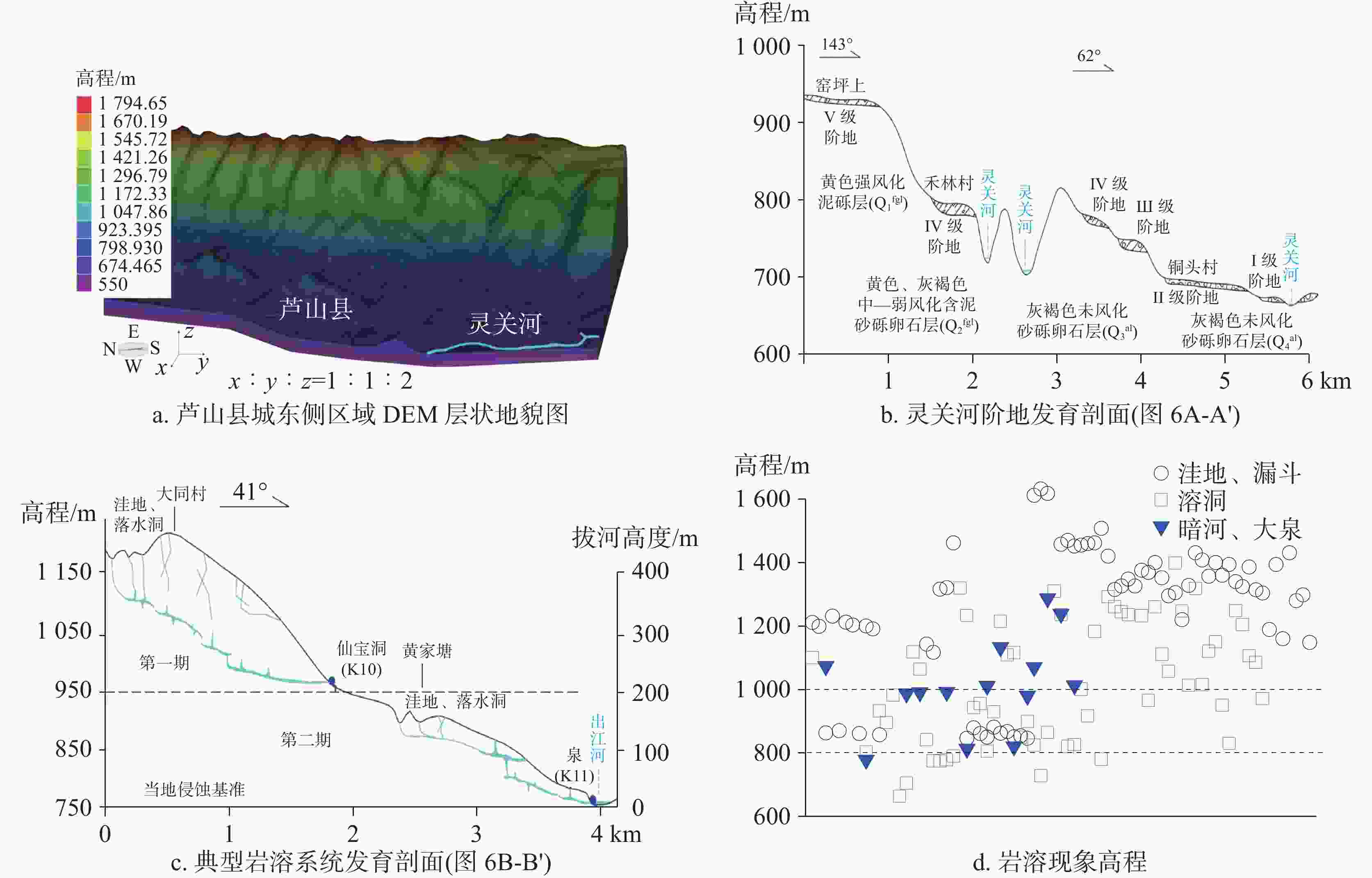 河流名称 河面高程/m 阶地位置 阶地级序 拔河高度/m ESR年龄 灵关河 664 思延乡铜头村 Ⅰ级阶地 12.1 1.23×104a Ⅱ级阶地 26.0 6.48×104a Ⅲ级阶地 67.7 12.57×104a 710 禾林村 Ⅳ级阶地 110.0 27.90×104a Ⅴ级阶地 210.0 74.07×104a 玉溪河 760 龙门乡 Ⅰ级阶地 4.0 − Ⅱ级阶地 18.5 − 出江河 692 出江镇中坝村 Ⅰ级阶地 3.0 − Ⅱ级阶地 23.0 − Ⅲ级阶地 88.0 − Ⅳ级阶地 116.0 − 注:表中ESR年龄数据来源于文献[33]。 -