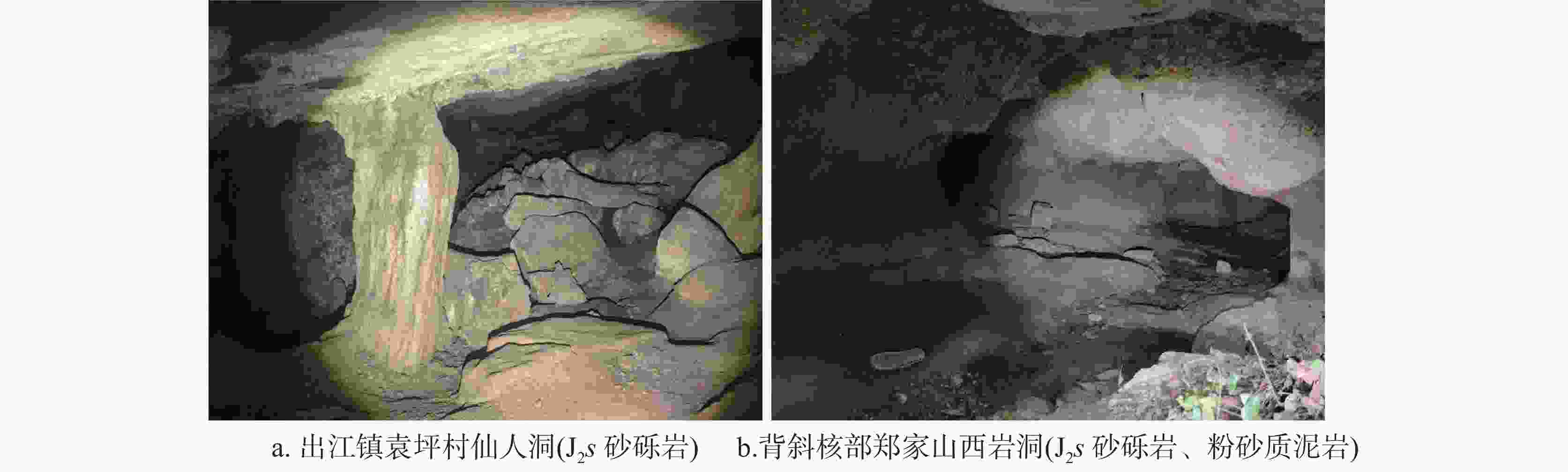 (95°∠12°)980 227 NE31° 可探延伸660 m,洞径2~15 m,洞壁为粉砂质泥岩,上部见砾岩,洞底有堆积物,洞内有水流持续流动 K11 出江镇出江河右岸 J2s含砾砂岩