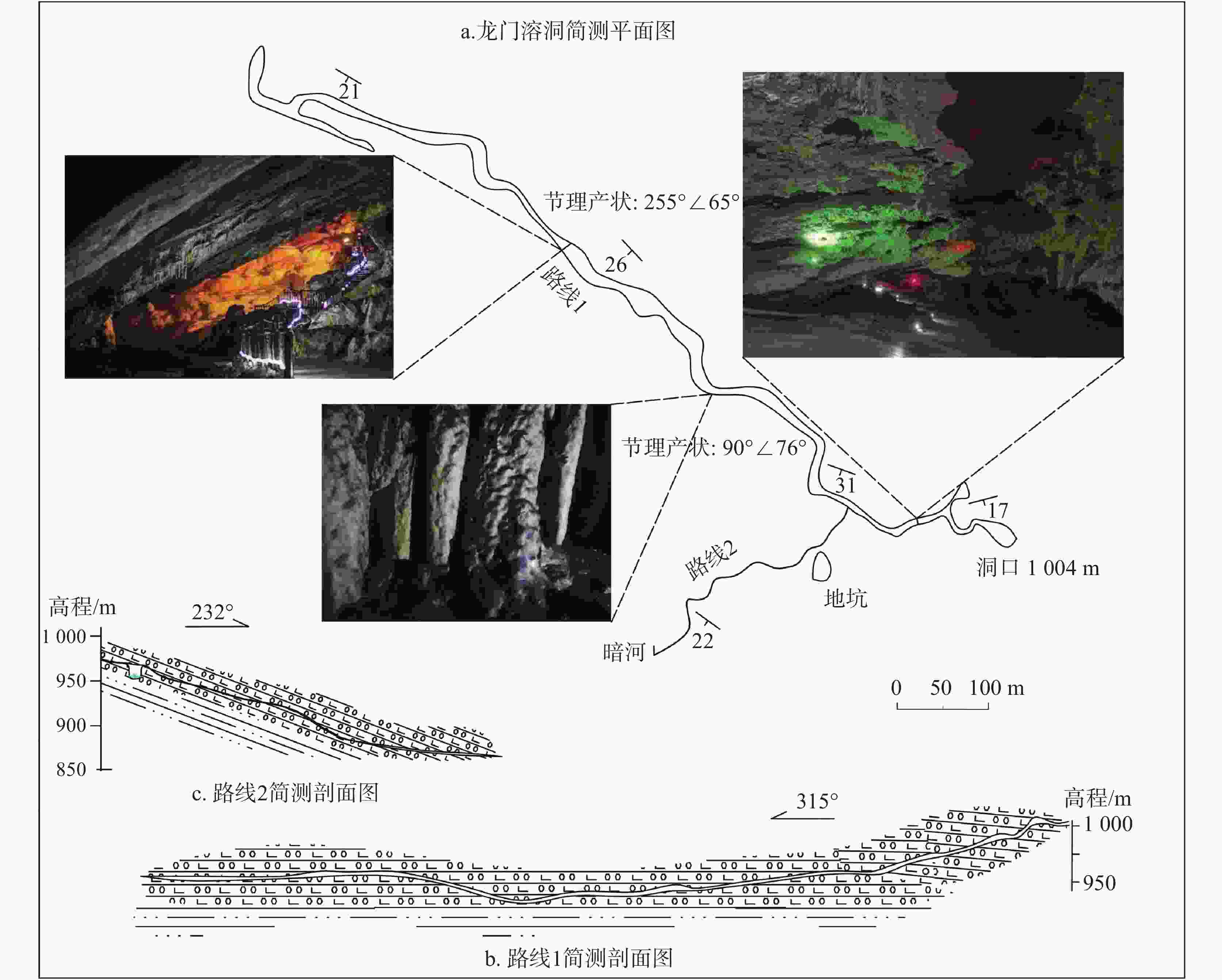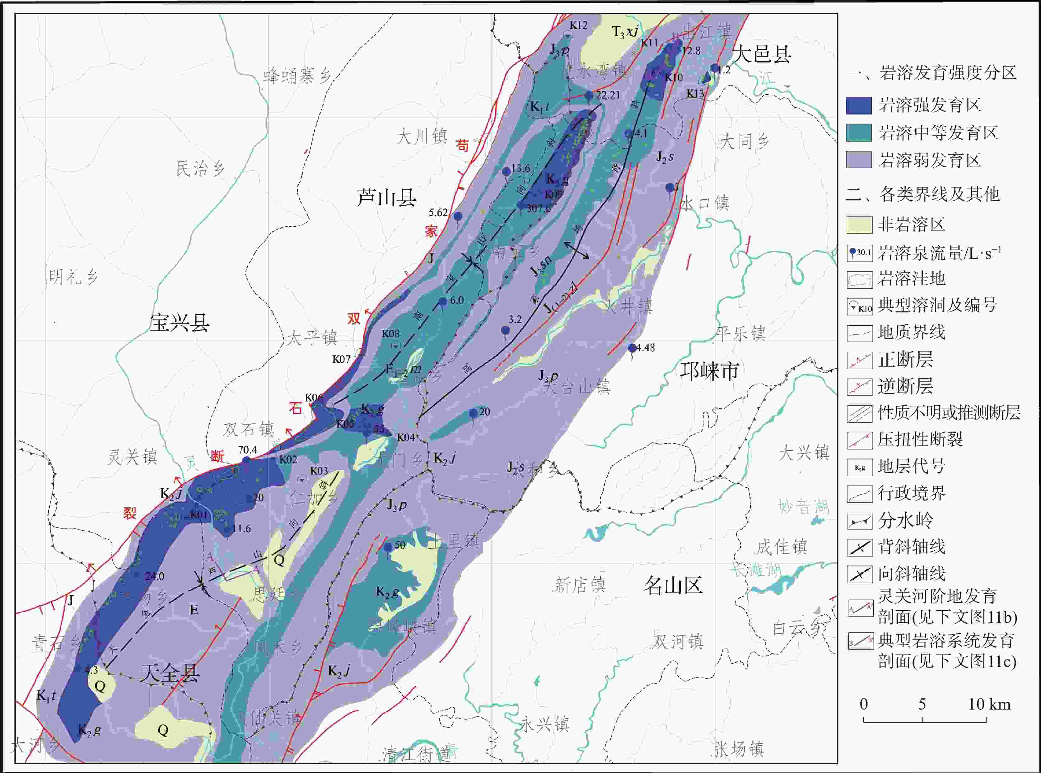 (189°∠30°)930 40 SE95° 泉水排泄口,可探延伸约80 m,洞径5~7 m,枯期流量3.8 L·s−1,丰期流量可达162 L·s−1 K04 龙门乡北东侧玉溪河右岸 K2g砾岩