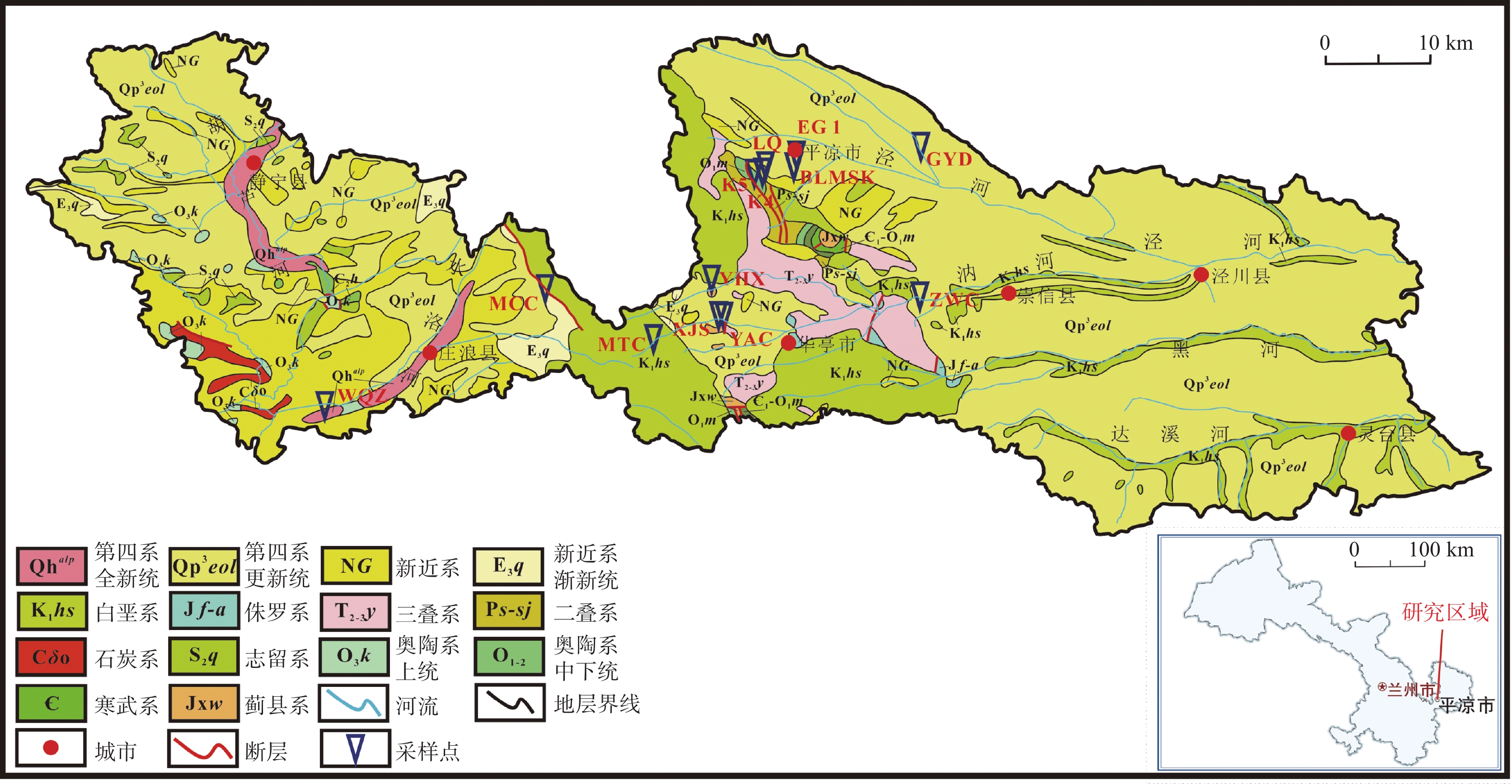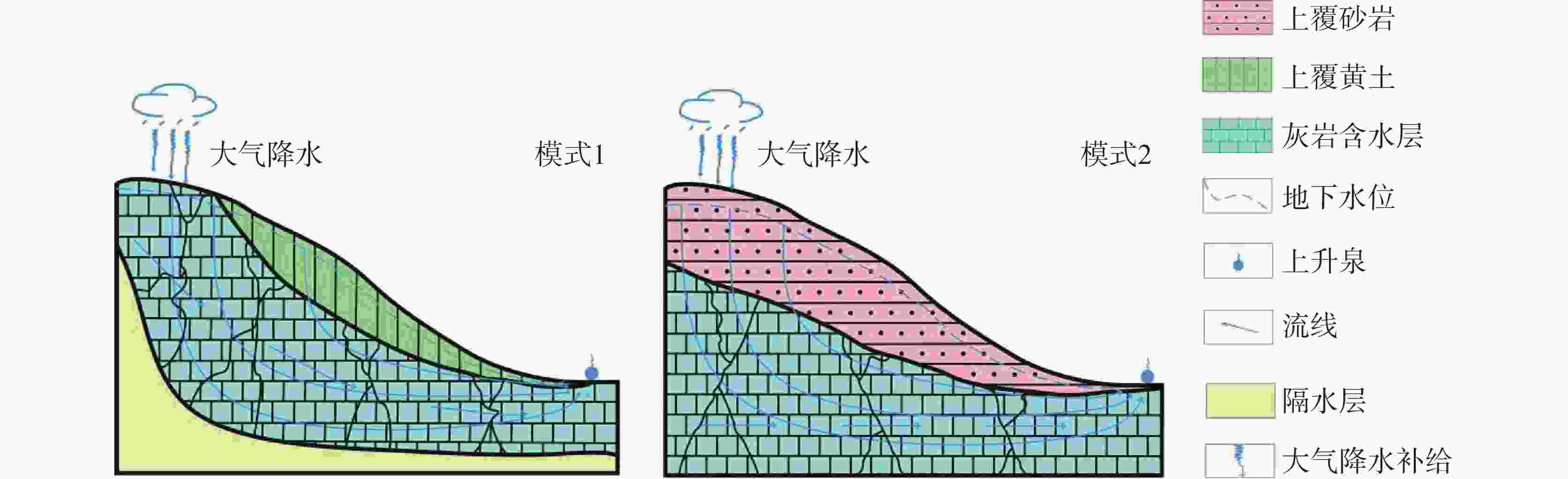 摘要: 岩溶水是平凉地区的重要水资源之一。探明岩溶水的形成机制对于该地区岩溶水资源的可持续利用、水源地保护以及环境保护措施的制定具有重要意义,为推动区域水资源的可持续发展和水环境健康提供了科学依据和理论支持。岩溶水的水化学成分可以揭示补给、径流和排泄过程,而同位素示踪方法则有助于指示岩溶水系统的范围和动态变化。因此,本研究通过水化学和同位素分析阐明了平凉地区岩溶水的成因机制。研究结果表明,该地区地下水主要可分为HCO3-Ca型和HCO3·SO4-Na型两类。Spearman相关分析和离子比例系数分析表明,白云石、方解石和蒸发盐主导了平凉岩溶水的水化学形成。水文地质条件及氢氧同位素结果进一步证实,岩溶水主要来源于大气降水补给。基于岩溶水成因模型的识别,确定平凉地区存在两种岩溶水成因模式。尽管两者均接受来自山前的大气降水补给,并通过岩溶裂隙流经上覆地层进入含水层,但由于上覆地层的差异,导致水化学特征的不同。这表明,上覆地层中矿物溶解作用是平凉岩溶水化学成分形成的主要因素。Abstract: Karst water is one of the significant water resources in the Pingliang region. Investigating the formation mechanism of karst water is crucial for the sustainable utilization of karst water resources, the protection of water sources, and the formulation of environmental protection measures in the area. It provides a scientific basis and theoretical support for promoting the sustainable development of regional water resources and the health of the water environment. The hydrochemical composition of karst water can reveal the processes of recharge, runoff, and discharge, while isotopic tracing methods help indicate the scope and dynamic changes of the karst water system. To uncover the genetic mechanism of karst water in Pingliang City, we comprehensively analyzed the hydrochemical characteristics and sources of karst water in Pingliang City using methods such as Piper trilinear diagrams, mathematical approaches, and ion ratio coefficients. The research results indicate that the groundwater in the region can be mainly divided into two types: HCO3-Ca and HCO3·SO4-Na, with Ca2+ and Na+ as the primary cations and ${\rm{HCO}}_3^{-}$ as the primary anion. The pH value ranges from 6.72 to 6.9, exhibiting weakly alkaline hydrochemical characteristics overall. The total dissolved solids (TDS) value of groundwater ranges from 158.01 mg·L−1 to