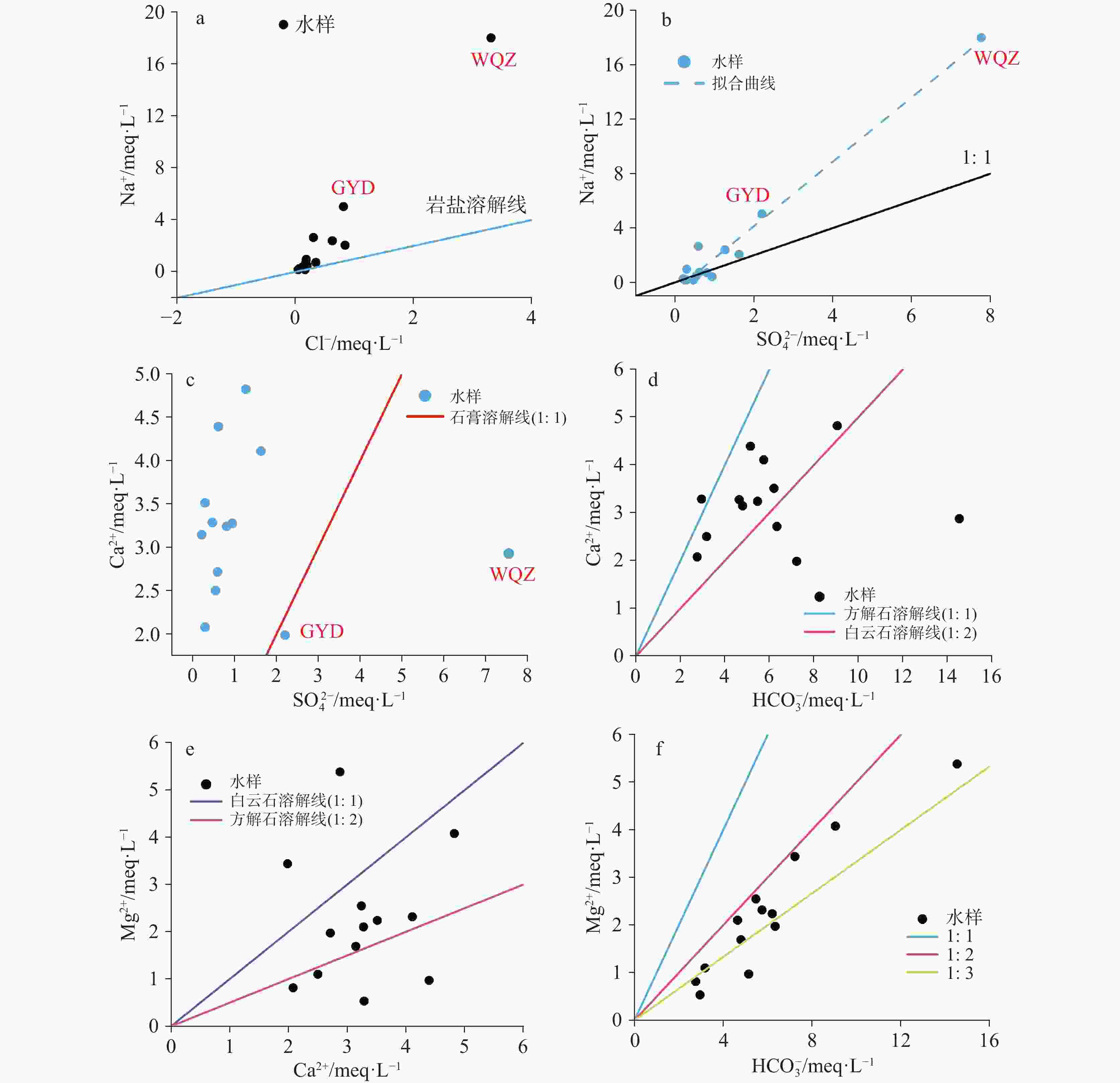 性1 Ca2+ −0.672* 1 Mg2+ −0.338 0.105 1 Na+ −0.054 −0.156 0.801** 1 K+ 0.351 −0.110 0.483 0.582* 1 Ba2+ −0.137 0.280 0.597* 0.691** 0.520 1 Si2+ −0.368 0.321 0.338 0.195 0.232 0.384 1 Cl− −0.080 −0.035 0.792** 0.984** 0.635* 0.721** 0.208 1 ${\rm{SO}}_4^{2-}$ −0.027 −0.105 0.797** 0.986** 0.642* 0.687** 0.134 0.991** 1 F− −0.271 −0.162 0.874** 0.854** 0.377 0.441 0.358 0.819** 0.819** 1 NO3- −0.107 0.107 0.660* 0.770** 0.502 0.487 0.020 0.818** 0.804** 0.686** 1 ${\rm{HCO}}_3^{-}$ −0.368 0.148 0.940** 0.906** 0.469 0.741** 0.396 0.899** 0.883** 0.868** 0.706** 1 TDS −0.183 0.015 0.876** 0.981** 0.582* 0.733** 0.257 0.984** 0.978** 0.864** 0.803** 0.960** 1 *. 在 0.05 级别(双尾),相关性显著。**. 在 0.01 级别(双尾),相关性显著。 表 3 样品水化学指示的矿物溶解饱和指数