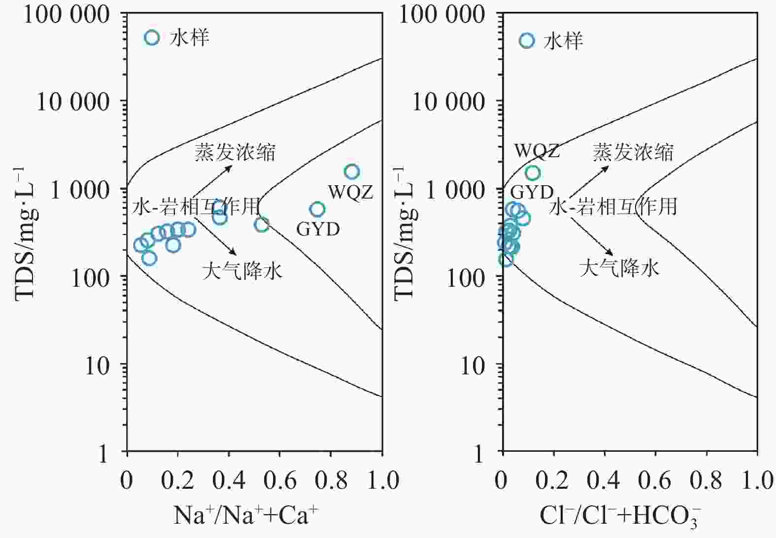 日期pH Ca2+ Mg2+ Na+ K+ Cl− ${\rm{SO}}_4^{2-}$ Ba2+ ${\rm{NO}}_3^{-}$ ${\rm{HCO}}_3^{-}$ TDS δ18OV-SMOW δDV-SMOW 水质类型 /mg·L−1 /‰ LQ 砂岩 2024.07.24 7.17 70.34 27.17 22.23 0.89 6.66 14.24 0.051 3.55 378.79 334.85 −10.43 −71.16 HCO3-Ca K4 砂岩 2024.07.24 7.68 65.63 25.56 9.35 1.47 4.76 45.28 0.043 7.69 283.41 301.60 −11.26 −73.67 HCO3-Ca K5 砂岩 2024.07.24 7.42 64.94 30.93 16.25 1.85 6.40 38.92 0.018 6.66 333.69 332.98 −10.19 −67.88 HCO3-Ca EG1 砂岩 2024.07.24 7.44 54.39 23.95 60.72 1.19 10.89 28.49 0.036 7.69 386.87 381.12 −9.59 −68.95 HCO3-Ca BLMSK 砂岩 2024.07.25 7.22 96.59 49.50 55.12 1.32 22.26 60.93 0.048 25.60 552.21 587.89 −9.16 −68.51 HCO3-Ca GYD 黄土 2024.07.25 7.58 39.81 41.77 115.47 1.39 28.97 105.78 0.013 14.61 440.85 569.09 −10.29 −75.45 HCO3·SO4-Na ZWC 砂岩 2024.07.25 7.41 82.30 28.15 47.13 2.24 29.95 78.18 0.040 20.45 350.54 464.01 −9.46 −66.32 HCO3-Ca YAC 砂岩 2024.07.26 7.46 65.88 6.48 3.97 0.48 6.00 22.59 0.012 25.61 180.39 221.37 −10.42 −70.03 HCO3-Ca XJS 砂岩 2024.07.26 7.44 63.00 20.54 5.80 0.67 2.53 10.05 0.027 2.38 293.01 251.65 −10.18 −68.25 HCO3-Ca MTC 砂岩 2024.07.26 8.20 41.64 9.90 4.10 1.32 1.83 14.19 0.029 0.95 168.13 158.01 −10.54 −67.33 HCO3-Ca YHX 砂岩 2024.07.26 8.15 50.12 13.35 11.19 2.51 7.17 26.09 0.035 14.67 194.09 222.23 −10.12 −68.41 HCO3-Ca MCC 砂岩 2024.07.26 7.39 88.00 11.79 16.63 1.26 12.38 29.40 0.042 1.48 314.09 318.05 −10.07 −68.85 HCO3-Ca WQZ 黄土 2024.07.26 7.57 57.67 65.39 413.73 2.83 117.36 372.71 0.084 45.28 886.84 1519.40 −9.24 −64.80 HCO3·SO4-Na 表 2 水化学指标Spearman相关系数矩阵